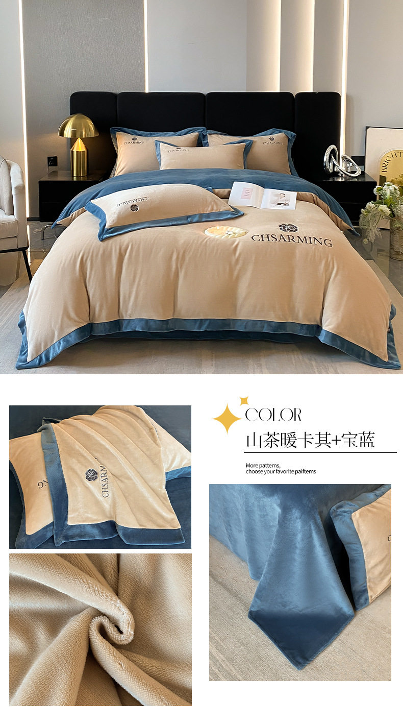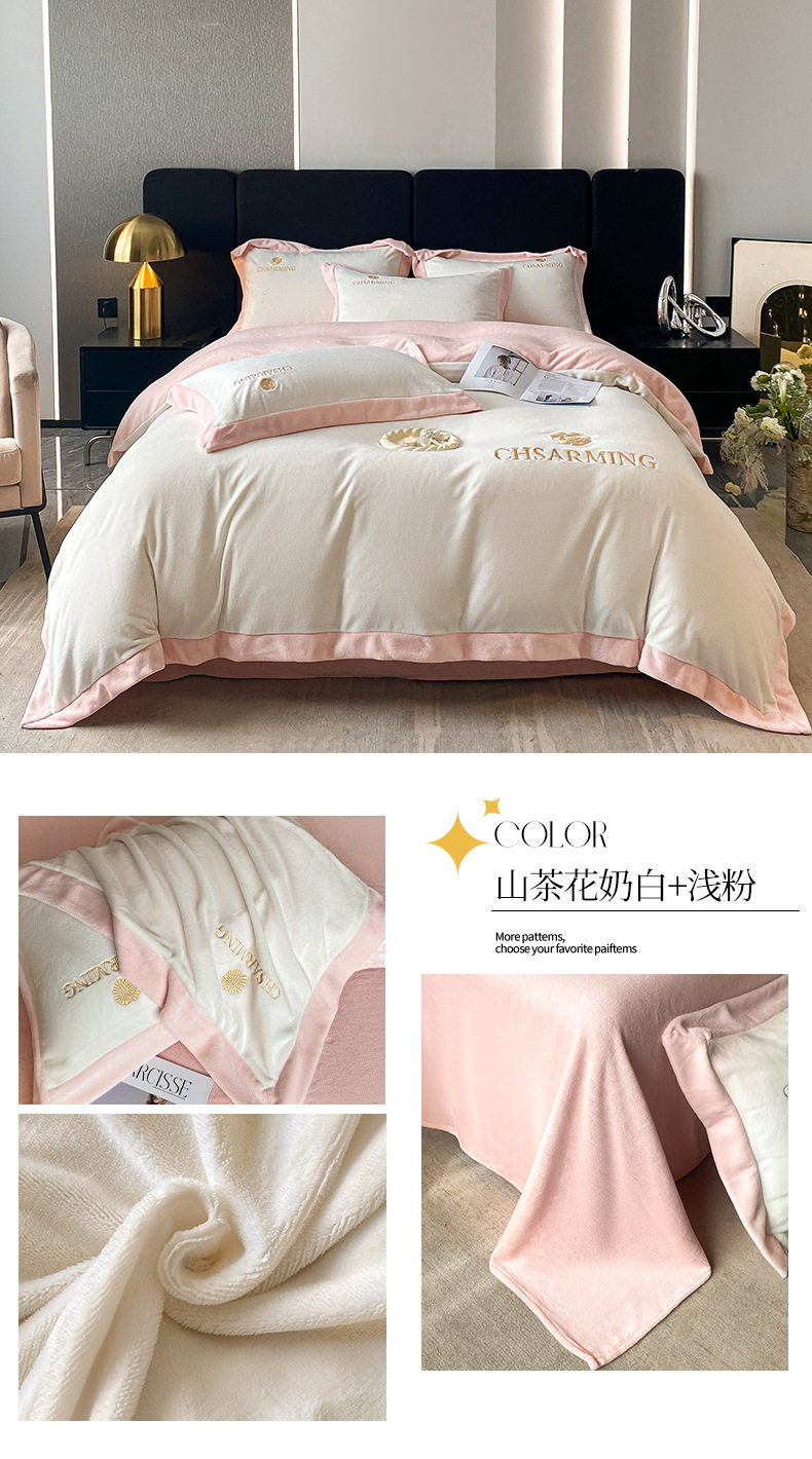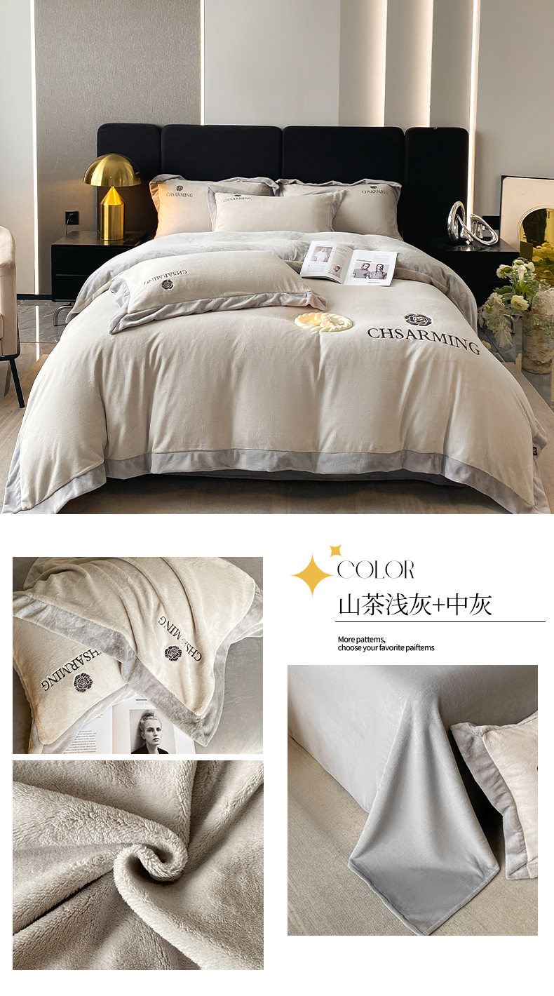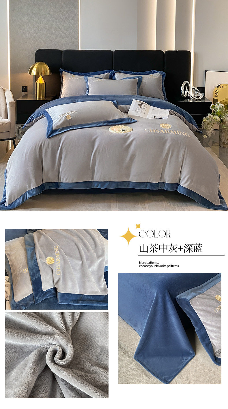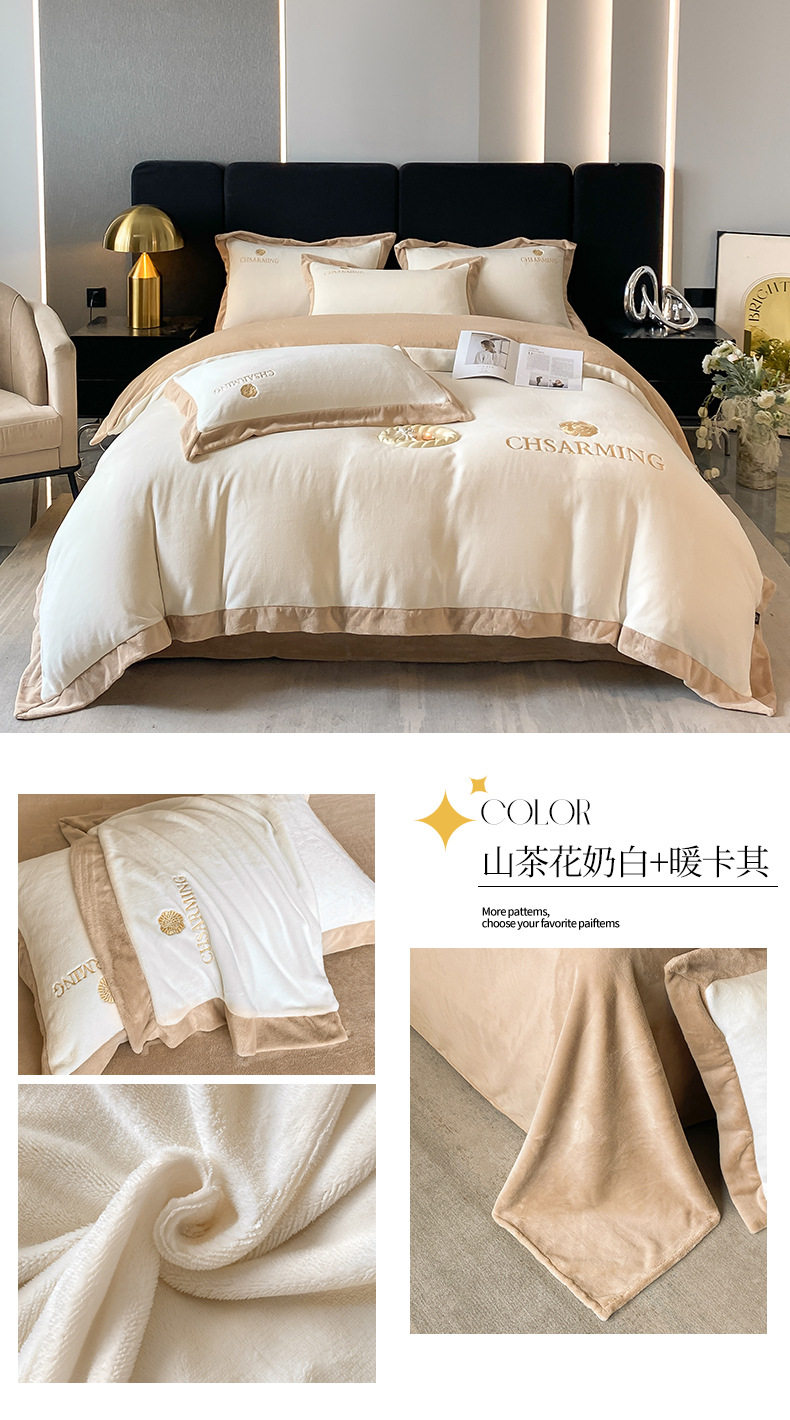 Light luxury style embroidered milk velvet bed four-piece set Winter thickened coral velvet flannel bed sheet quilt cover three-piece set