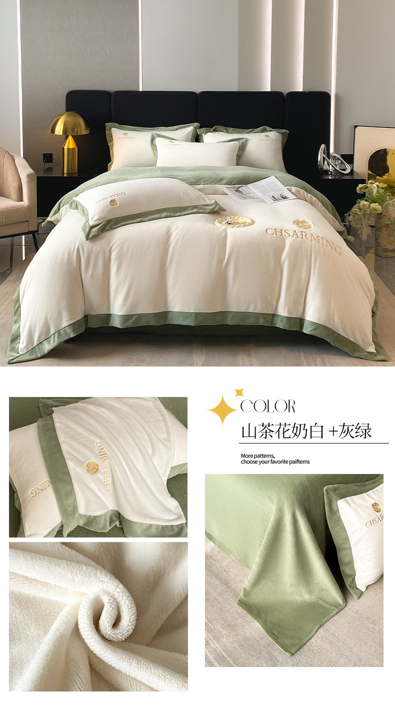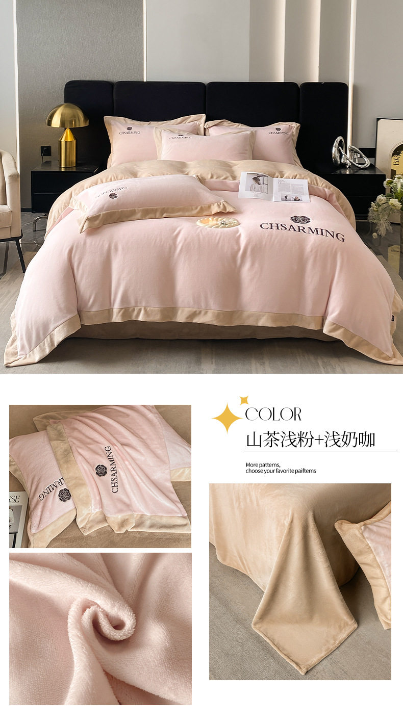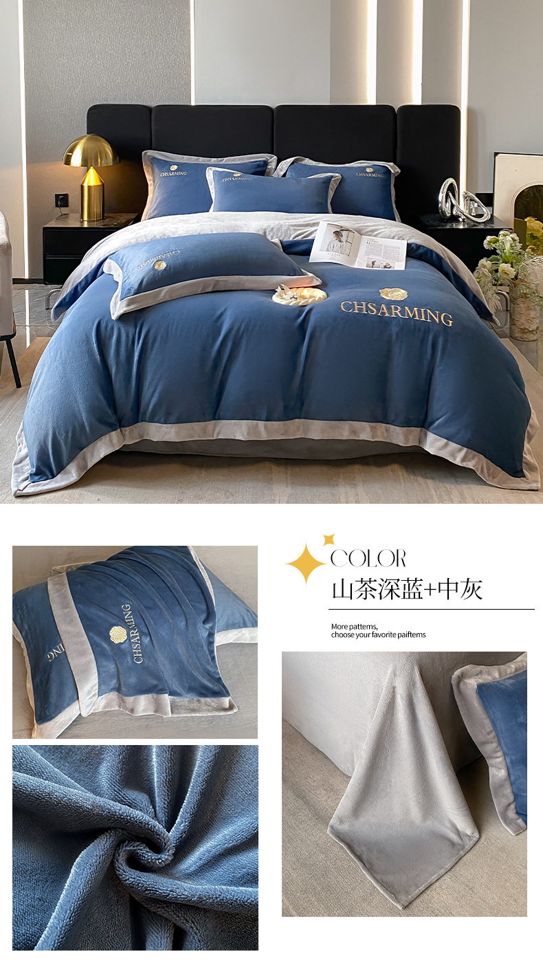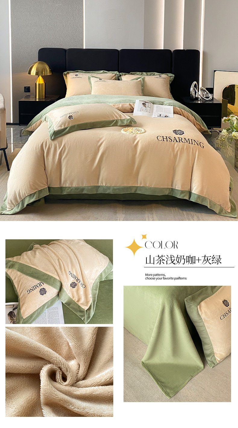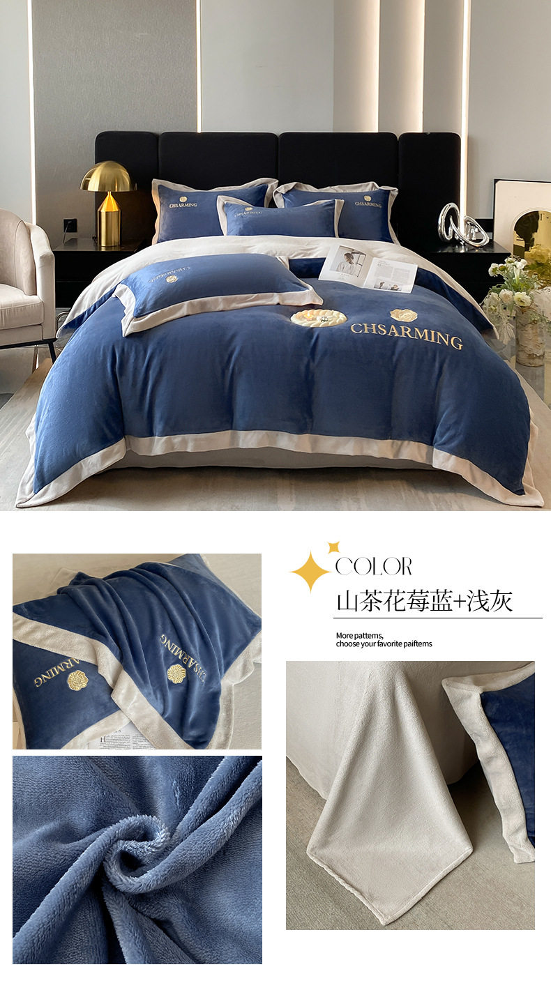Light luxury style embroidered milk velvet bed four-piece set Winter thickened coral velvet flannel bed sheet quilt cover three-piece set