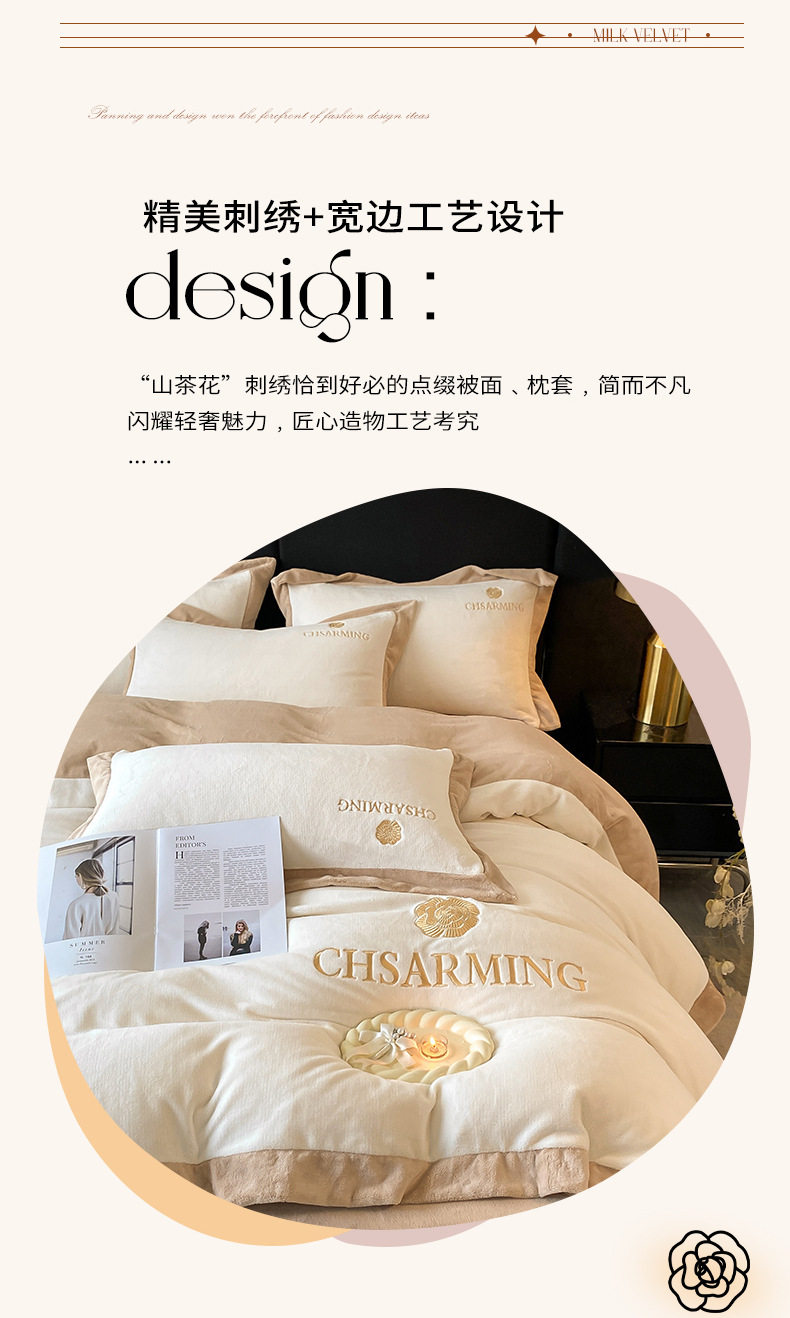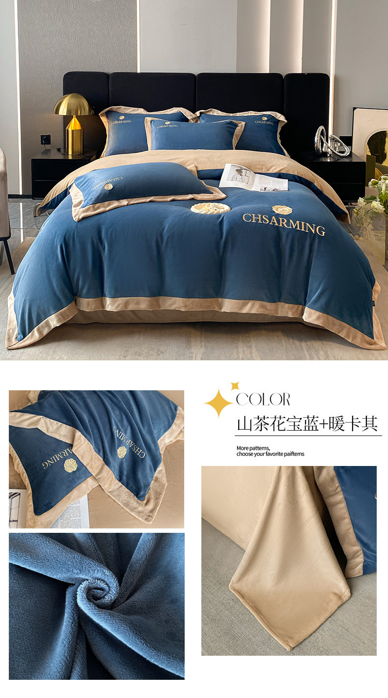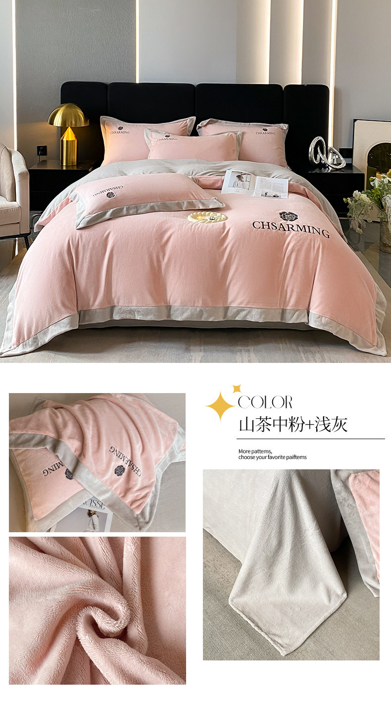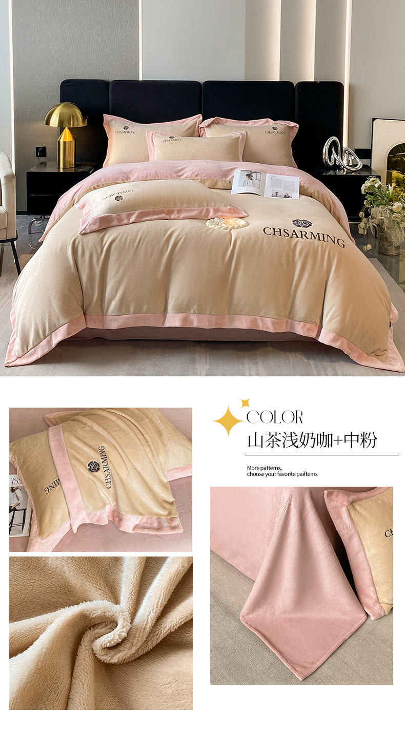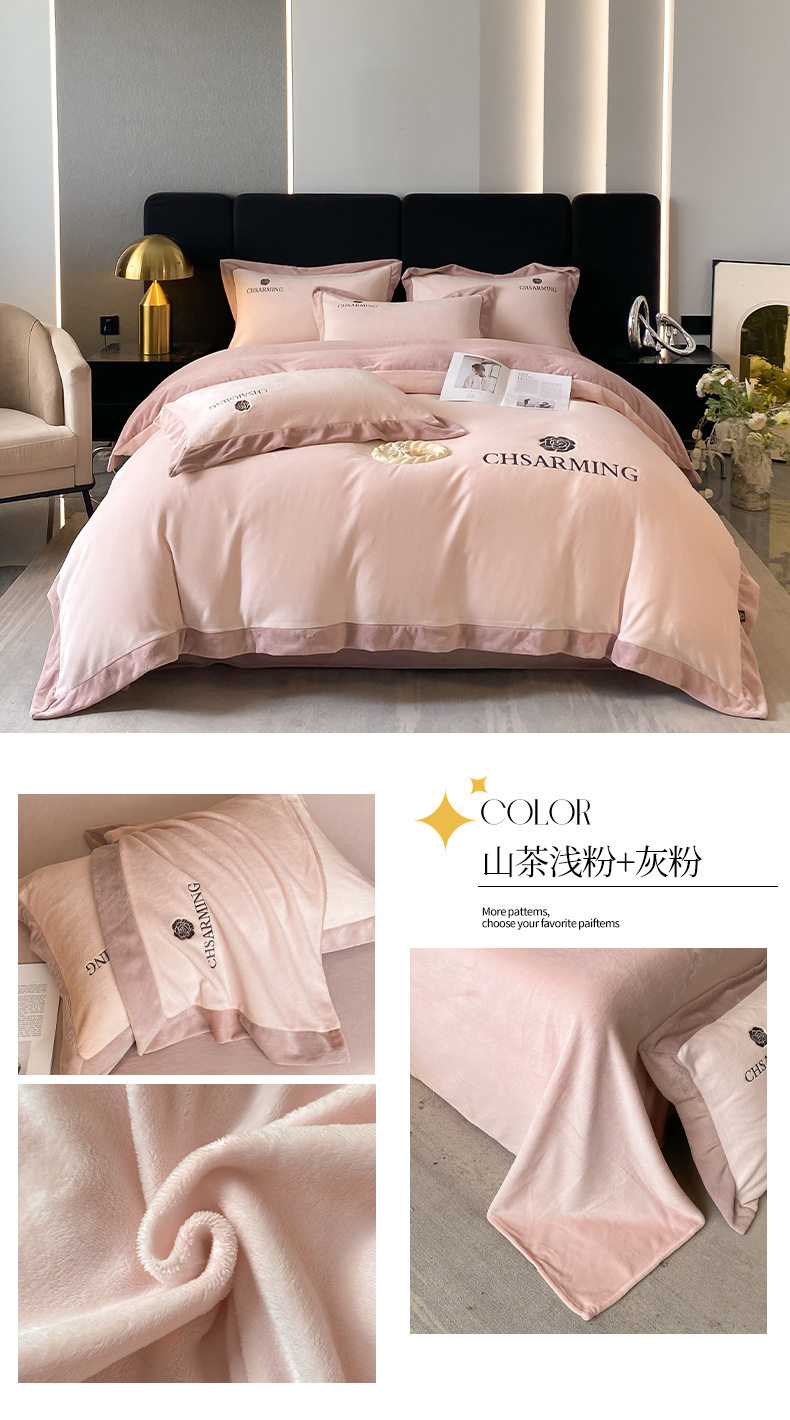 Light luxury style embroidered milk velvet bed four-piece set Winter thickened coral velvet flannel bed sheet quilt cover three-piece set