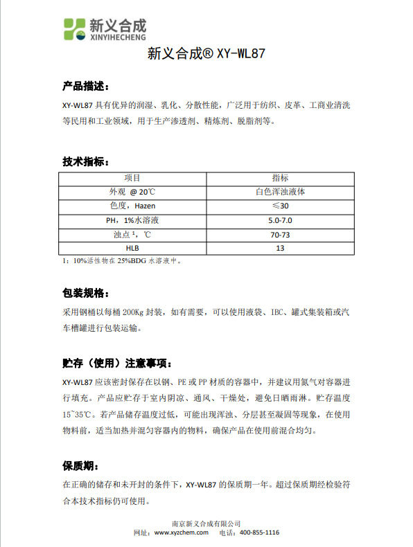 Non-ion Emulsifier WL87 Production Penetrant Refining Agent Skiming Agent for Textile Leather Workers Commercial Washing