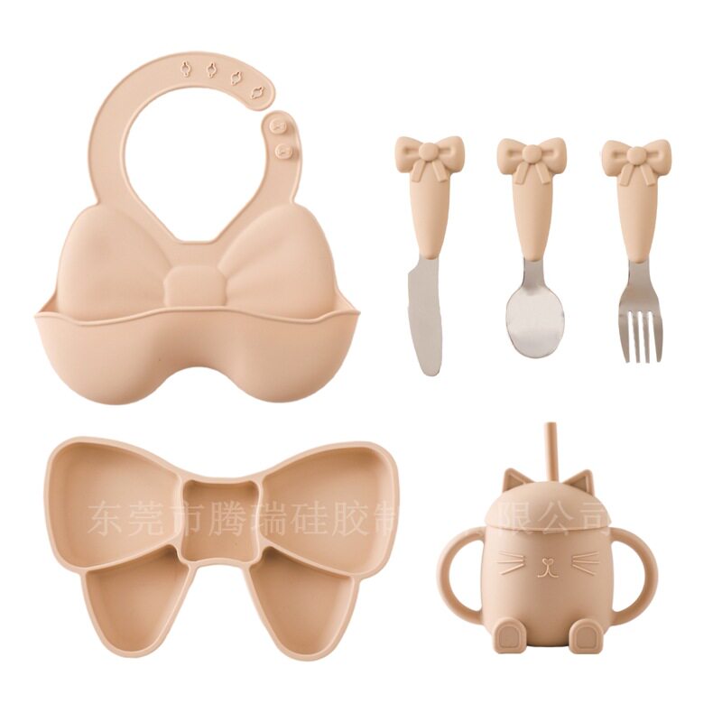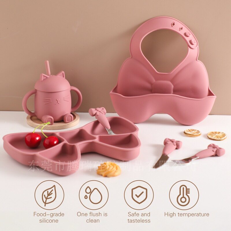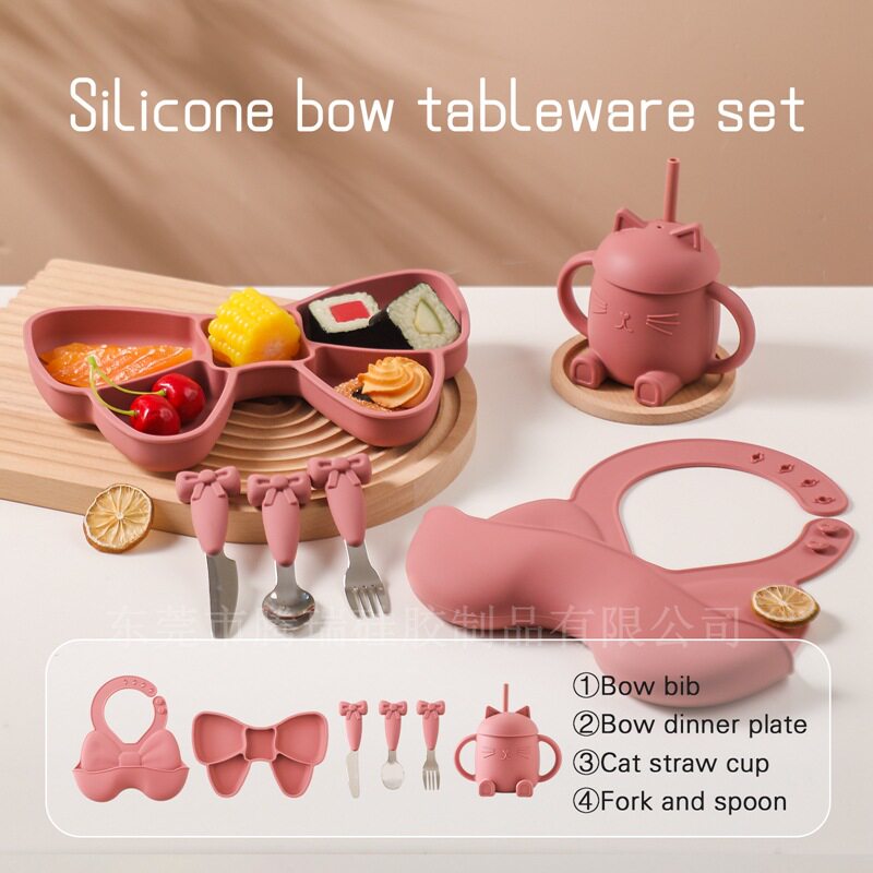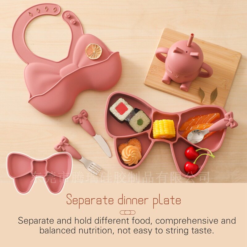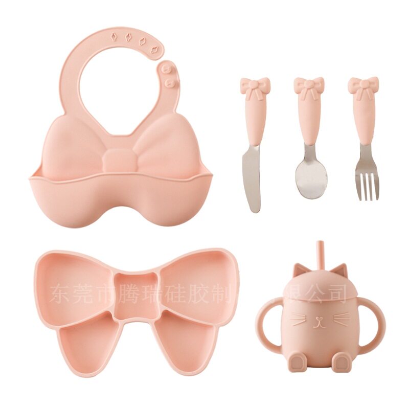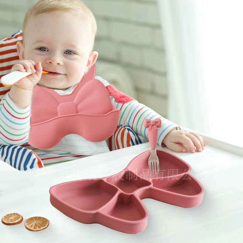 Amazon New Silicone Tableware suit Children's Supplementary Food Bow Split Plate Baby Dining Bib Fork Spoon