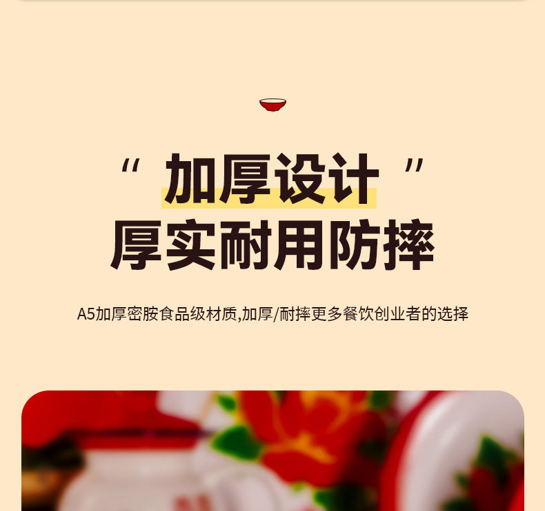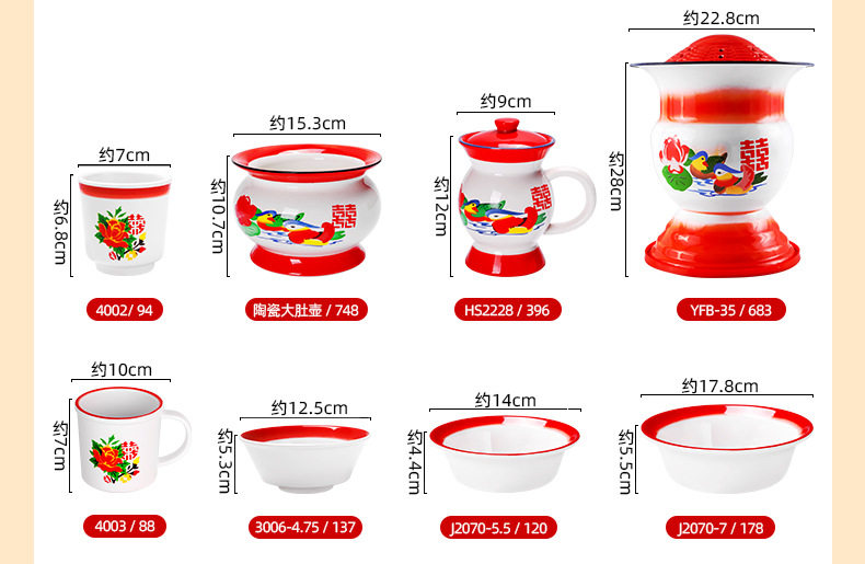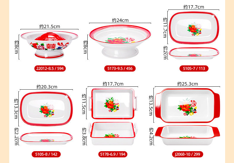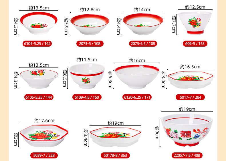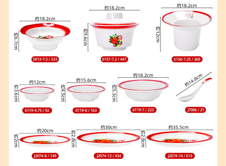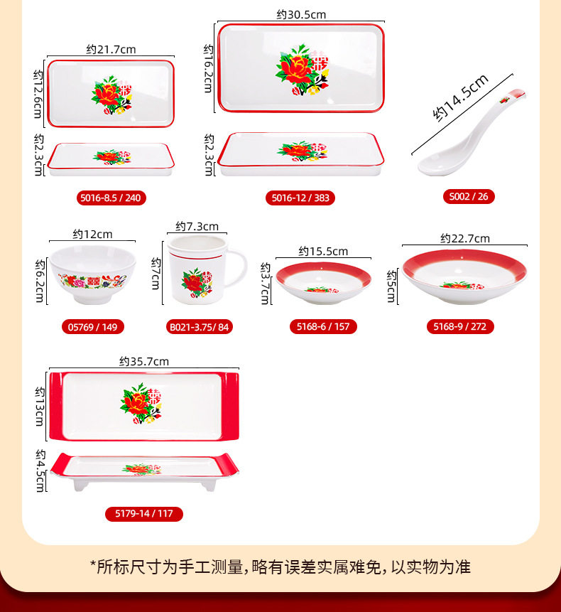 | Color | Shallow mouth table 2,Deep mouth table 1,Spoons (pack of 5),4002 water cup,Finger mold water cup 002-2.75,4003 single ear water cup,6109-4.5 small rice bowl,609-5 dessert bowl,05769 rice bowl tremella soup round bowl,6105-5.25 oil dish bowl,2073-5.5 oil dish bowl,2073-5 medium oil dish bowl,3006-4.75 rice bowl,2091-9 medium oval plate,2091-10 large oval plate,6088-7.5 duck blood brain flower bowl,5016-8.5 small long plate,5016-12 large long plate,5039-7 small hexagonal plate,5017-8 large hexagonal plate,5018-10.5 thickened duck intestine tray,5022-9 medium thickened long plate,5022-11 large thickened long plate,5026-10 crispy meat snack plate,5105-7 universal plate for vegetables,5105-8 medium vegetable plate,5167-6.5 small disc,5167-7 round flat plate,5167-8 round flat plate,5167-9 flat plate,5167-10 flat pan,5167-11 small beef plate,5167-12 medium beef plate,5167-14 large beef plate,5173-9.5 fur belly waist plate,5176-11 small hanging dragon beef plate [thickened],5176-13 large hanging dragon beef plate [thickened],5178-6.9 double-ear snack plate,5179-14 tall fat sheep cow roll three-line meat plate,6119-4.75 small universal bowl,6119-6 medium universal bowl,6119-7 large universal bowl,6156-7.25 vegetable bucket signing bucket,6120-6.25 medium bowl,6157-7.2 large tureen fried rice dessert bowl,22012-8.5 fur belly waist plate,22057-7.5 large bowl,Good things peanut sign pot [ceramic],2068-10 deep long plate,2070-5.5 small snack bowl,2070-7 brain bowl |