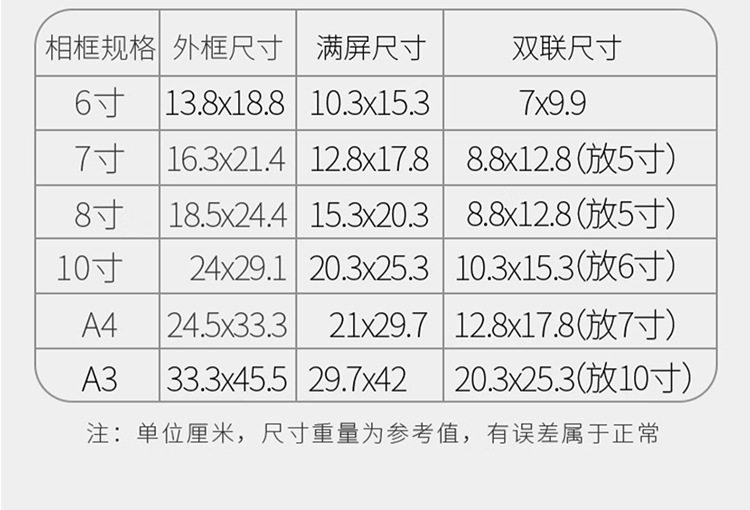 | Frame size | 5 inch [8.9*12.7cm]],6 inch "10.3x 15.3cm" HD transparent,7 inch [12.8X17.8cm] thickened panel,8 inch [15.3X20.3cm] diamond cutting,10 inch [20.3X25.3cm] horizontal and vertical pendulum,A4 [21X29.7cm] high quality accessories,A3 [29.7 X42cm] can be mounted certificate |