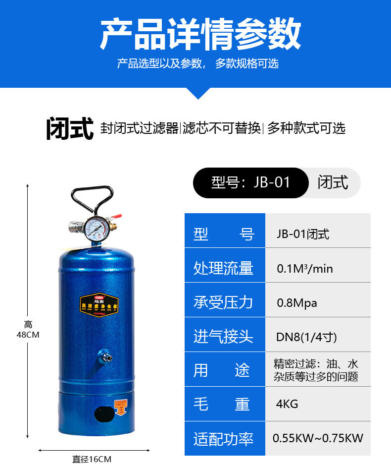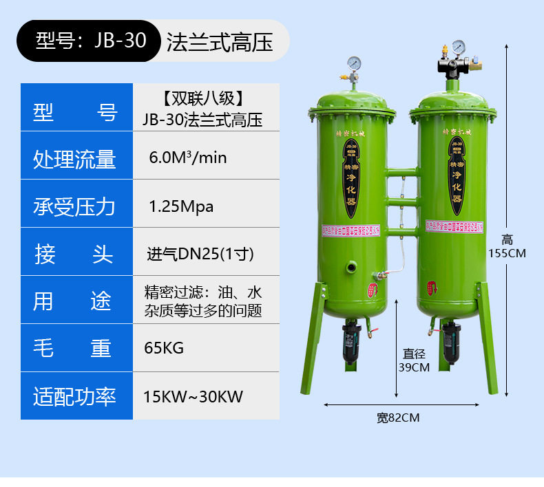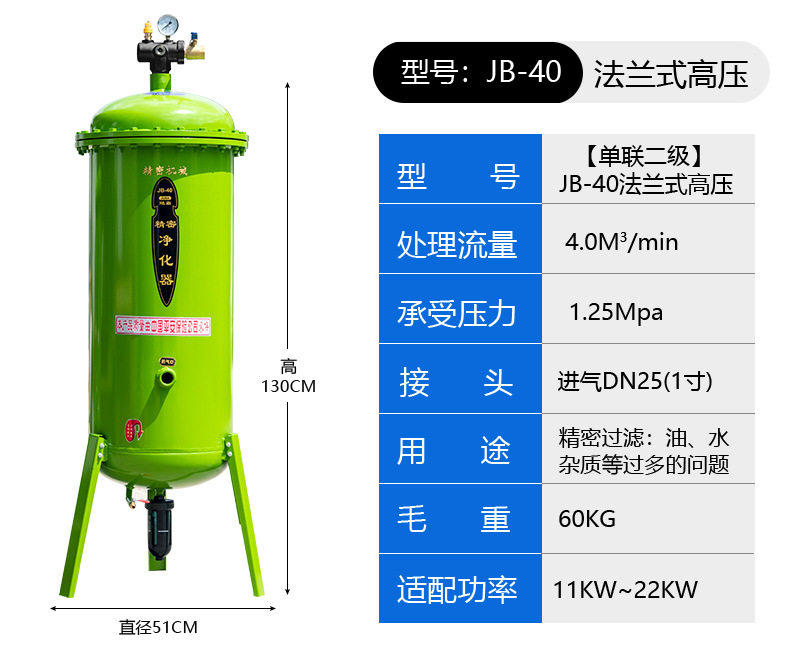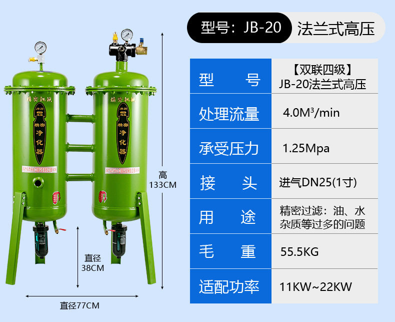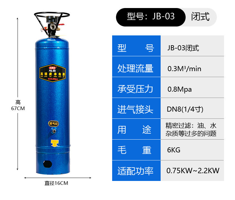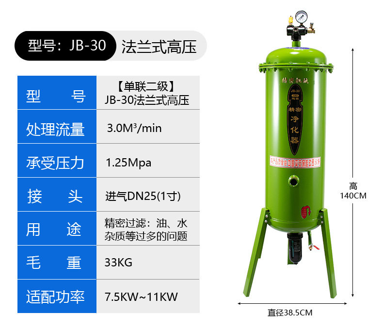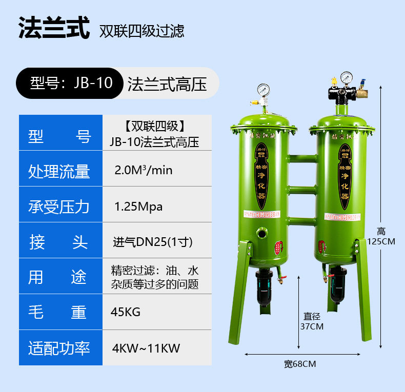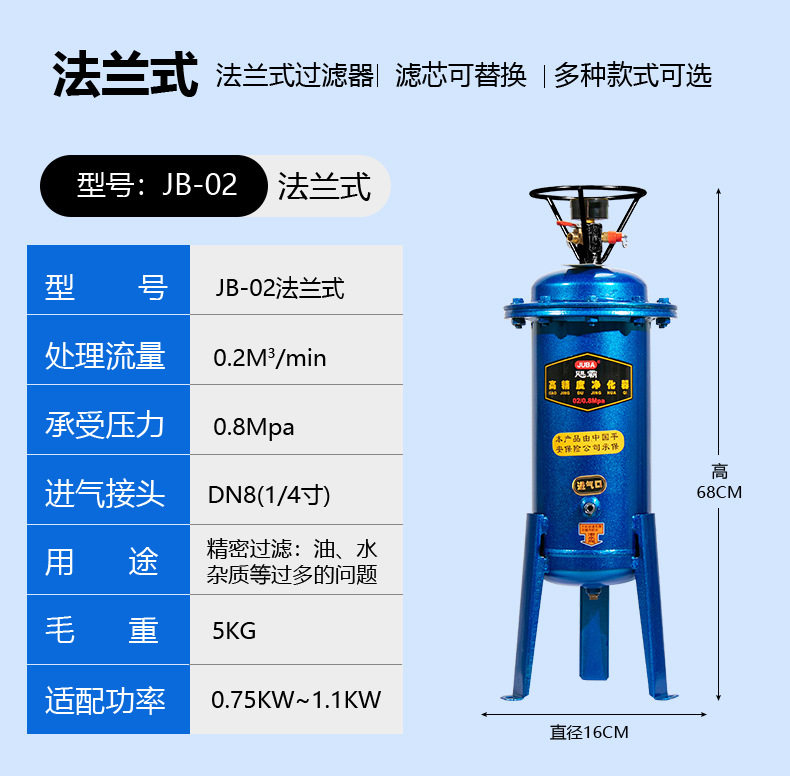 | Product specifications | Jb-01 closed type,Jb-02 closed type,Jb-02 flange type,Jb-02 flange/automatic drainage,Jb-03 closed type,Jb-03 flange type,Jb-03 flange/automatic drainage,Jb-05 flange type,Jb-05 tall flange/automatic drainage,Jb-05 tall double filtration/automatic drainage,Jb-10 flange type,Jb-10 high pressure model,Jb-10 high flange/automatic drainage,Jb-10 high pressure flange/automatic drainage,Jb-10 high leg double filtration/automatic drainage,Jb-10 high pressure dual filtration/automatic drainage,Jb-10 flange/four-level filtration,Jb-20 flange type,Jb-20 high pressure model,Jb-20 high flange/automatic drainage,Jb-20 high voltage/automatic drainage,Jb-20 high leg double filtration/automatic drainage,Jb-20 flange/four-level filtration,Jb-30 flange type,Jb-30 high pressure model,Jb-30 tall flange/automatic drainage,Jb-30 tall high pressure/automatic drainage,Jb-30 tall double filtration/automatic drainage,Jb-30 high pressure dual filtration/automatic drainage,Jb-30 flange/five-stage filtration,0.38 flange type 8 pressure [active carbon fiber filter element],0.6 flange type 8 pressure [active carbon fiber filter element],1.2 flange type 8 pressure [active carbon fiber filter element],1.2 high pressure 12.5 pressure [active carbon fiber filter element],2.5 flange type 8 pressure [active carbon fiber filter element],2.5 high pressure 12.5 pressure [activated carbon fiber filter element],3.8 flange type 8 pressure [active carbon fiber double filter element],3.8 high pressure 12.5 pressure [active carbon fiber double filter element],0.38/8 pressure with automatic drainer [active carbon fiber filter element],0.6/8 pressure with automatic drainer [active carbon fiber filter element],1.2/8 pressure belt luxury automatic drainer [active carbon fiber filter element],1.2/12.5 pressed luxury automatic drainer [active carbon fiber filter element],2.5/8 pressure belt luxury automatic drainer [active carbon fiber filter element],2.5/12.5 pressure luxury automatic drainer [active carbon fiber filter element],3.8/8 pressure belt luxury automatic drainer [active carbon fiber double filter element],3.8/12.5 pressure belt luxury automatic drainer [active carbon fiber double filter element],G2 [2 cubic meters- 16kg ] filter,G3 [3 cubic meters- 30kg ] filter,G6 [6 cubic meters- 30kg ] filter,Jb-03 flange/extended filter element,Jb-05 flange/extended filter element,Jb-05 flange extended filter element/automatic drainage,Jb-10 flange/extended filter element,Jb-10 high pressure model/extended filter element,Jb-20 flange/extended filter element,Jb-20 high pressure model/extended filter element,Jb-30 flange/extended filter element,Jb-30 high pressure model/extended filter element,Jb-10 single line second,Jb-20 single line second,Jb-30 single line second,Jb-40 single line second,Jb-03 double level 3,Jb-05 double level 3,Jb-10 double level 4,Jb-20 double level 4,Jb-30 double level eight |