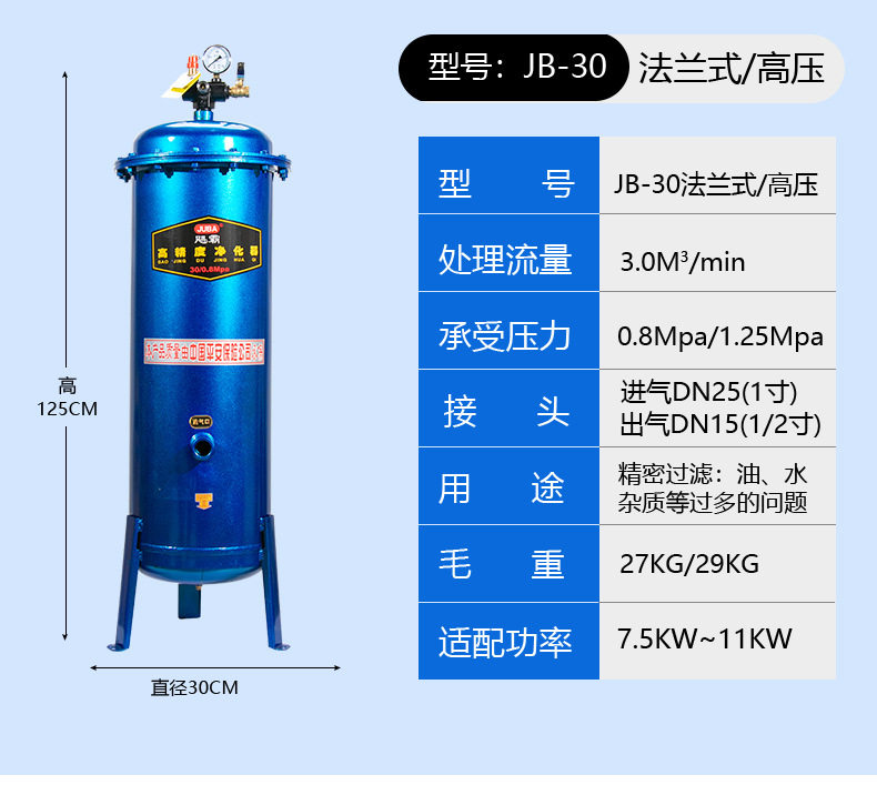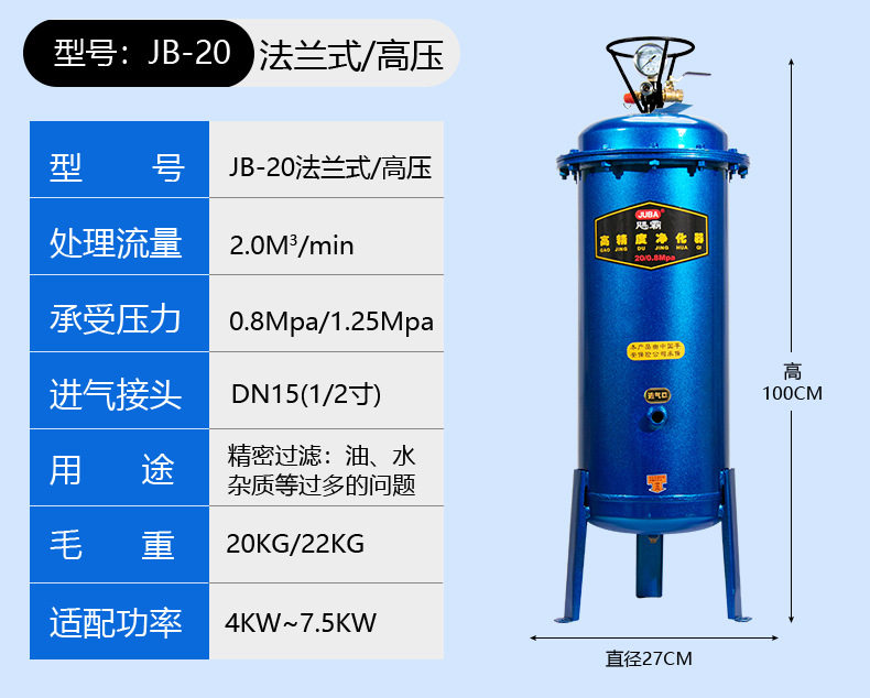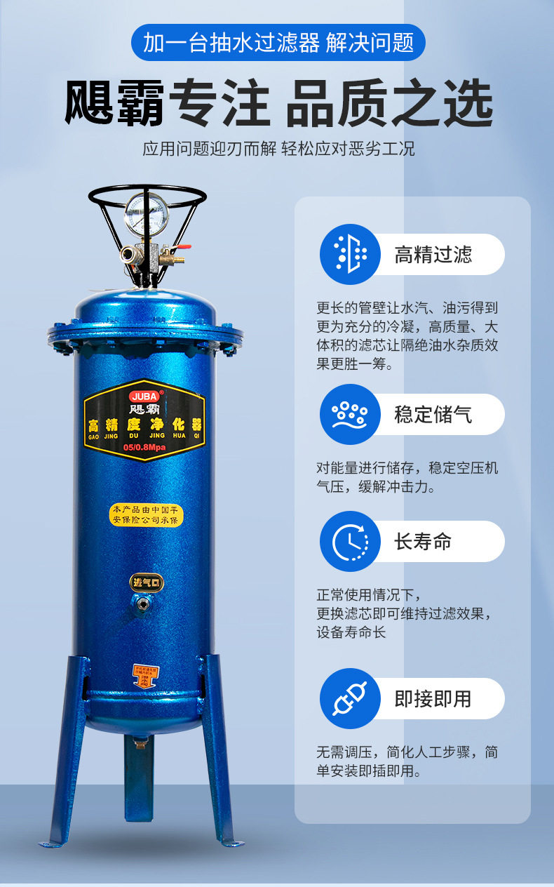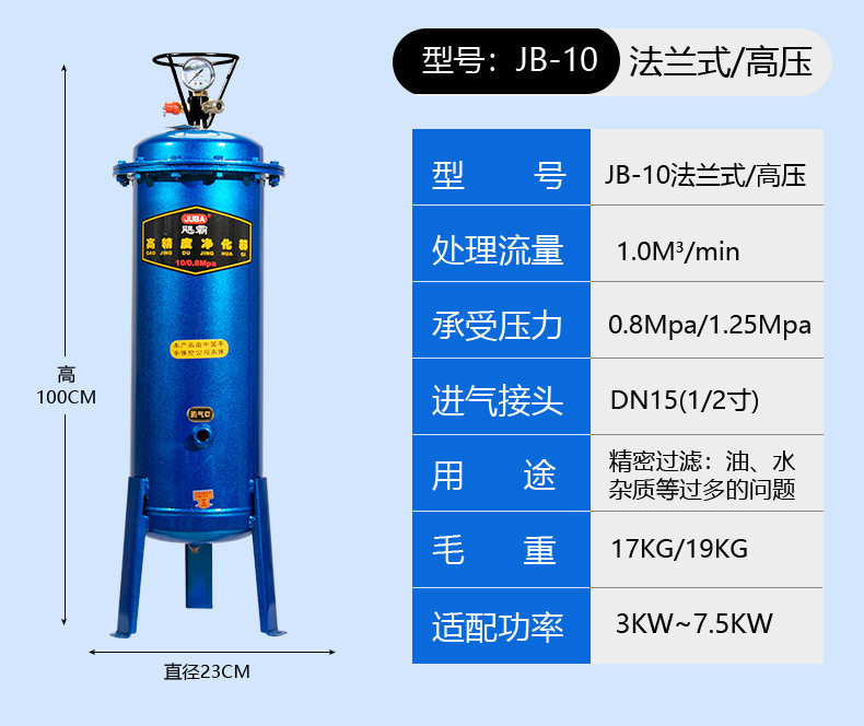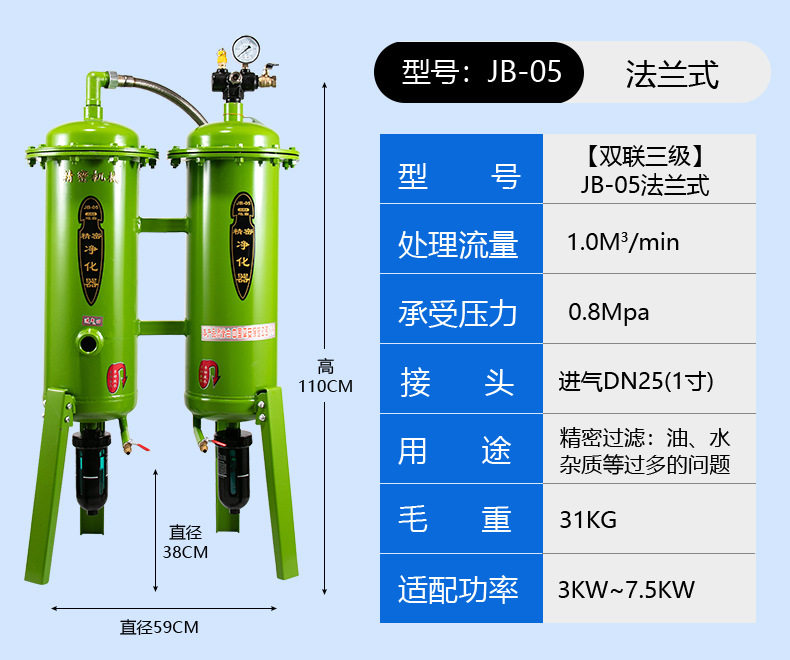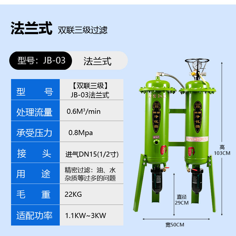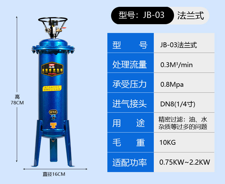 | Product specifications | Jb-01 closed type,Jb-02 closed type,Jb-02 flange type,Jb-02 flange/automatic drainage,Jb-03 closed type,Jb-03 flange type,Jb-03 flange/automatic drainage,Jb-05 flange type,Jb-05 tall flange/automatic drainage,Jb-05 tall double filtration/automatic drainage,Jb-10 flange type,Jb-10 high pressure model,Jb-10 high flange/automatic drainage,Jb-10 high pressure flange/automatic drainage,Jb-10 high leg double filtration/automatic drainage,Jb-10 high pressure dual filtration/automatic drainage,Jb-10 flange/four-level filtration,Jb-20 flange type,Jb-20 high pressure model,Jb-20 high flange/automatic drainage,Jb-20 high voltage/automatic drainage,Jb-20 high leg double filtration/automatic drainage,Jb-20 flange/four-level filtration,Jb-30 flange type,Jb-30 high pressure model,Jb-30 tall flange/automatic drainage,Jb-30 tall high pressure/automatic drainage,Jb-30 tall double filtration/automatic drainage,Jb-30 high pressure dual filtration/automatic drainage,Jb-30 flange/five-stage filtration,0.38 flange type 8 pressure [active carbon fiber filter element],0.6 flange type 8 pressure [active carbon fiber filter element],1.2 flange type 8 pressure [active carbon fiber filter element],1.2 high pressure 12.5 pressure [active carbon fiber filter element],2.5 flange type 8 pressure [active carbon fiber filter element],2.5 high pressure 12.5 pressure [activated carbon fiber filter element],3.8 flange type 8 pressure [active carbon fiber double filter element],3.8 high pressure 12.5 pressure [active carbon fiber double filter element],0.38/8 pressure with automatic drainer [active carbon fiber filter element],0.6/8 pressure with automatic drainer [active carbon fiber filter element],1.2/8 pressure belt luxury automatic drainer [active carbon fiber filter element],1.2/12.5 pressed luxury automatic drainer [active carbon fiber filter element],2.5/8 pressure belt luxury automatic drainer [active carbon fiber filter element],2.5/12.5 pressure luxury automatic drainer [active carbon fiber filter element],3.8/8 pressure belt luxury automatic drainer [active carbon fiber double filter element],3.8/12.5 pressure belt luxury automatic drainer [active carbon fiber double filter element],G2 [2 cubic meters- 16kg ] filter,G3 [3 cubic meters- 30kg ] filter,G6 [6 cubic meters- 30kg ] filter,Jb-03 flange/extended filter element,Jb-05 flange/extended filter element,Jb-05 flange extended filter element/automatic drainage,Jb-10 flange/extended filter element,Jb-10 high pressure model/extended filter element,Jb-20 flange/extended filter element,Jb-20 high pressure model/extended filter element,Jb-30 flange/extended filter element,Jb-30 high pressure model/extended filter element,Jb-10 single line second,Jb-20 single line second,Jb-30 single line second,Jb-40 single line second,Jb-03 double level 3,Jb-05 double level 3,Jb-10 double level 4,Jb-20 double level 4,Jb-30 double level eight |