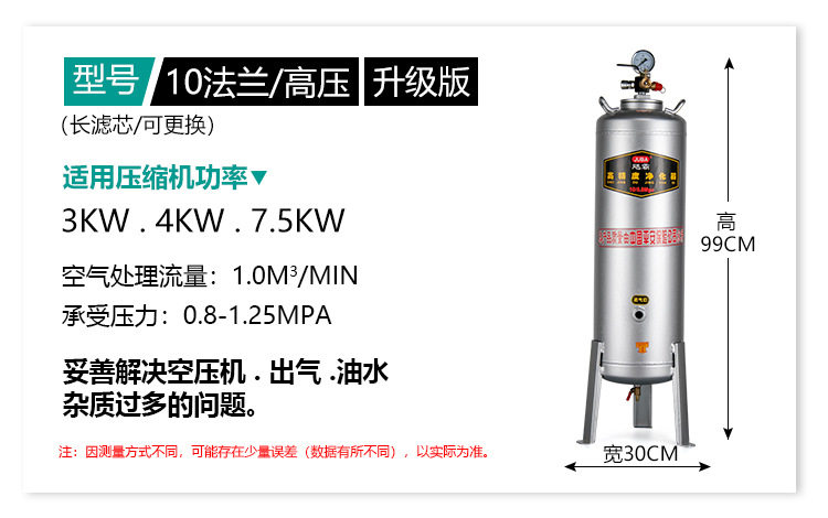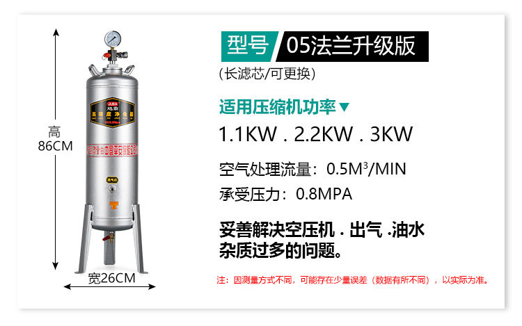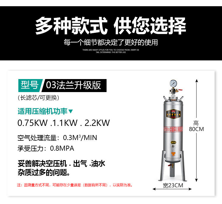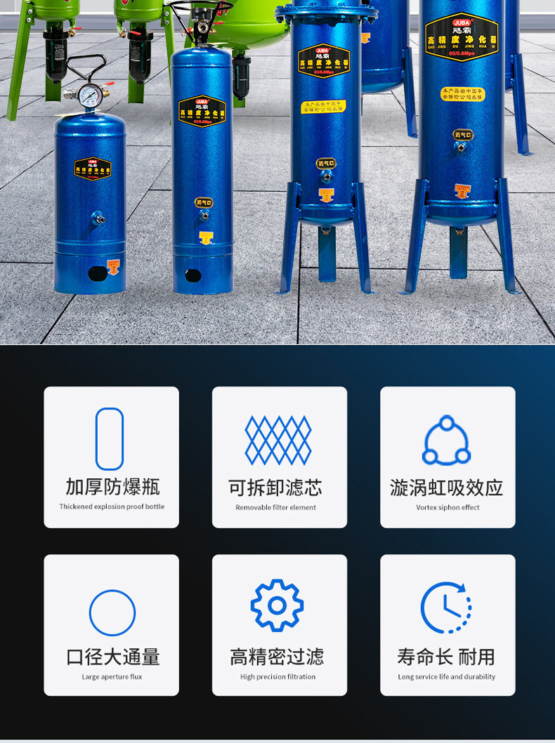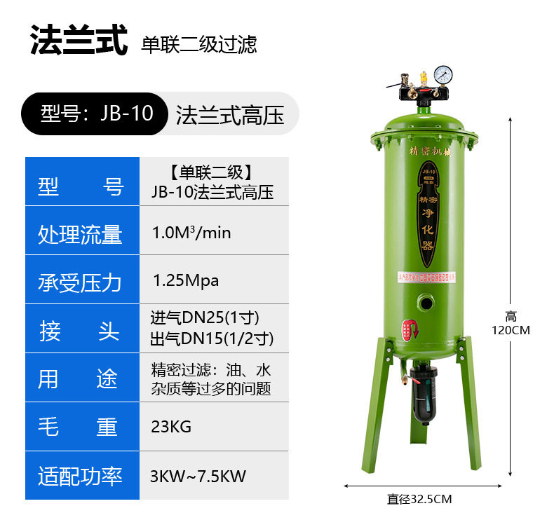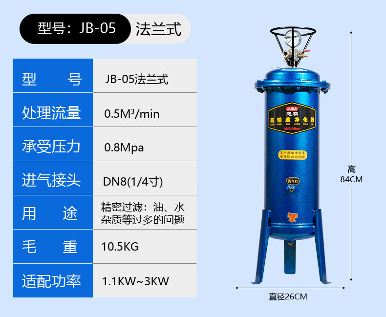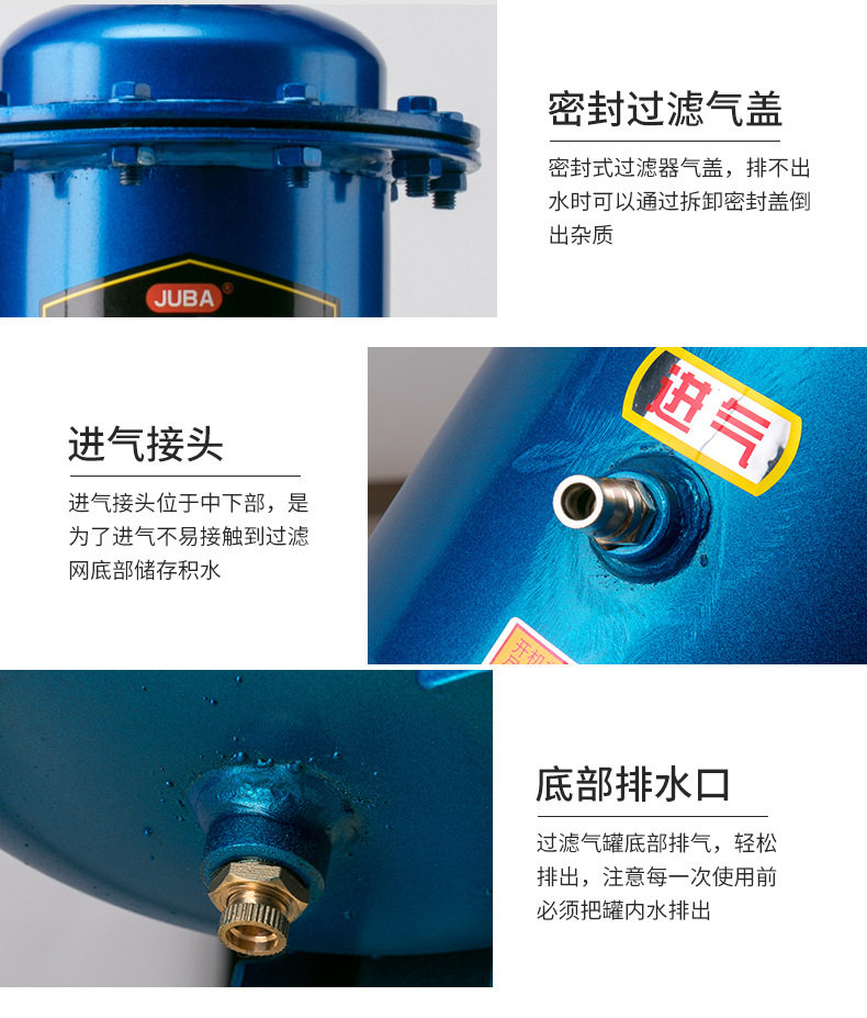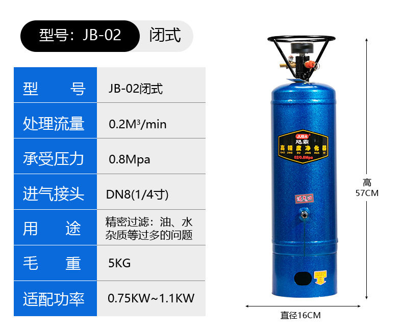 | Product specifications | Jb-01 closed type,Jb-02 closed type,Jb-02 flange type,Jb-02 flange/automatic drainage,Jb-03 closed type,Jb-03 flange type,Jb-03 flange/automatic drainage,Jb-05 flange type,Jb-05 tall flange/automatic drainage,Jb-05 tall double filtration/automatic drainage,Jb-10 flange type,Jb-10 high pressure model,Jb-10 high flange/automatic drainage,Jb-10 high pressure flange/automatic drainage,Jb-10 high leg double filtration/automatic drainage,Jb-10 high pressure dual filtration/automatic drainage,Jb-10 flange/four-level filtration,Jb-20 flange type,Jb-20 high pressure model,Jb-20 high flange/automatic drainage,Jb-20 high voltage/automatic drainage,Jb-20 high leg double filtration/automatic drainage,Jb-20 flange/four-level filtration,Jb-30 flange type,Jb-30 high pressure model,Jb-30 tall flange/automatic drainage,Jb-30 tall high pressure/automatic drainage,Jb-30 tall double filtration/automatic drainage,Jb-30 high pressure dual filtration/automatic drainage,Jb-30 flange/five-stage filtration,0.38 flange type 8 pressure [active carbon fiber filter element],0.6 flange type 8 pressure [active carbon fiber filter element],1.2 flange type 8 pressure [active carbon fiber filter element],1.2 high pressure 12.5 pressure [active carbon fiber filter element],2.5 flange type 8 pressure [active carbon fiber filter element],2.5 high pressure 12.5 pressure [activated carbon fiber filter element],3.8 flange type 8 pressure [active carbon fiber double filter element],3.8 high pressure 12.5 pressure [active carbon fiber double filter element],0.38/8 pressure with automatic drainer [active carbon fiber filter element],0.6/8 pressure with automatic drainer [active carbon fiber filter element],1.2/8 pressure belt luxury automatic drainer [active carbon fiber filter element],1.2/12.5 pressed luxury automatic drainer [active carbon fiber filter element],2.5/8 pressure belt luxury automatic drainer [active carbon fiber filter element],2.5/12.5 pressure luxury automatic drainer [active carbon fiber filter element],3.8/8 pressure belt luxury automatic drainer [active carbon fiber double filter element],3.8/12.5 pressure belt luxury automatic drainer [active carbon fiber double filter element],G2 [2 cubic meters- 16kg ] filter,G3 [3 cubic meters- 30kg ] filter,G6 [6 cubic meters- 30kg ] filter,Jb-03 flange/extended filter element,Jb-05 flange/extended filter element,Jb-05 flange extended filter element/automatic drainage,Jb-10 flange/extended filter element,Jb-10 high pressure model/extended filter element,Jb-20 flange/extended filter element,Jb-20 high pressure model/extended filter element,Jb-30 flange/extended filter element,Jb-30 high pressure model/extended filter element,Jb-10 single line second,Jb-20 single line second,Jb-30 single line second,Jb-40 single line second,Jb-03 double level 3,Jb-05 double level 3,Jb-10 double level 4,Jb-20 double level 4,Jb-30 double level eight |