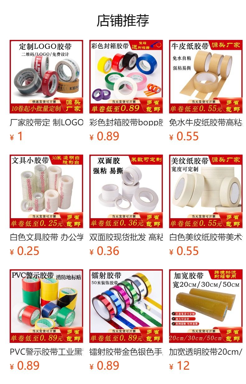 | Specifications | Wide 1.8cm * thick 1.6cm * long 100(272 rolls/box) narrow tape,Wide 2.4cm * thick 1.6cm * long 100(208 rolls/box) narrow tape,Wide 3.6cm * thick 1.6cm * long 100(144 rolls/box) narrow tape,Width 4.5cm * thick 1.6cm * long 100(112 rolls/box),Width 4.8cm * thick 1.6cm * long 100(96 rolls/box),Width 5.5cm * thick 1.6cm * long 100(80 rolls/box),Width 6.0cm * thick 1.6cm * long 100(80 rolls/box),Wide 1.0cm * thick 1.6cm * long 100(496 rolls/box) narrow tape,Wide 1.2cm * thick 1.6cm * long 100(400 rolls/box) narrow tape,Wide 1.5cm * thick 1.6cm * long 100(320 rolls/box) narrow tape |