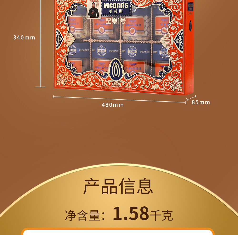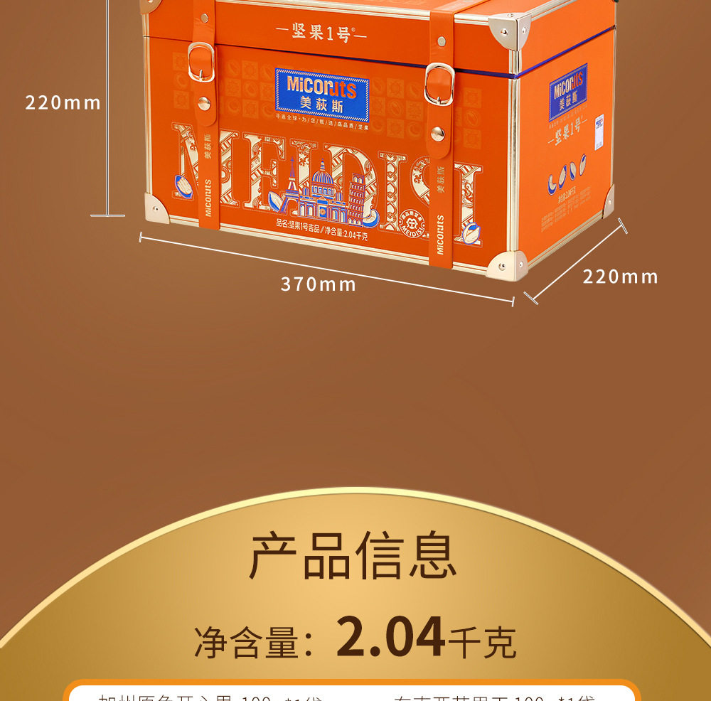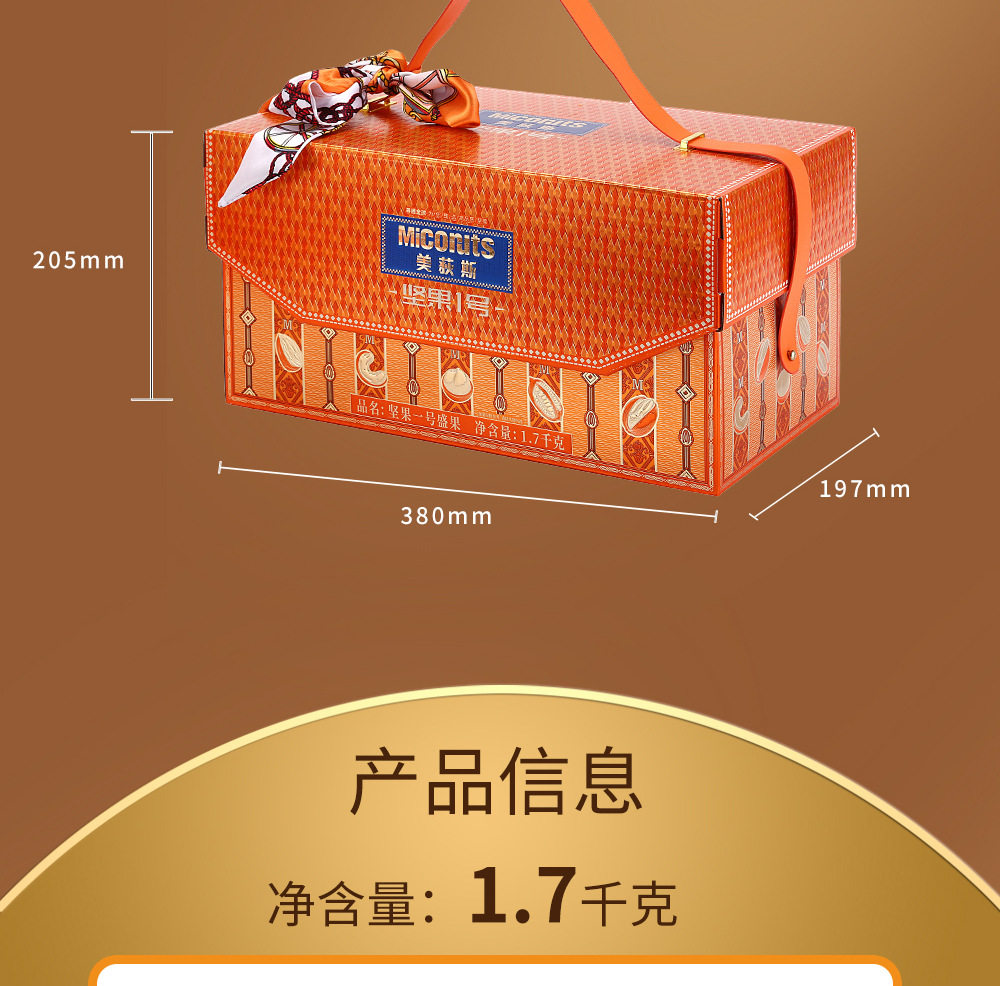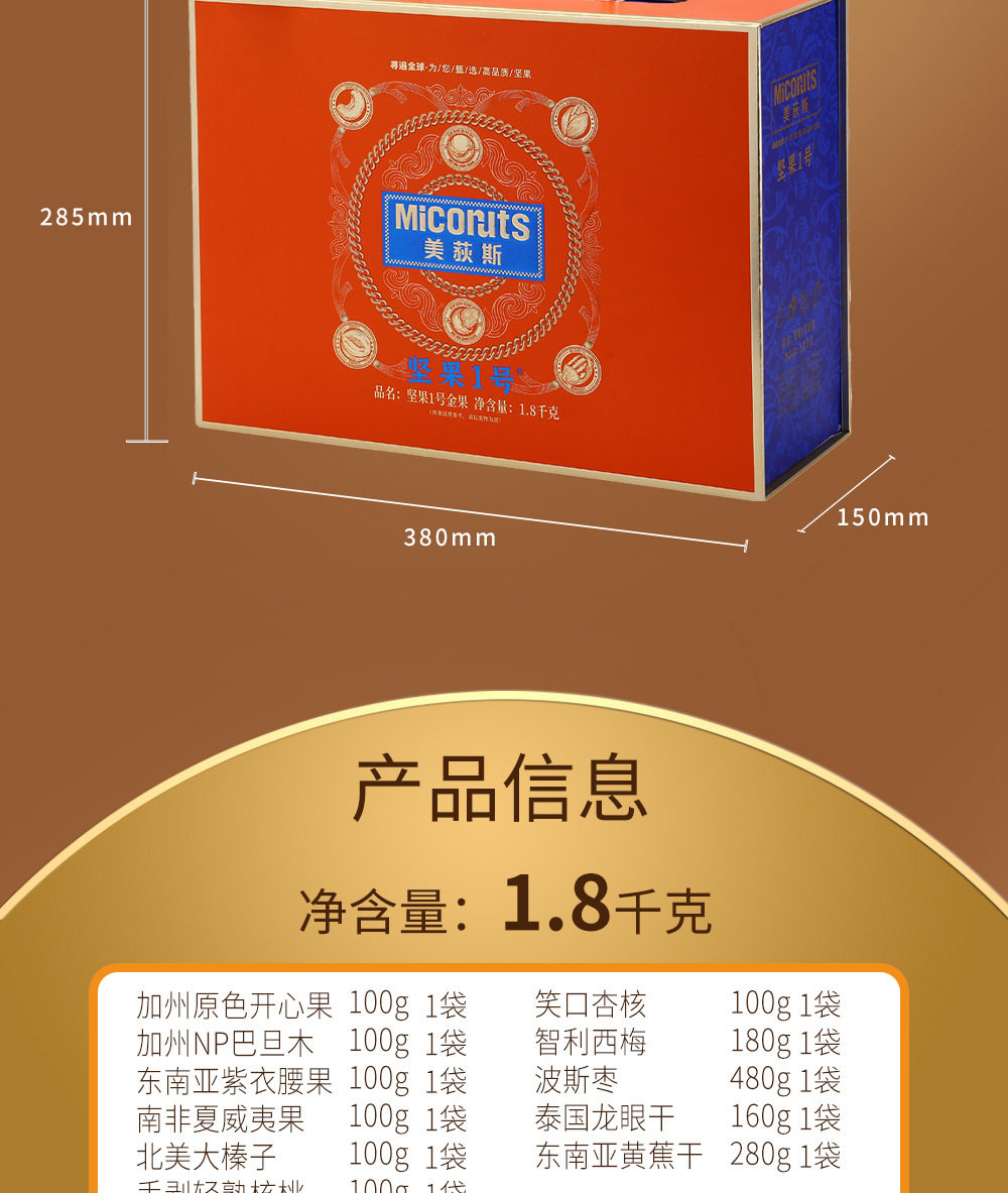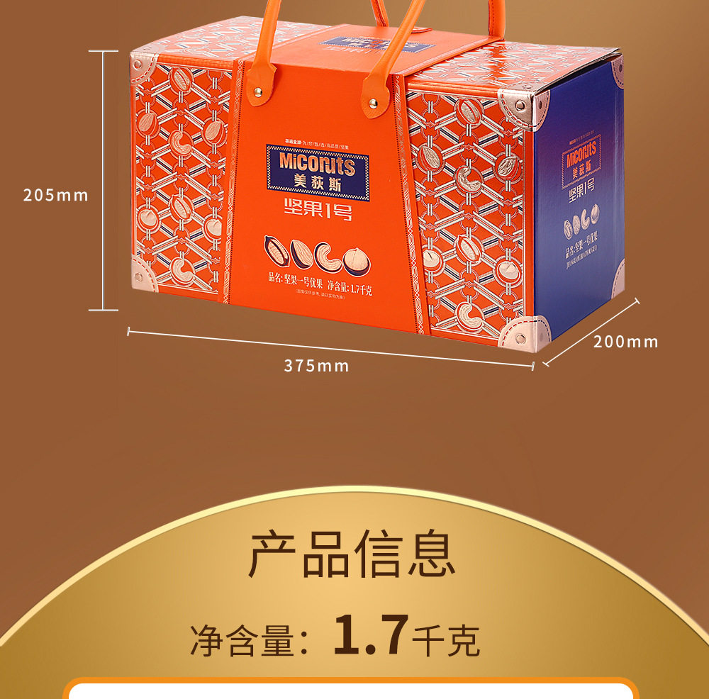 | Packaging specifications | Golden horse songfu 1600g,Nut no. 1 yueguo 1600g,Nut no. 1 fruit 1500g,Nut no. 1 zhen fruit 1000g,Nut no. 1 youguo 1700g,Global selection·fuguo 1600,Nuts no. 1 shengguo 1700g,Nut no. 1 golden fruit 1800g,Nut no. 1 premium 2020g,Nut no. 1 fortune 1360g,Nuts no. 1 premium 1580g,Nut no. 1 jipin 2040g,Nuts no. 1 premium 2000g,Nut no. 1 tea 2140g,Nut no. 1 premium 2220g,Nut no. 1 premium 1900g |
