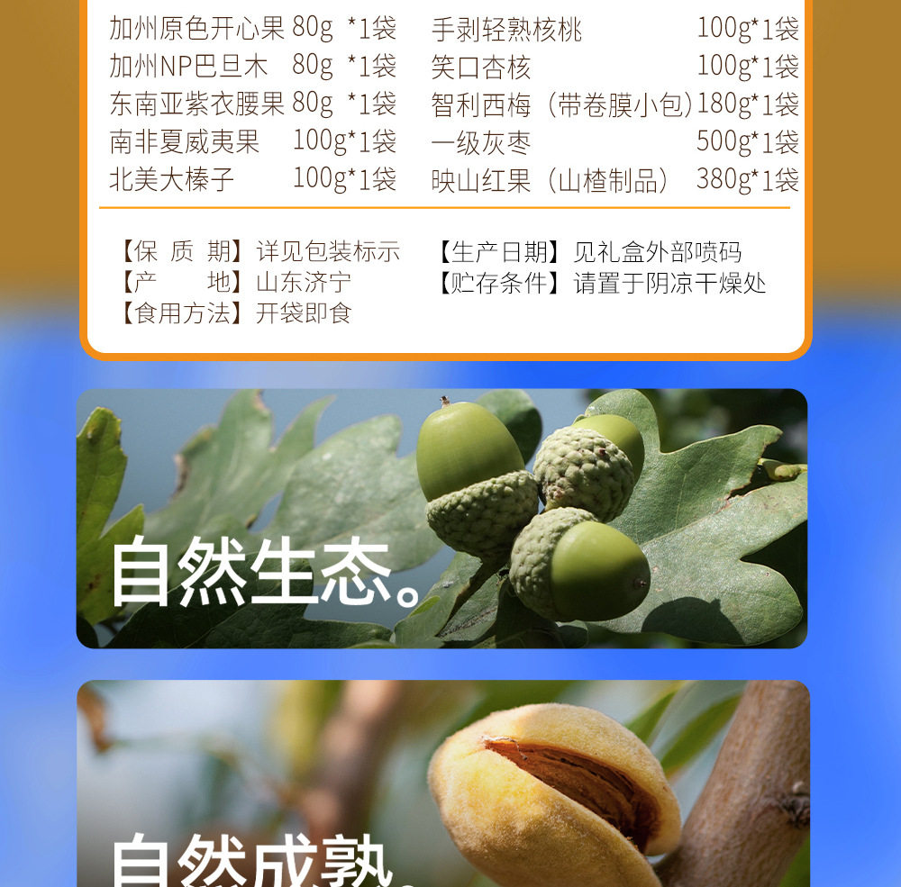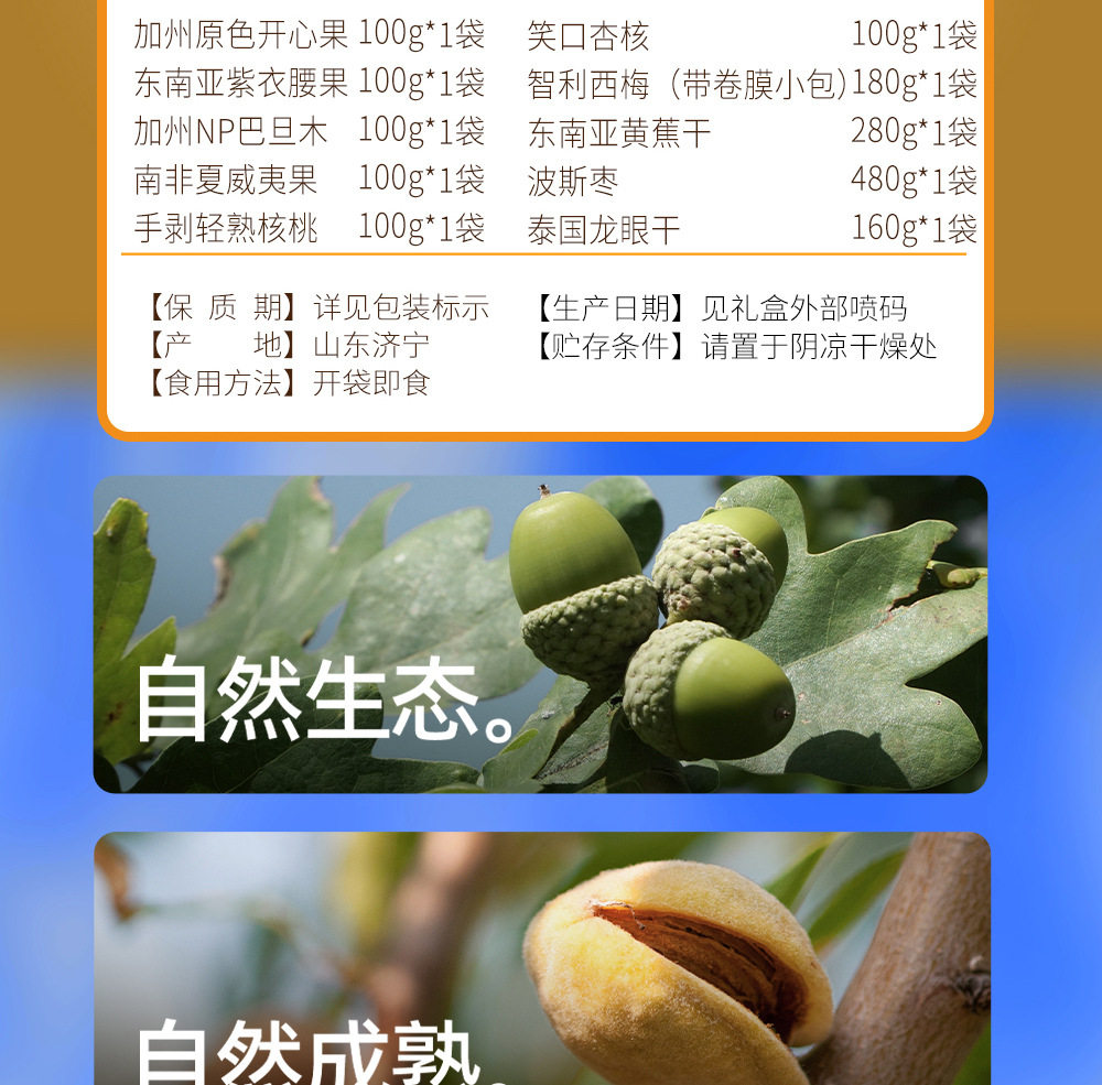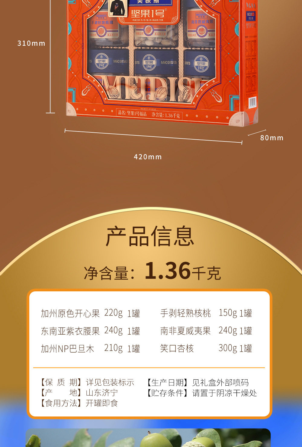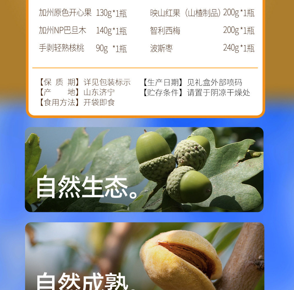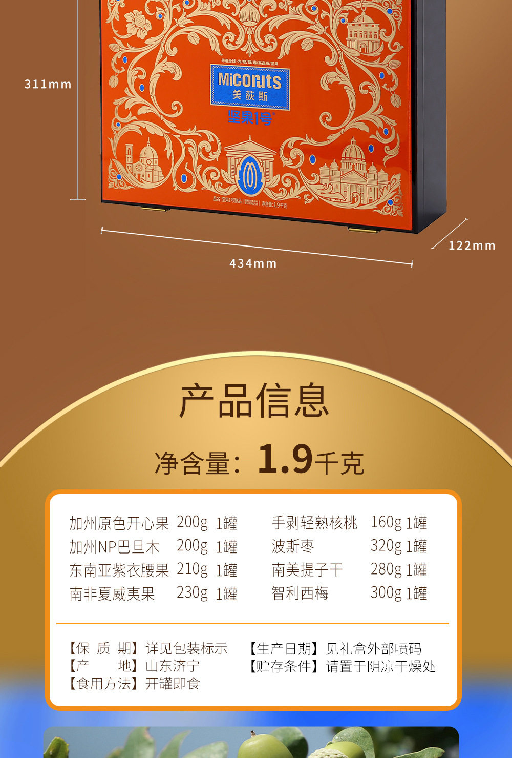 | Packaging specifications | Golden horse songfu 1600g,Nut no. 1 yueguo 1600g,Nut no. 1 fruit 1500g,Nut no. 1 zhen fruit 1000g,Nut no. 1 youguo 1700g,Global selection·fuguo 1600,Nuts no. 1 shengguo 1700g,Nut no. 1 golden fruit 1800g,Nut no. 1 premium 2020g,Nut no. 1 fortune 1360g,Nuts no. 1 premium 1580g,Nut no. 1 jipin 2040g,Nuts no. 1 premium 2000g,Nut no. 1 tea 2140g,Nut no. 1 premium 2220g,Nut no. 1 premium 1900g |