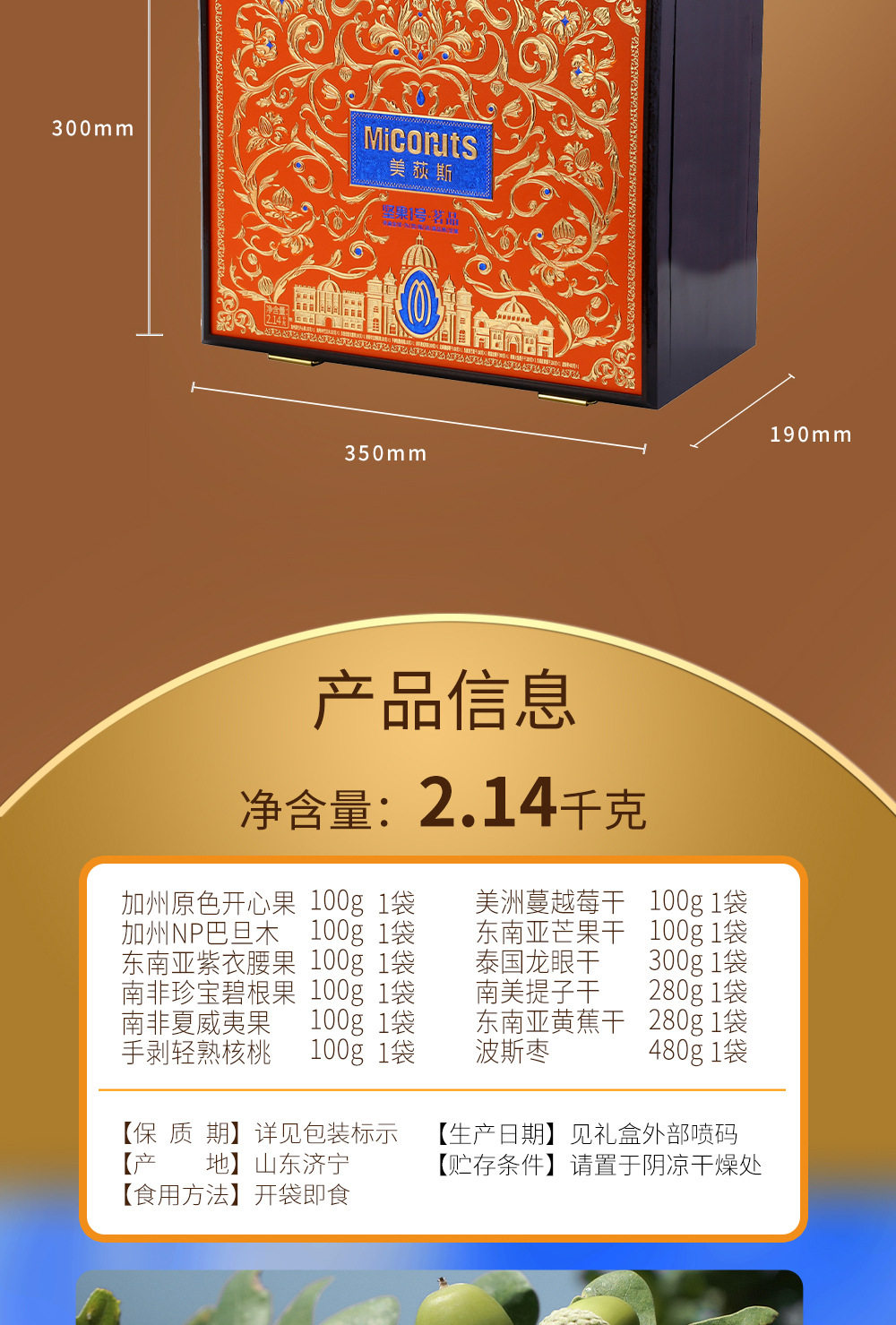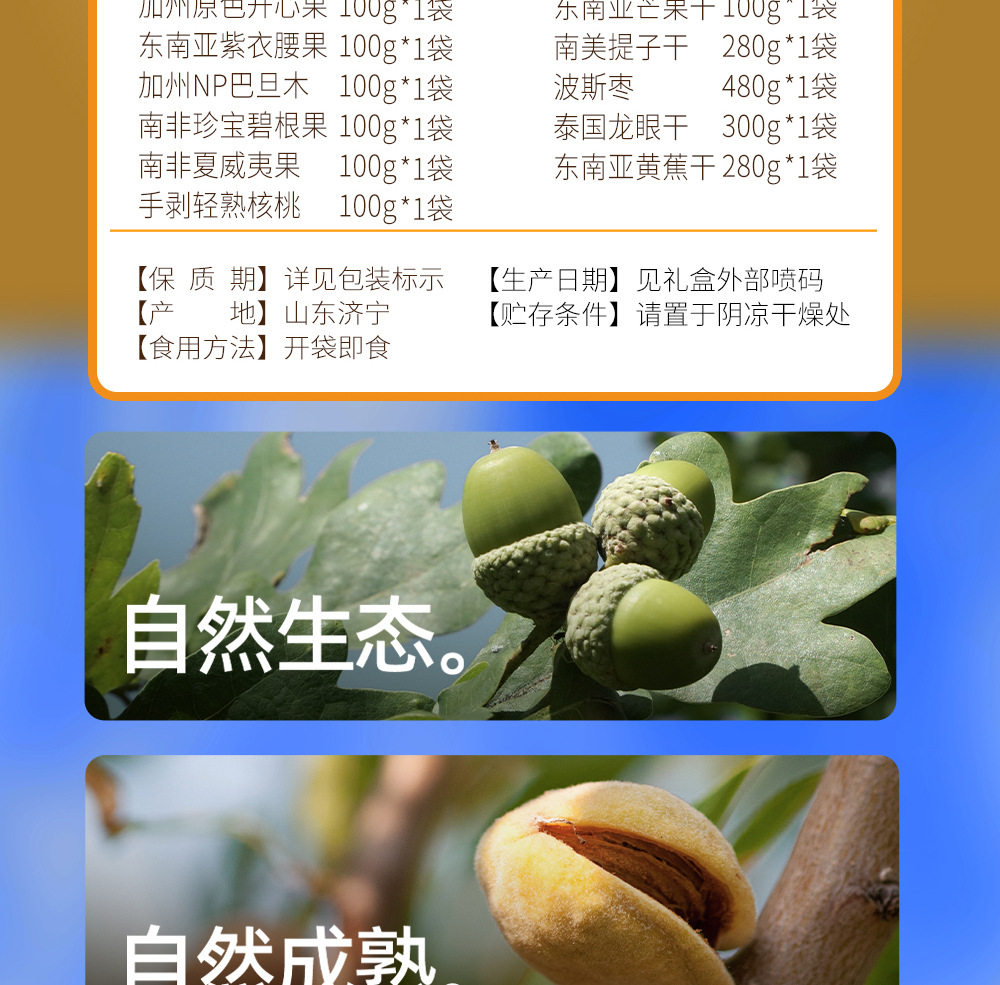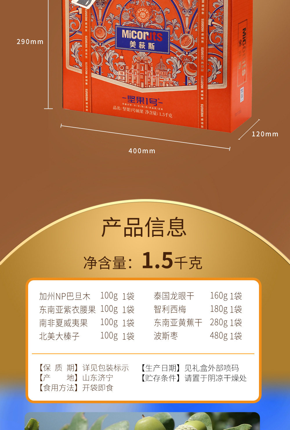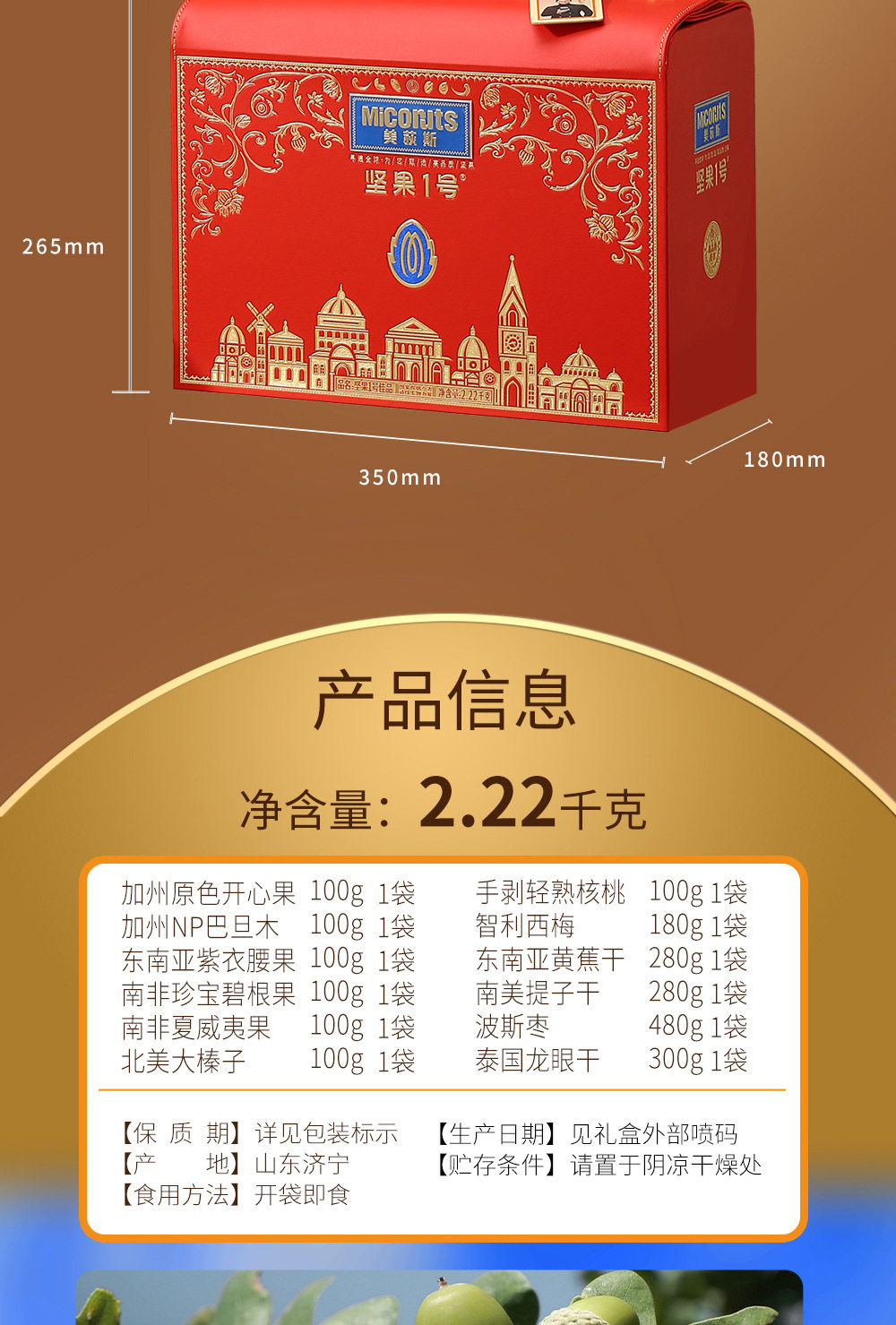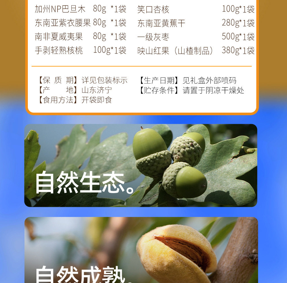 | Packaging specifications | Golden horse songfu 1600g,Nut no. 1 yueguo 1600g,Nut no. 1 fruit 1500g,Nut no. 1 zhen fruit 1000g,Nut no. 1 youguo 1700g,Global selection·fuguo 1600,Nuts no. 1 shengguo 1700g,Nut no. 1 golden fruit 1800g,Nut no. 1 premium 2020g,Nut no. 1 fortune 1360g,Nuts no. 1 premium 1580g,Nut no. 1 jipin 2040g,Nuts no. 1 premium 2000g,Nut no. 1 tea 2140g,Nut no. 1 premium 2220g,Nut no. 1 premium 1900g |
