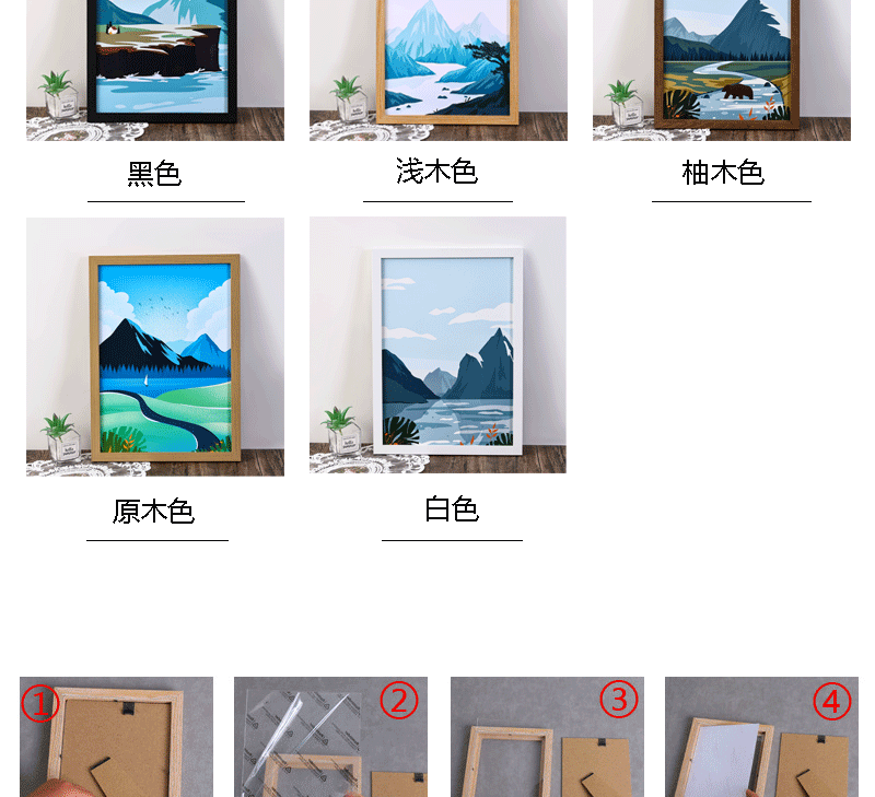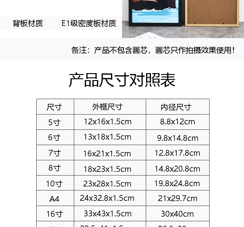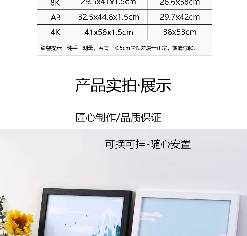 | Frame size | 5 inch (8.8X12.8)cm,6 inch (9.8x 14.8)cm,7 inch (12.8x 17.8)cm,8 inch (14.8x 19.8)cm,10 inch (19.8x 24.8)cm,A4(21x29.7)cm,A3(29.7x42)cm,16 inch (30x 40)cm,8K(26.5x38)cm,4K(38x53)cm |