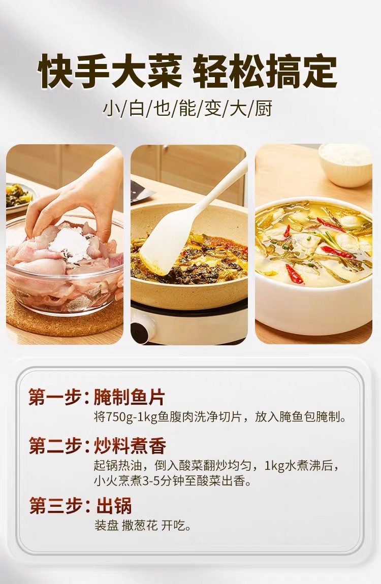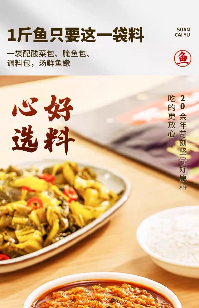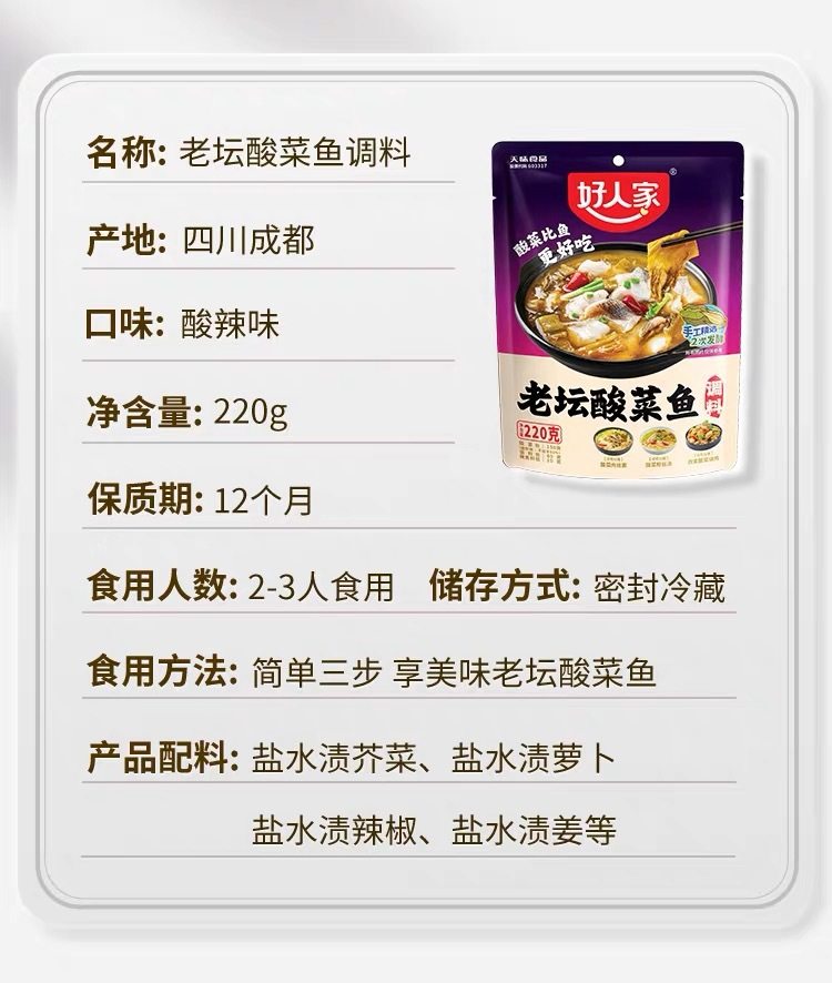 | Packaging specifications | Laotan pickled fish 300g,Liangtang pickled fish 220g,Green pepper fish seasoning 210g,Boiled fish seasoning 150g,Mapo tofu seasoning 80g,Pickled Cabbage Fish seasoning 220g |
