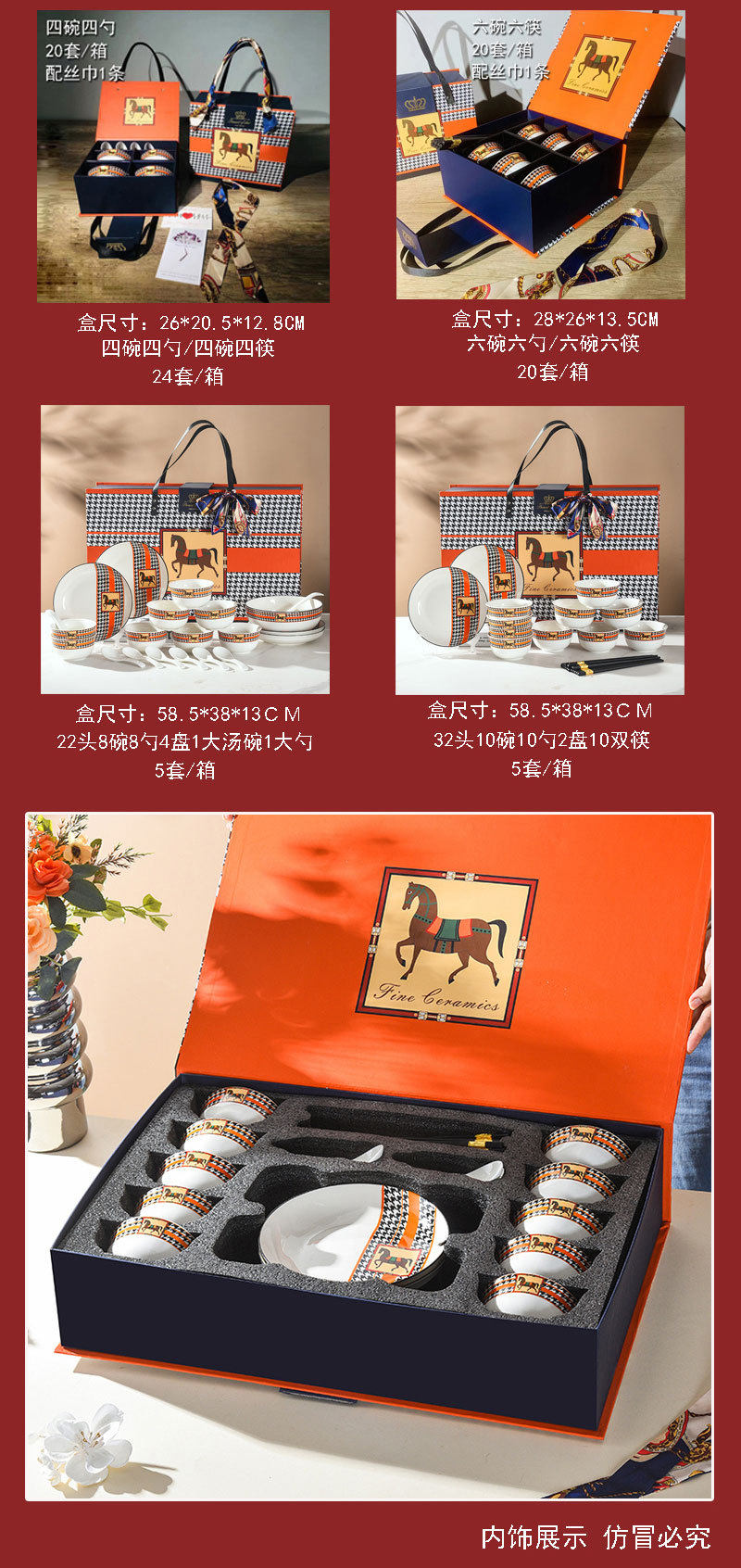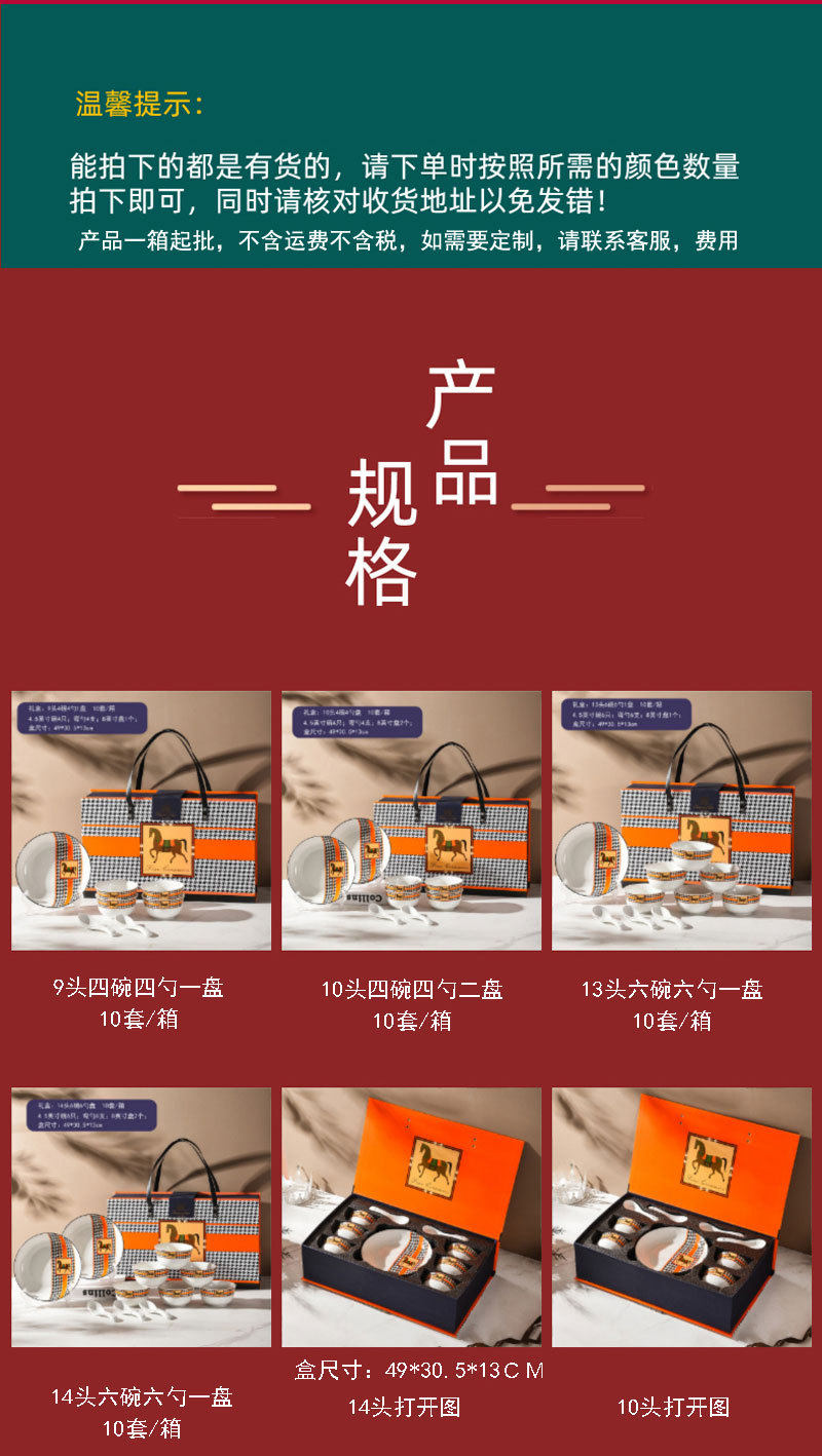 | Color | There are four bowls and four spoons of silk scarves (20 sets/box),There are four bowls and four chopsticks with silk scarves (20 sets/box),Six bowls and six chopsticks with silk scarves (20 sets/box),There are six bowls and six spoons of silk scarves (20 sets/box),9 head four bowls four spoons a plate (10 sets/box,10 heads, four bowls, four spoons and two plates (10 sets/box),13 heads, six bowls and six spoons in one plate (10 sets/box),14 head six bowl six spoon two plate (10 sets/box,There are 20 scarves, 8 bowls, 8 spoons, 2 plates, 1 soup bowl, 1 tablespoon (5 sets/box),There are 22 scarves, 8 bowls, 8 spoons, 4 plates, 1 soup bowl, 1 tablespoon (5 sets/box),There are 32 scarves, 10 bowls, 10 chopsticks, 2 spoons and 2 plates (5 sets/box),There are 34 scarves, 10 bowls, 10 chopsticks, 10 spoons and 4 plates (5 sets/box) |