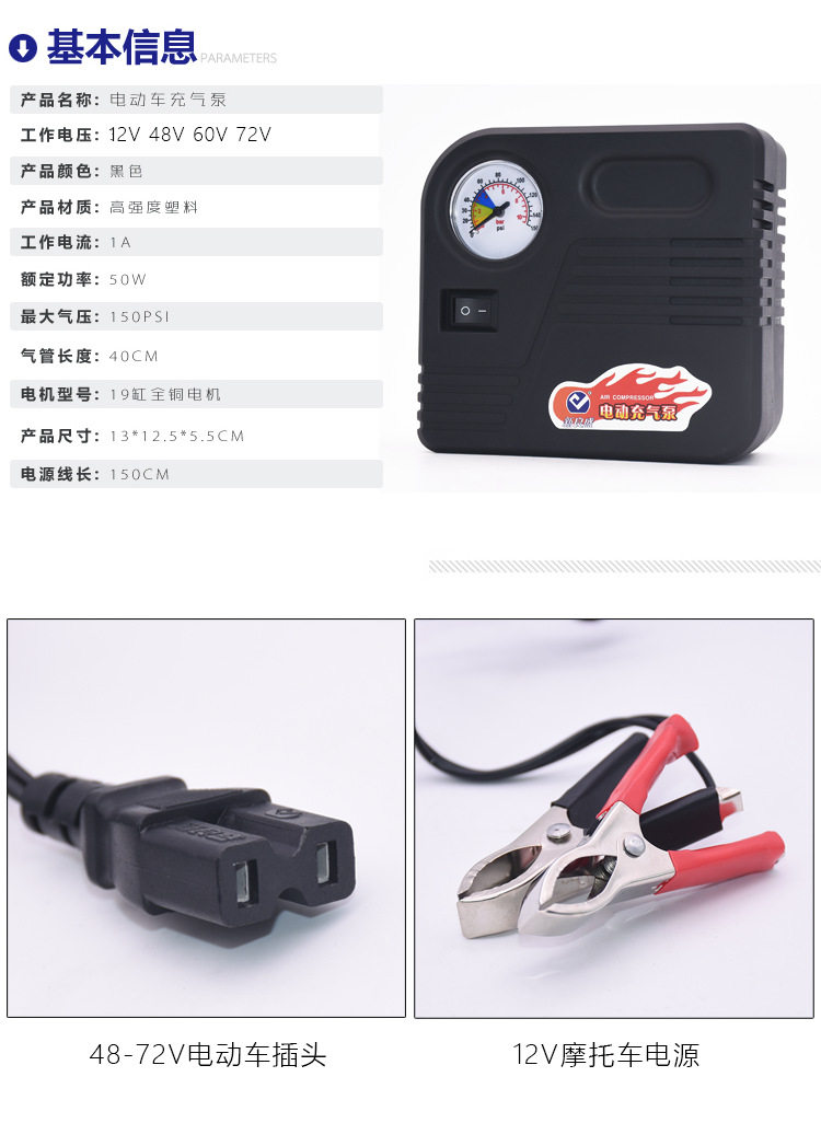 | Specifications | 12v inflatable pump clip,48-72v air pump electric vehicle plug model |