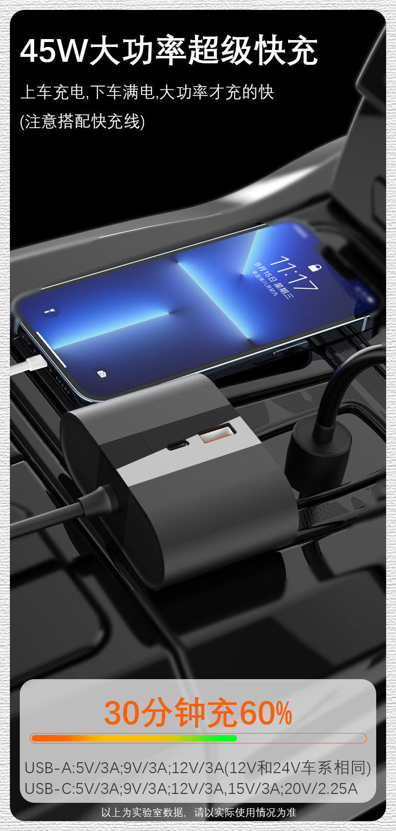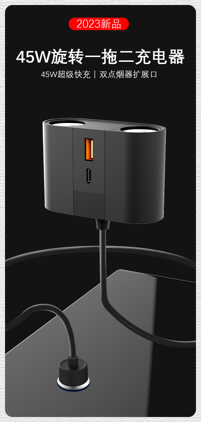 New 45W Car Charger with One-To-Three Ports, Dual 100W Cigarette Lighter Extension Ports, Stable Voltage and Durable
