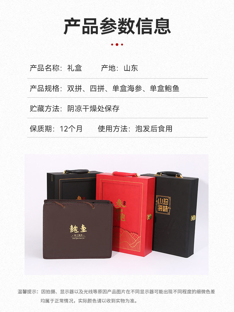 | Packaging specifications | [double gift box] symmetrical abalone,[four-piece gift box] mountain treasures and sea flavor,[abbon gift box] |