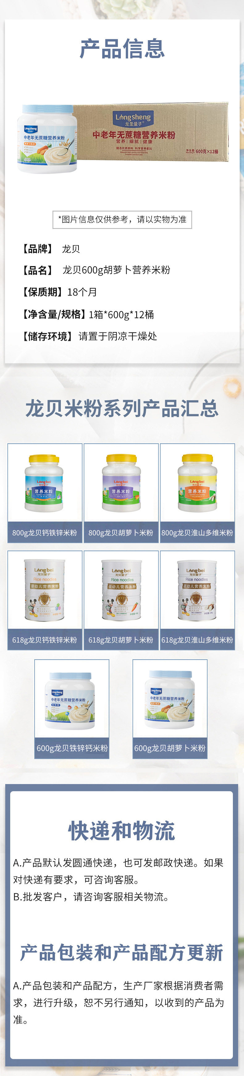| Packaging specifications | 600g sugar-free nutrition rice flour for middle-aged and elderly people (carrot formula),600g sugar-free nutrition rice flour for middle-aged and elderly people (iron, zinc and calcium) |