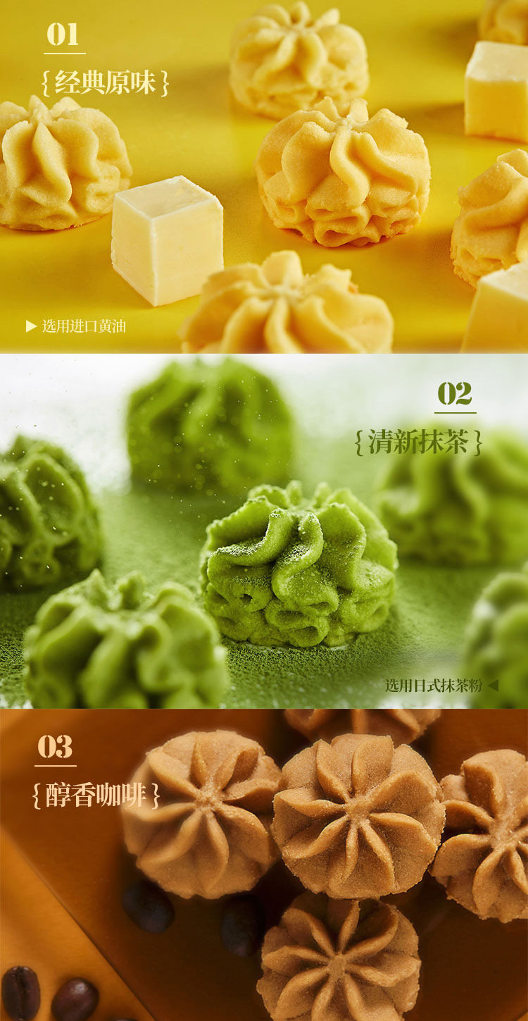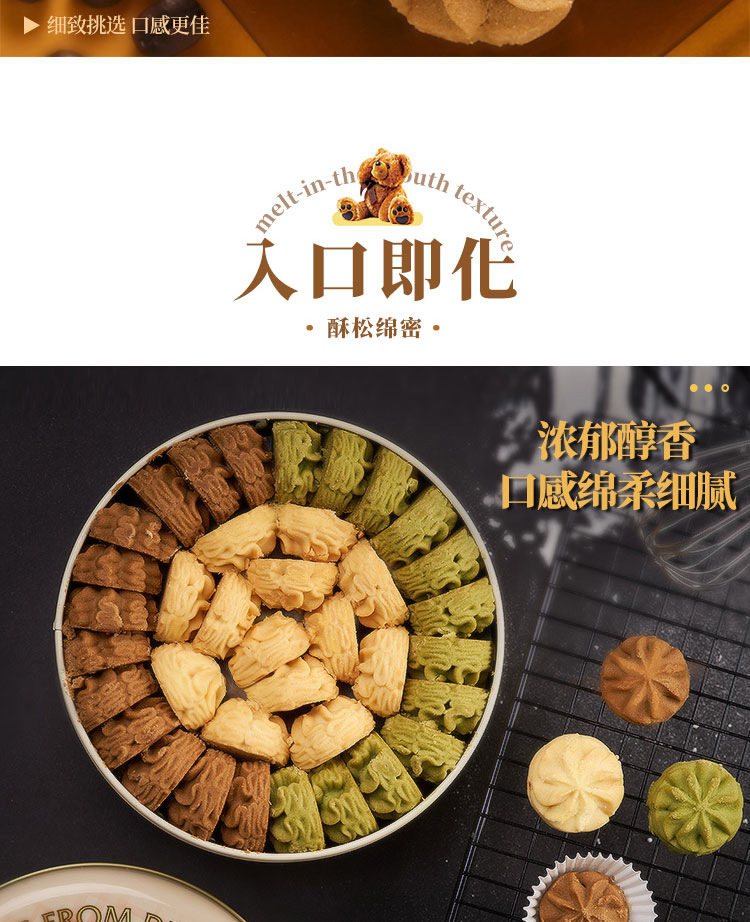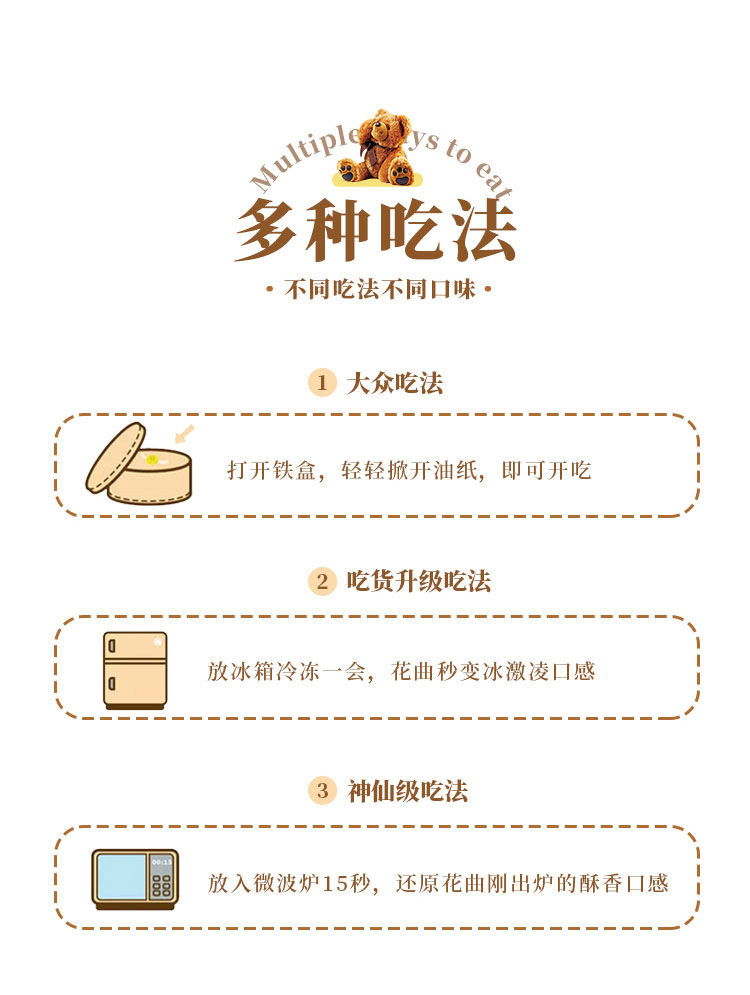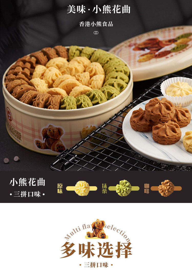 | Packaging specifications | Bear Flower Song (original flavor) 505g [shelf life 8 months]],Bear Flower Song (mixed) 505g [shelf life 8 months]],Hawaiian nuts chocolate flavor chips 255g [shelf life 8 months]],Pine nuts chocolate flavor chips 255g [shelf life 8 months]],Hong Kong style butter egg roll King 360g [shelf life 10 months]],Hong Kong-style popcorn cookies (salted egg yolk) 500g [shelf life 9 months]],Hong Kong-style popcorn cookies (cranberry) 500g [shelf life 9 months]],Black sesame butter coconut crisp 230g [shelf life 8 months]],Salted egg yolk butter coconut crisp 230g [shelf life 8 months]],Salted egg yolk flowing egg roll 336g [shelf life 10 months]],Cheese flowing egg roll 336g [shelf life 10 months]],Durian flow heart egg roll 336g [shelf life 10 months]],Cranberry snowflake crisp 225g [shelf life 8 months]],Cheese cow milk Fu 225g [shelf life 8 months]],Domang yogurt cow milk Fu 225g [shelf life 8 months]],Original Egg Pie 360g [shelf life 12 months]],Brown sugar egg pie 360g [shelf life 12 months]],Hong Kong-style chocolate egg roll 500g [shelf life 10 months]],Hong Kong style original flavor egg roll 500g [shelf life 10 months]],Puree original flavor Xiaobei 355g [shelf life 10 months]],Popcorn strawberry small shell 355g [shelf life 10 months]] |