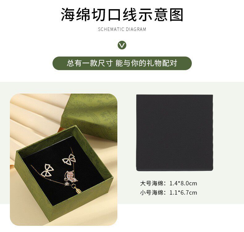 | Specification model | Green with bow; 5x5x3.5 (ring box),Green with bow; 5x8x2.5 (earring box),Green with bow; 7.5x7.5x3.5 (earring box),Green with bow; 7x9x3 (rectangular box),Green with bow; 8x8x4.5 (pendant box),Green with bow; 9x9x4 (bracelet box),Green with bow; 9x9x4 (covered to the bottom),Green with bow; 4x21x2.2 (hairpin box),Green with bow; 9x8.5x5.5 (watch box),Green with bow; handbag 12x11x6 hairpin box perfume box cannot be used with anything else,Green with bow; 15x8.5x5.5 (perfume lipstick box) raffia,White with bow; 5x5x3.5 (ring box),White with bow; 5x8x2.5 (earring box),White with bow; 7.5x7.5x3.5 (earring box),White with bow; 7x9x3 (rectangular box),White with bow; 8x8x4.5 (pendant box),White with bow; 9x9x4 (bracelet box),White with bow; 9x9x4 (covered to the bottom),White with bow; 4x21x2.2 (hairpin box),White with bow; 9x8.5x5.5 (watch box),White with bow; handbag 12x11x6 hairpin box perfume box cannot be used with anything else,White with bow; 15x8.5x5.5 (perfume lipstick box) raffia,Army green (including sponge); 5x5x3.5 (ring box),Army green (including sponge); 5x8x2.5 (earring box),Army green (including sponge); 7.5x7.5x3.5 (earring box),Army green (including sponge); 7x9x3 (rectangular box),Army green (including sponge); 8x8x4.5 (pendant box),Army green (including sponge); 9x9x4 (bracelet box),Army green (including sponge); 9x9x4 (covered to the bottom),Army green (including sponge); 4x21x2.2 (hairpin box),Army green (including sponge); 9x8.5x5.5 (watch box),Military green (including sponge); handbag 12x11x6 hairpin box perfume box cannot be used with anything else,Army green (including sponge); 15x8.5x5.5 (perfume lipstick box) raffia,White (including sponge);5x5x3.5 (ring box),White (including sponge); 5x8x2.5 (earring box),White (including sponge); 7.5x7.5x3.5 (earring box),White (including sponge); 7x9x3 (rectangular box),White (including sponge); 8x8x4.5 (pendant box),White (including sponge); 9x9x4 (bracelet box),White (including sponge); 9x9x4 (covered to the bottom),White (including sponge); 4x21x2.2 (hairpin box),White (including sponge); 9x8.5x5.5 (watch box),White (including sponge); handbag 12x11x6 hairpin box perfume box cannot be used with anything else,White (including sponge); 15x8.5x5.5 (perfume lipstick box) raffia |