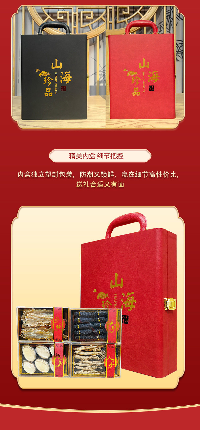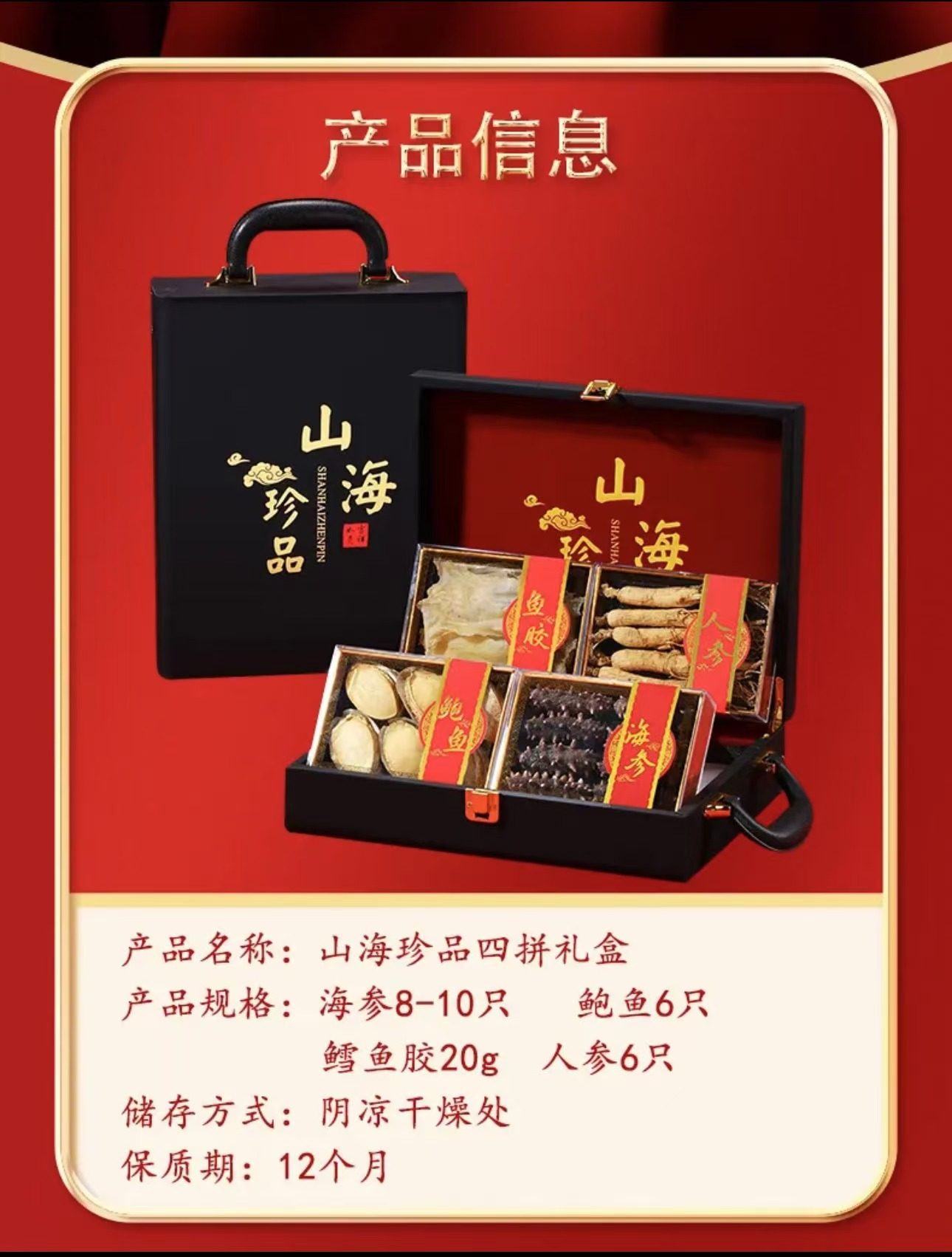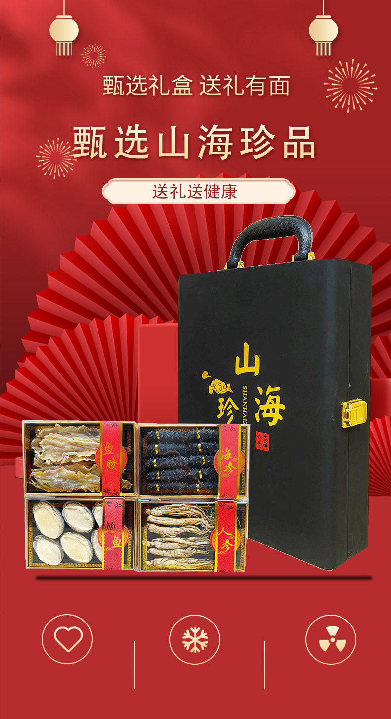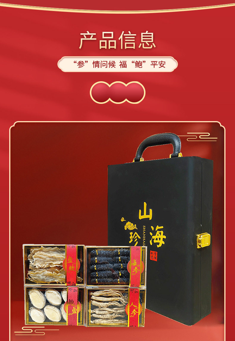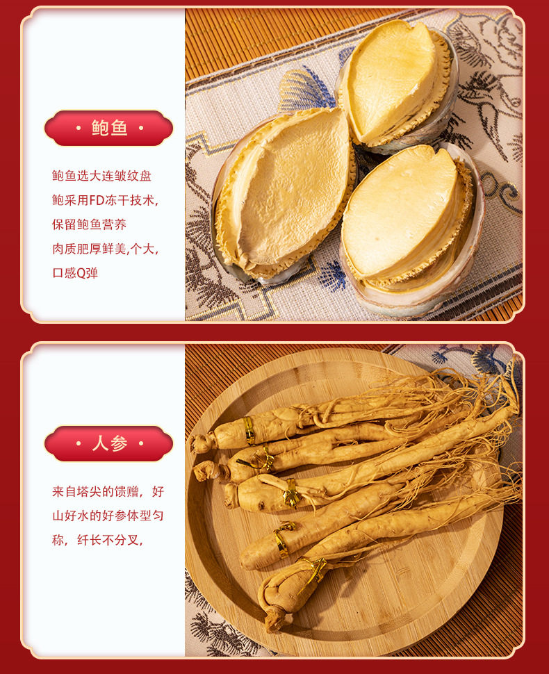 | Packaging specifications | Delicacies from mountains and seas 4 pieces [black gift box],4 pieces of delicacies from mountains and seas [red gift box],10 abalone,4 delicacies from mountains and seas [exclusive edition] black,4 delicacies from mountains and seas [exclusive edition] red |
