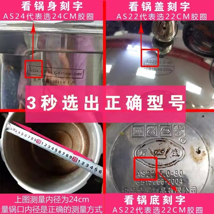 | Specifications | Original stainless steel pot seal ring 18cm,Original stainless steel pot seal ring 20cm,Original stainless steel pot seal ring 22cm,Original stainless steel pot seal ring 24cm,Original stainless steel pot seal ring 26cm,Original stainless steel pot seal ring 28cm,Original stainless steel pot seal ring 30cm,Original stainless steel pot seal ring 32cm,Original stainless steel pot seal ring 34cm,Stainless steel straight handle 18-22cm,Stainless steel straight handle 24-28,Stainless steel medium ratio handle 20-30cm,Stainless steel commercial handle 32-38cm,Auxiliary handle 20-30cm,Vice handle 18-30cm,Pressure limiting valve 18-30cm,Pressure limiting valve 32-38cm,Float valve,Safety valve (Silver),Safety valve (red),Pull-down valve (Quick exhaust),Exhaust pipe,Exhaust pipe (lengthened) |