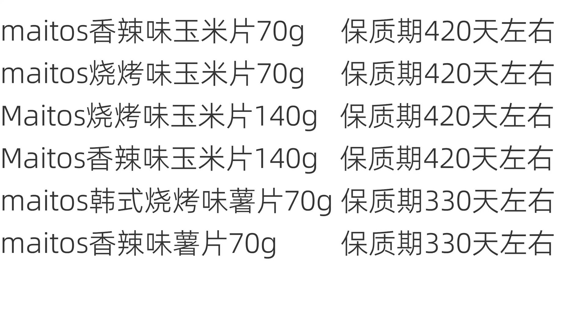 | Packaging specifications | If you need to purchase the whole box, you can contact customer service directly,【1 bag】spicy corn flakes 140g/bag,[1 bag] bbq flavor 140g corn flakes/bag,[2 bags*140g] spicy corn flakes*2 bags,[2 bags*140g] bbq flavored corn flakes*2 bags,[2 bags*140g] 1 bag of spicy flavor + 1 bag of barbecue flavor,[3 bags*140g] bbq flavored corn flakes*3 bags,[3 bags*140g] spicy corn flakes*3 bags,[4 bags*140g] spicy corn flakes*4 bags,[4 bags*140g] bbq flavored corn flakes*4 bags,[4 bags*140g] 2 bags of spicy flavor + 2 bags of barbecue flavor,[6 bags*140g] spicy corn flakes*6 bags,[6 bags*140g] bbq flavored corn flakes*6 bags,[6 bags*140g] 3 bags of spicy flavor + 3 bags of barbecue flavor |