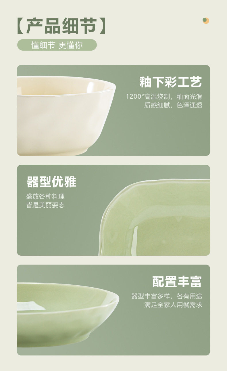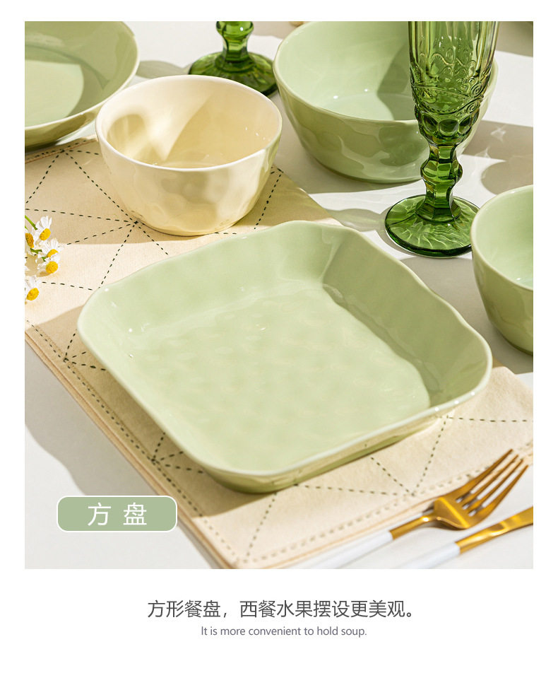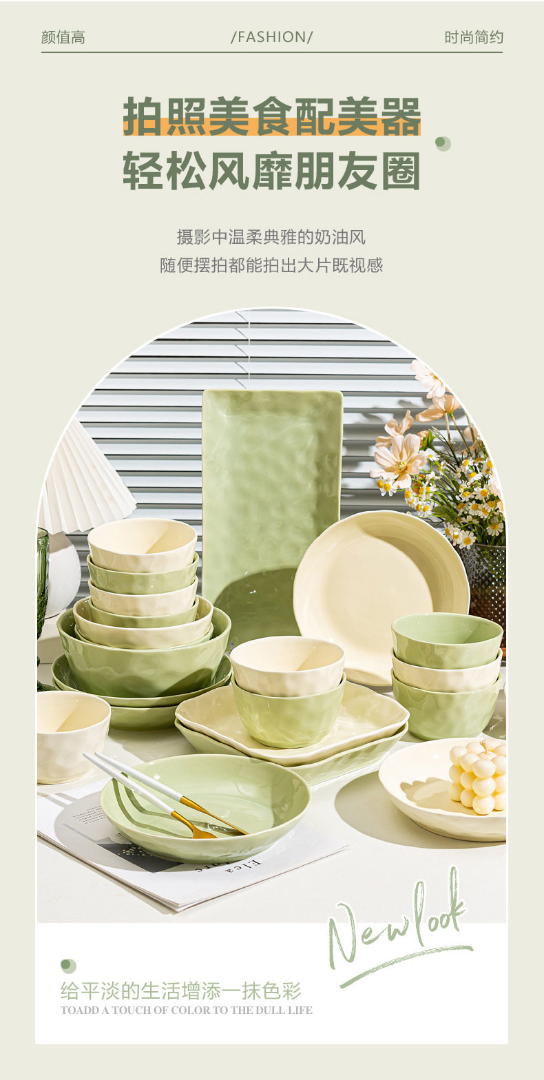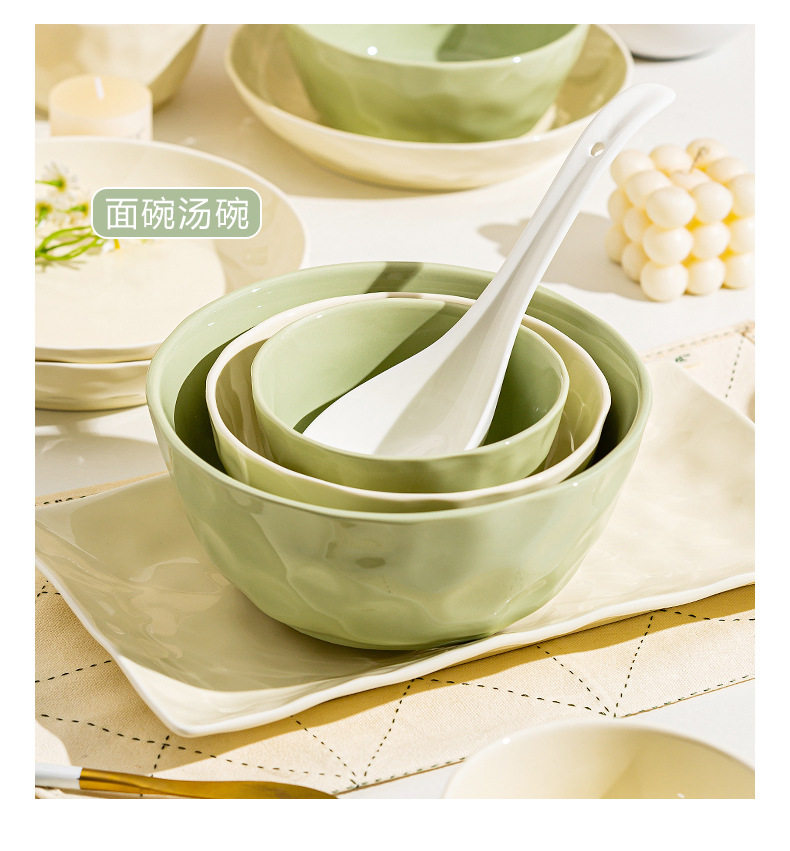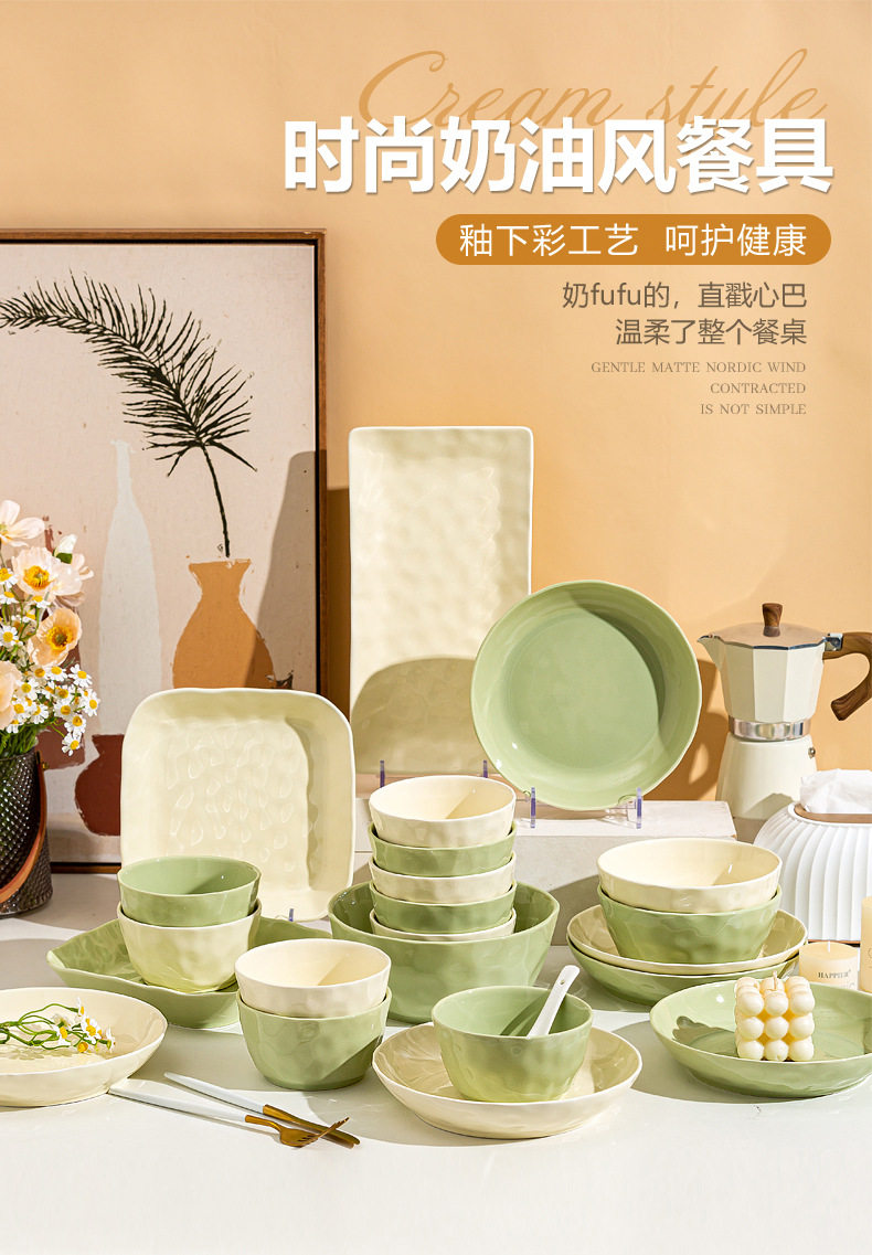 | Color | Cream Green 4.7-inch Rice Bowl,Cream green 6 inch noodle bowl,Cream green 8 inch soup bowl,Cream green 7 inch disc,Cream green 8 inch disc,Cream Green 8.5-inch Square Plate,Cream Green 12-inch Fish Plate,Cream wind casserole,Cream Yellow 4.7-inch Rice Bowl,Cream yellow 6 inch noodle bowl,Cream yellow 8 inch soup bowl,Cream yellow 7 inch disc,Cream yellow 8 inch disc,Cream yellow 8.5-inch square plate,Cream Yellow 12-inch Fish Plate |