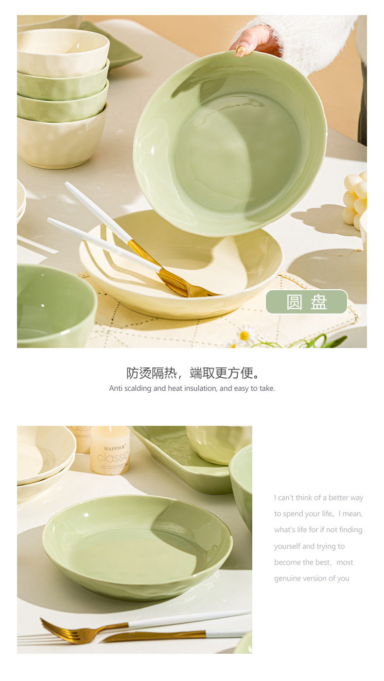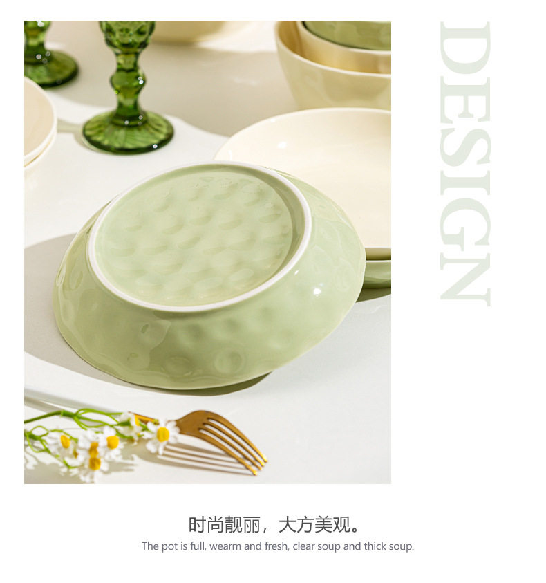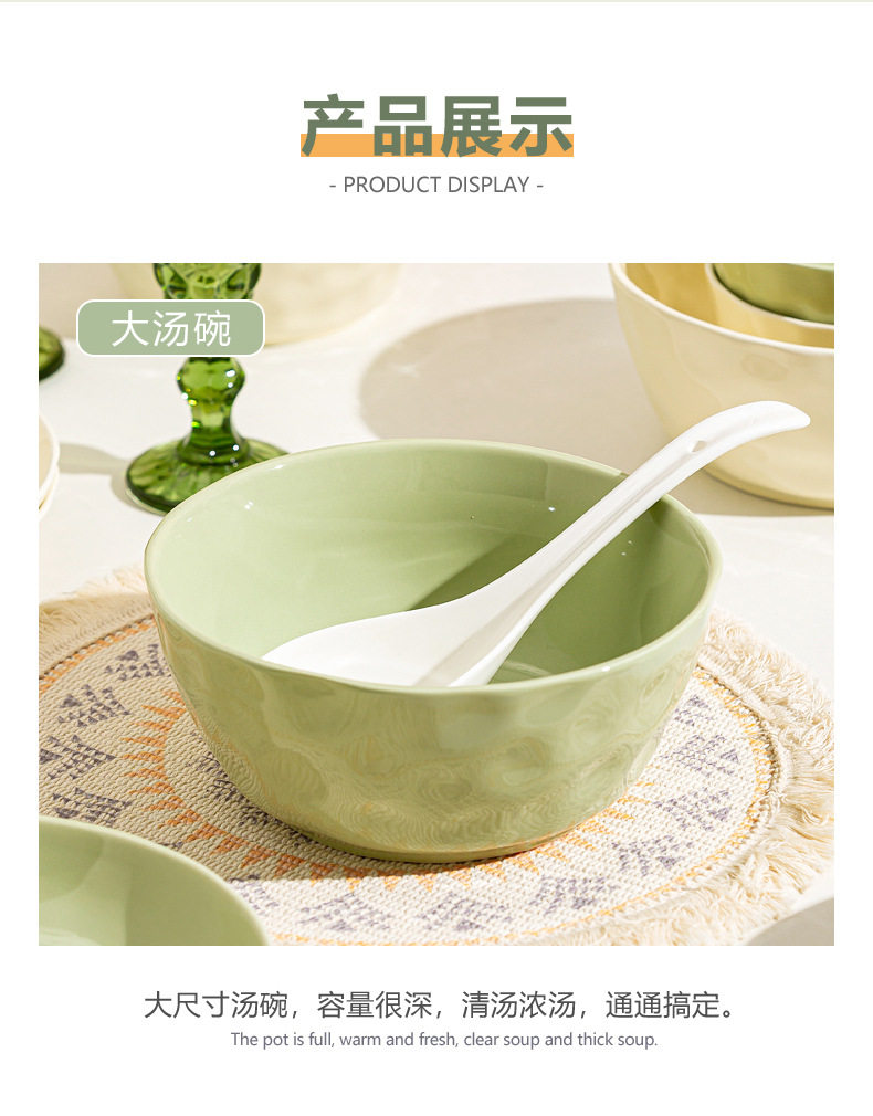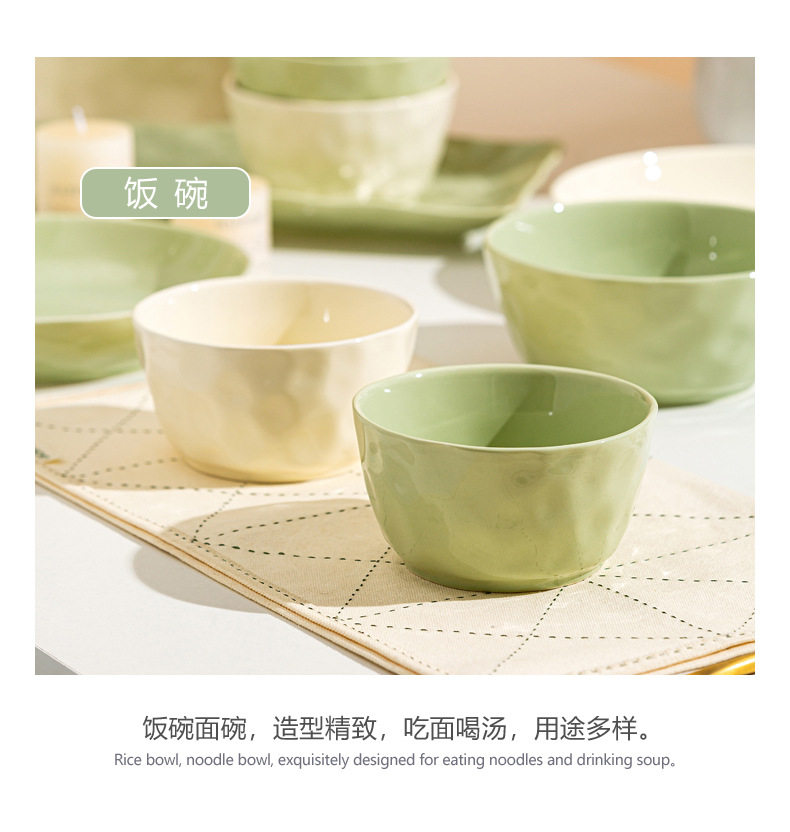 | Color | Cream Green 4.7-inch Rice Bowl,Cream green 6 inch noodle bowl,Cream green 8 inch soup bowl,Cream green 7 inch disc,Cream green 8 inch disc,Cream Green 8.5-inch Square Plate,Cream Green 12-inch Fish Plate,Cream wind casserole,Cream Yellow 4.7-inch Rice Bowl,Cream yellow 6 inch noodle bowl,Cream yellow 8 inch soup bowl,Cream yellow 7 inch disc,Cream yellow 8 inch disc,Cream yellow 8.5-inch square plate,Cream Yellow 12-inch Fish Plate |