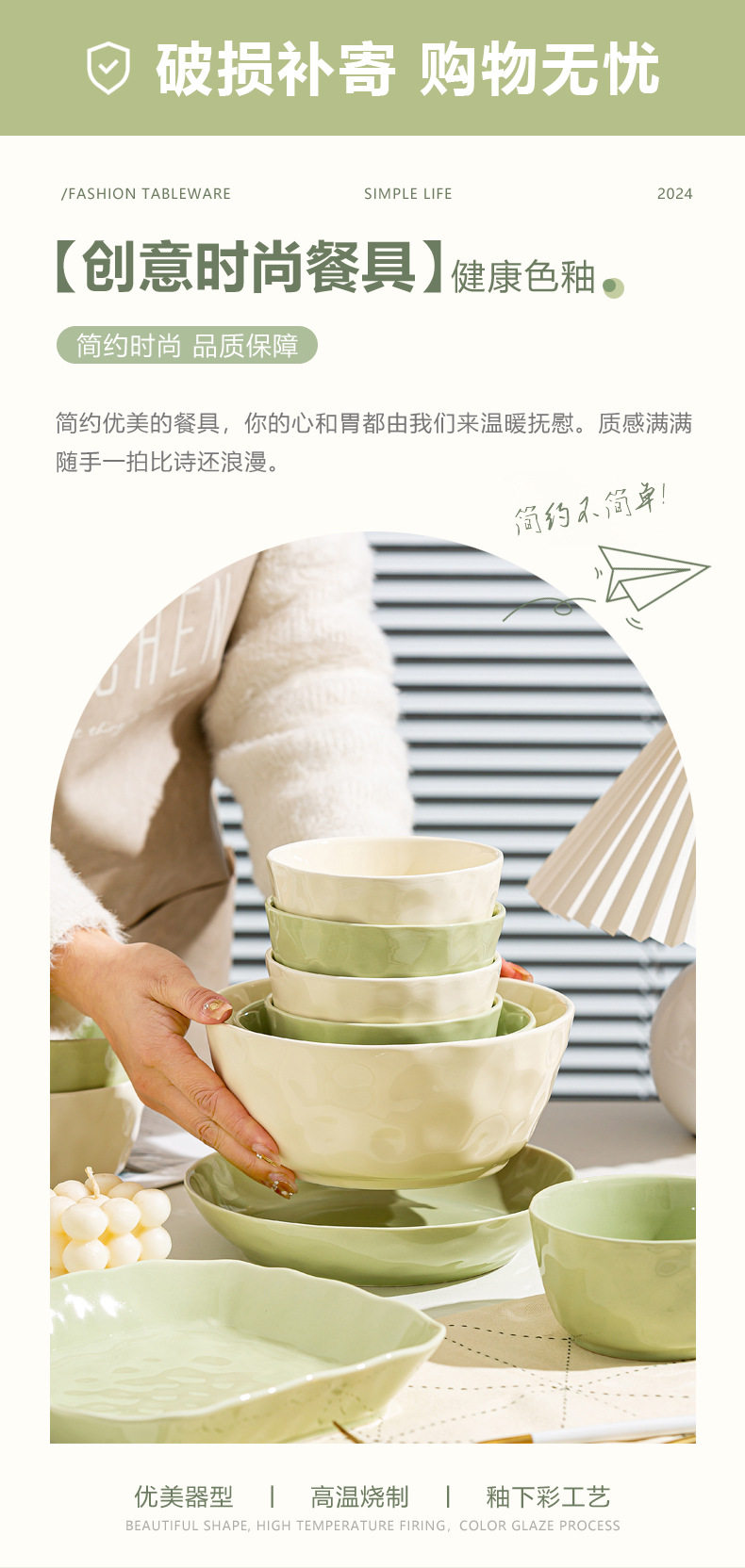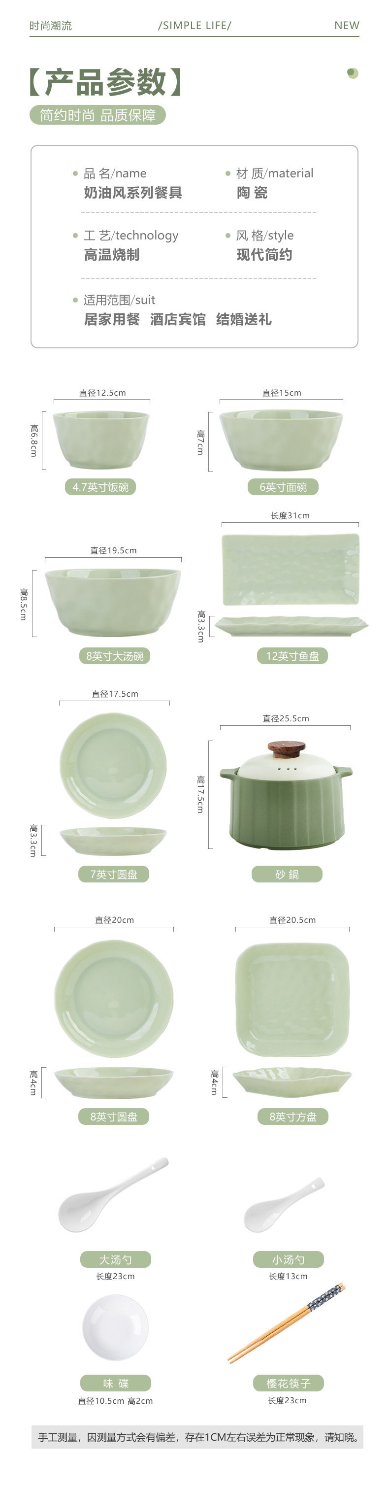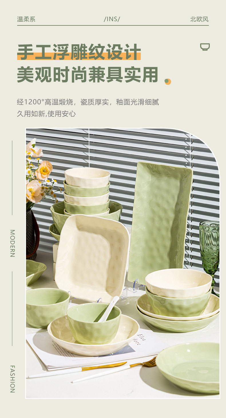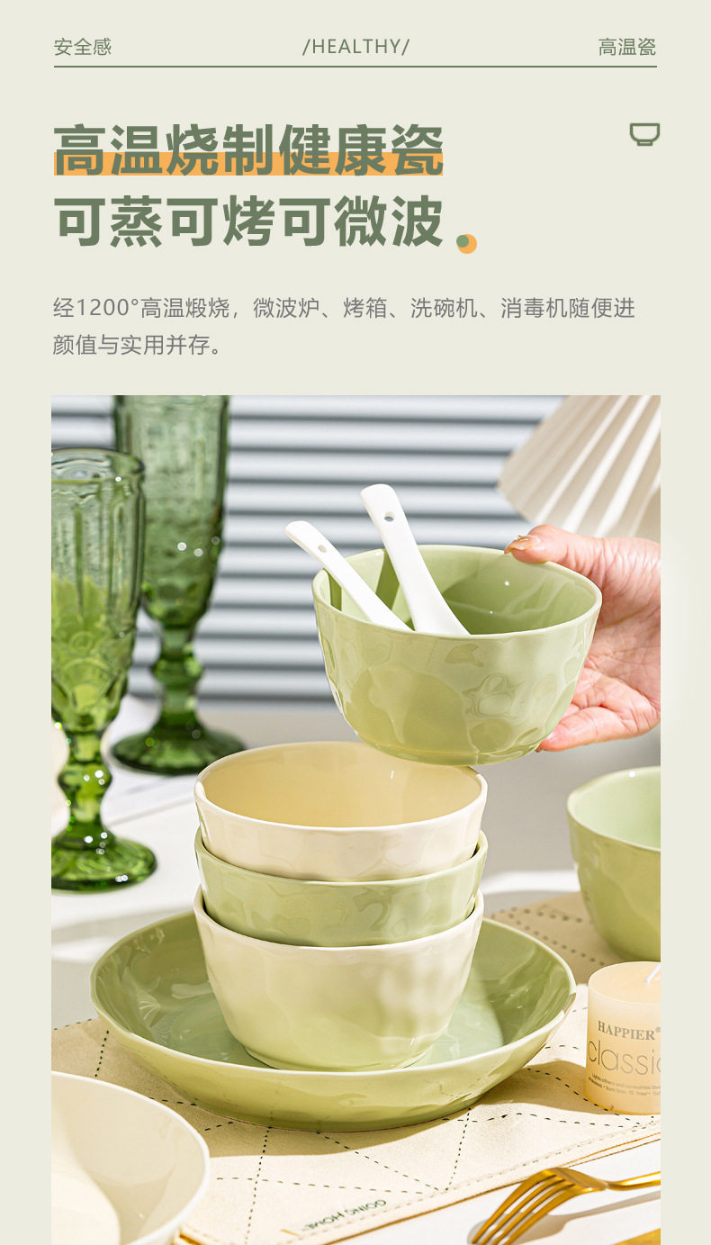 | Color | Cream Green 4.7-inch Rice Bowl,Cream green 6 inch noodle bowl,Cream green 8 inch soup bowl,Cream green 7 inch disc,Cream green 8 inch disc,Cream Green 8.5-inch Square Plate,Cream Green 12-inch Fish Plate,Cream wind casserole,Cream Yellow 4.7-inch Rice Bowl,Cream yellow 6 inch noodle bowl,Cream yellow 8 inch soup bowl,Cream yellow 7 inch disc,Cream yellow 8 inch disc,Cream yellow 8.5-inch square plate,Cream Yellow 12-inch Fish Plate |