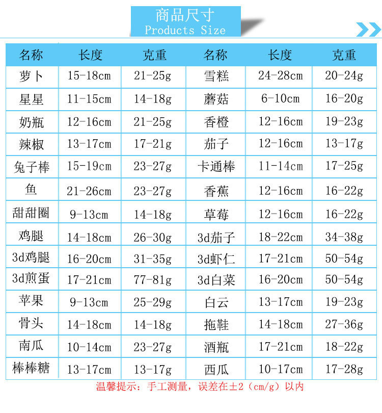 | Color | Lollipop Blue,Lollipop pink,Lollipop Orange,Plush drunk wine bottle grass green,Plush drunk wine bottle sky blue,Printed pink strawberry toy,Toy Red Apple,Blue pentagram stars,Sound yellow duck toy,Donut pink,Donut Brown,Carrot sound,Red pepper sound,Purple eggplant sound,Tea egg (Bell),Rectangular watermelon,Triangle watermelon,Navel Orange sound,Round kiwi fruit,Rectangular avocado,Double-bone chicken leg sound toy,Pumpkin sounding toy,Embroidered Red strawberry,Embroidered pink strawberry,Banana sounding toy,Pink mushroom,Green mushroom,Fried shrimp leg meat toy,Ice cream pink,Ice cream Blue,Purple Hippo pillow,Brown bear pillow,Pink Rabbit pillow,Green frog pillow,Red crayfish sound plush toy,Orange crab sounding plush toy,Pink milk bottle,Blue milk bottle,Toy candy orange,Toy candy pink,3d digital voice roast chicken leg toy,3d digital poached egg toy,3d digital voice shrimp toy,Simulation printing toy carp Red,Simulation printing toy carp cyan,Enlarged circle black and white panda,French fries sounding toy,Hamburger sounding toy,Rectangular gray elephant toy,Rectangular Fliggy toy,Rectangular flying duck toy,Pineapple lattice toy white sheep,Corn grid toy cow,Corn grid toy brown monkey,Corn grid toy gray Kaola,Corn grid toy White Rabbit,Corn grid toy pink pig,Corn grid toy blue elephant,Corn grid toy yellow lion,Corn grid toy crocodile denim blue,Corn grid toy crocodile grass green,Corn grid toy crocodile wine red,Dark red bone toy,Bone toy rainbow,Toy gray Totoro,Stick Rose Red Bunny,Toy candy blue,Green Frog with enlarged circle,Pineapple lattice toy gray donkey,Pineapple Plaid toy brown horse,Sound white clouds |