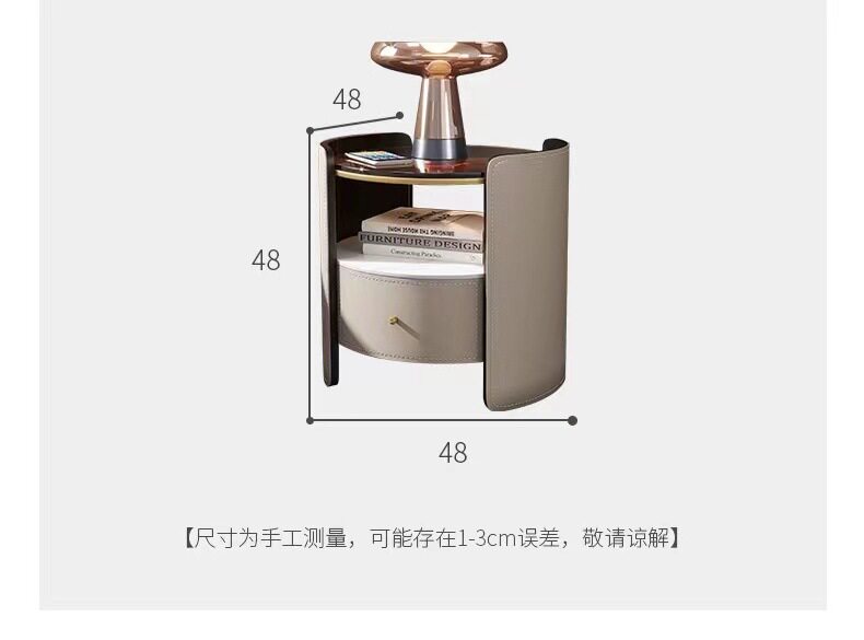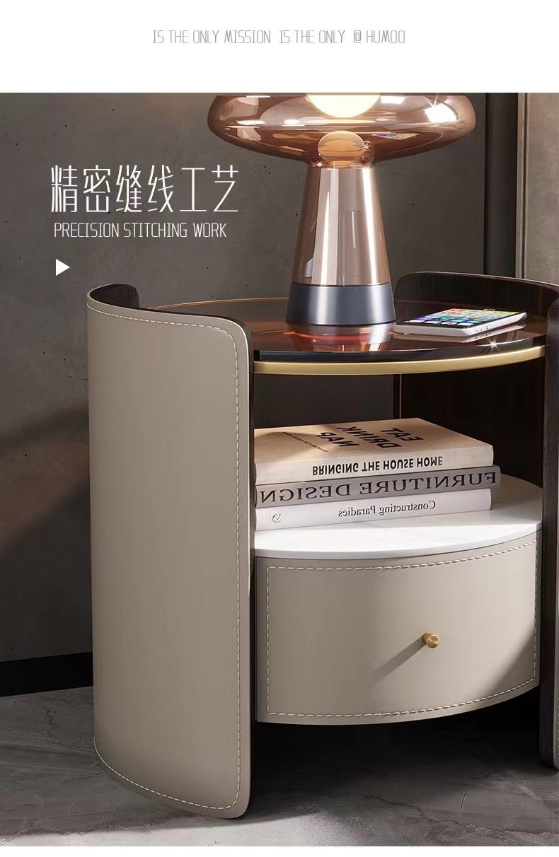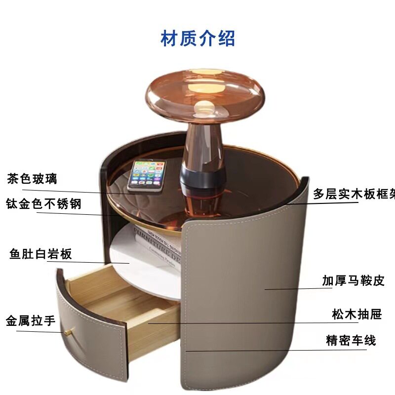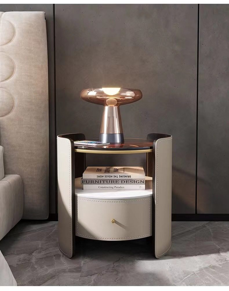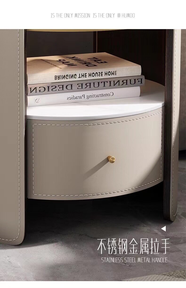 Italian Saddle Leather Round Bedside Table Modern Small Apartment High-end Solid Wood Bucket Cabinet Bedroom Bedside Cabinet Storage Cabinet