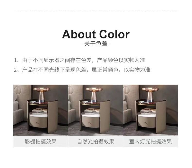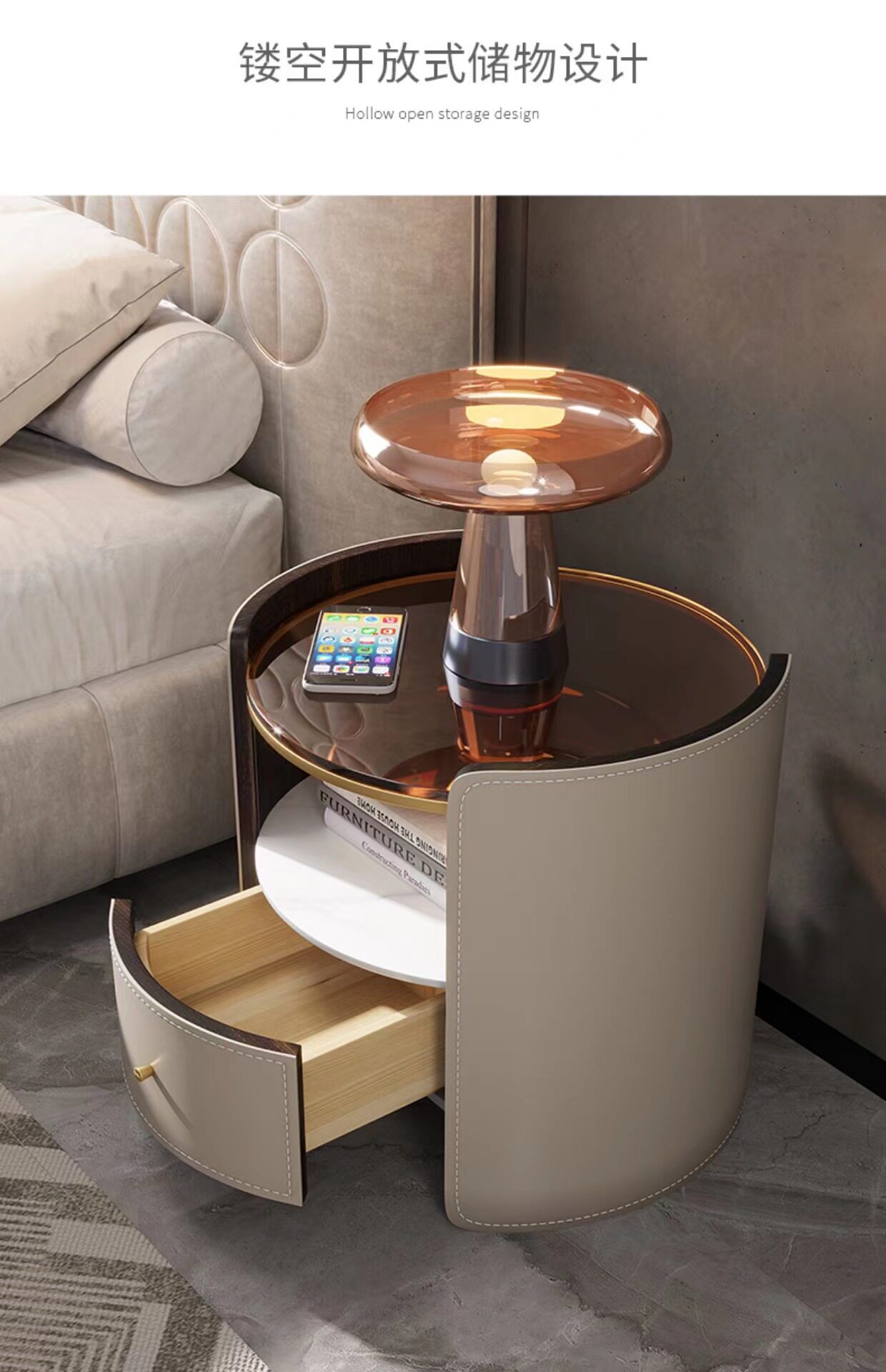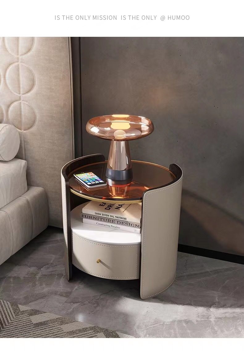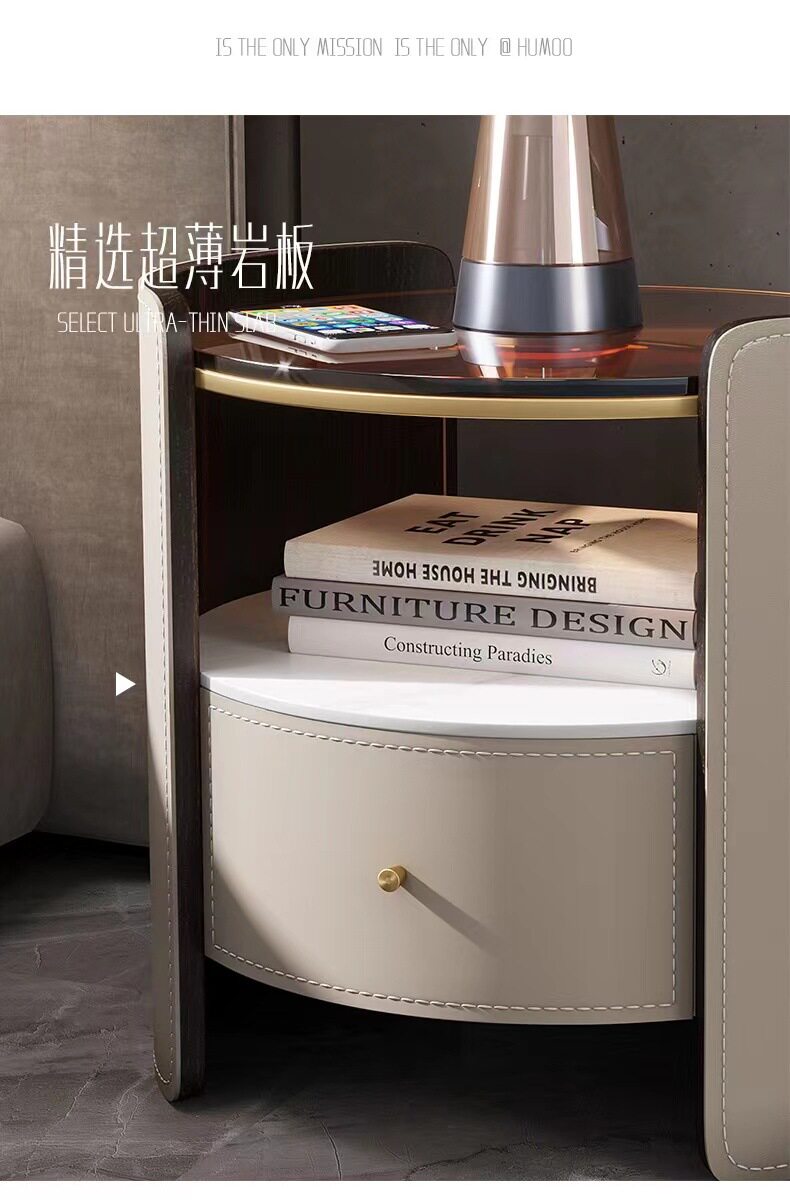 Italian Saddle Leather Round Bedside Table Modern Small Apartment High-end Solid Wood Bucket Cabinet Bedroom Bedside Cabinet Storage Cabinet