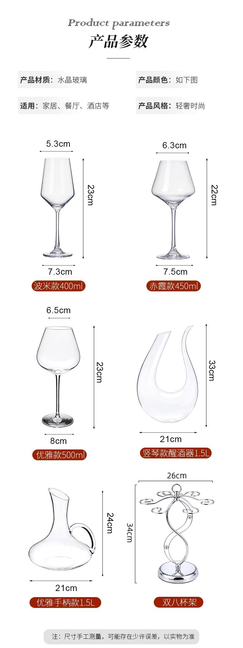 | Color | Pami style 400ml red wine glasses 6 pieces,Chixia style 450ml red wine glasses 6 pieces,6 elegant 500ml red wine glasses,6 450ml red stem red wine glasses,6 pami 400ml red wine glasses + red wine rack + silver top,Chixia style 450ml red wine glasses 6 pieces + red wine rack + silver top,6 elegant 500ml red wine glasses + red wine rack + silver decanter,Polenta style 400ml red wine glasses 6 pieces + wine rack + harp version 1.5l,Chixia style 450ml red wine glasses 6 pieces + wine rack + harp version 1.5l,Elegant 500ml red wine glasses 6 pieces + wine rack + harp version 1.5l,Polenta style 400ml red wine glasses 6 pieces + wine rack + elegant 1.5l handle,Chixia style 450ml red wine glasses 6 pieces + wine rack + elegant 1.5l handle,6 elegant 500ml red wine glasses + wine rack + elegant 1.5l handle,Pami style 400ml red wine glasses 6 pieces + silver top,Chixia style 450ml red wine glasses 6 pieces + silver top,6 elegant 500ml red wine glasses + silver top,Polka-shaped 400ml red wine glasses 6 pieces + harp style 1.5l,Chixia style 450ml red wine glasses 6 pieces + harp version 1.5l,Elegant 500ml red wine glasses 6 pieces + harp style 1.5l,Polenta style 400ml red wine glasses 6 pieces + elegant 1.5l handle,Chixia style 450ml red wine glasses 6 pieces + elegant 1.5l handle,Elegant 500ml red wine glasses 6 pieces + elegant 1.5l handle |