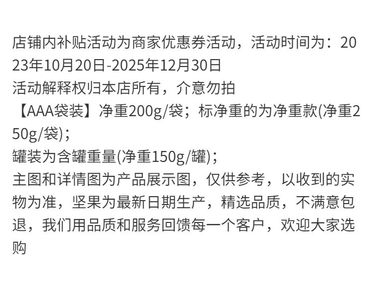| Flavor | Good products are available for a limited time~[premium net weight] 4 bags totaling 1000g,Good goods are available for a limited time~[new goods selected] 1 can-250g,Limited-time flash sale on quality goods! [aaa grade bagged] 1 bag, 250 grams total,Good products are available for a limited time~[premium net weight] 1 bag-250g,Limited-time flash sale on quality goods! get two cans of pecans, totaling 500g, for a steal!,Good products are available for a limited time~[new products selected] 2 cans total - 500g,Limited-time flash sale on quality goods! [aaa grade bagged] 2 bags, 500g total,Good products are available for a limited time~[premium net weight] 2 bags total 500g,Good products are available for a limited time~[new products selected] 4 cans totaling 1000g,Limited-time flash sale on quality goods! [aaa grade bagged] 4 bags, 1000 grams total |