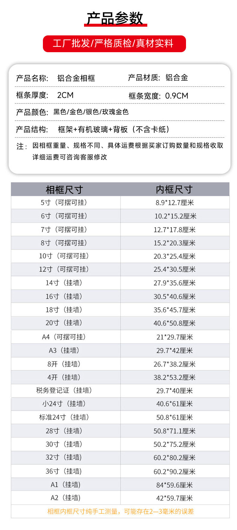| Inner frame size | A3 wall hanging (inner frame: 29.7x42cm),A4 hanging pendulum dual-purpose (inner frame: 21x29.7cm),4k wall hanging (inner frame: 38.2x53.2cm),8k wall hanging (inner frame: 26.7x38.2cm),20inch wall hanging (inner frame: 40.6x50.8cm),Small 24inch wall hanging (inner frame: 40.6x60.9cm),24inch wall hanging (inner frame: 50.8x61cm),28inch wall hanging (inner frame: 50.8x71.1cm),30inch wall hanging (inner frame: 50.2x75.2cm),Small 32inch wall hanging (inner frame: 50.2x80.2cm),Large 32inch wall hanging (inner frame: 60.2x80.2),36inch wall hanging (inner frame: 60.2x90.2cm),A1 wall hanging (inner frame: 59.6x84.2cm),A2 wall hanging (inner frame: 42x59.6cm),18inch wall hanging (inner frame: 35.6x45.7cm),16inch wall hanging (inner frame: 30x40cm),14inch wall hanging (inner frame: 27.9x35.6cm),12inch hanging and pendulum dual-purpose (inner frame: 25.5x30.5cm),10inch hanging and pendulum dual-purpose (inner frame: 20.5x25.5cm),8inch hanging and pendulum dual-purpose (inner frame: 15.2x20.3cm),7inch hanging and pendulum dual-purpose (inner frame: 13x18cm),6inch hanging and pendulum dual-purpose (inner frame: 10.2x15.2cm) |