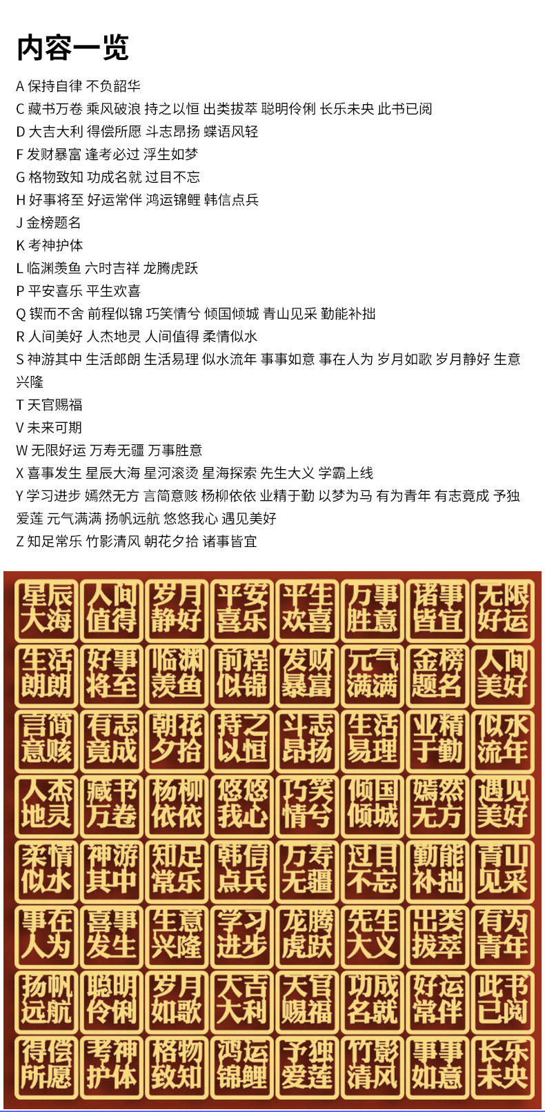 | Color | Maintain self-discipline,Not living up to your time,Collection of books,Riding the wind and waves,Changle is not yet ended,Perseverance,Outstanding,This book has been read,Clever,Great Gedali,get what you want,Butterfly wind light,Fighting spirit,get rich,Every exam must pass,Floating like a dream,To Know,Success and fame,Never forget,Good things will come,Han Xin Point Soldier,Often accompanied by good luck,Hongyun Koi,To be no. 1,Kao Shen Protects Body,Linyuan fish,Six auspicious,Dragon and Tiger Leap,Peace and joy,Life Joy,A bright future,Qiao Laugh,Perseverance,Diligence can make up for weakness,See the green hills,Allure,The world is beautiful,Worthy on earth,outstanding people,tender like water,Fanting among them,Life Lang Lang,Life is easy to reason,Brisk business,Time that flies,Everything goes well,Man-made things,The years are quiet.,Years as a song,Blessed by Heaven,Everything wins,boundless longevity,Future can be,Unlimited Luck,happy event happened,Mr. Righteousness,Star Sea,Xinghai Exploration,Xinghe is boiling hot,Xueba Online,learning progress,No way to smile,Concise and to the point,Sail away,Yangliu Yiyi,Industry is good at diligence,Dreams are horses.,Long my heart,promising youth,There is a will to achieve,To Duai Lian,Meet the beautiful,Full of vitality,contentment,Everything is appropriate,Bamboo Shadow Breeze,Flowers in the morning and flowers in the evening |