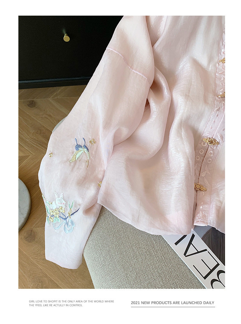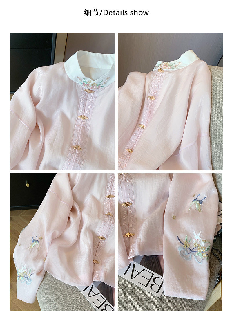 New Chinoiserie Pink Embroidered Stand-Up Collar Long-Sleeved Shirt for Women 2025 Spring & Fall National Style Gentle and Sweet Elegant Light Top