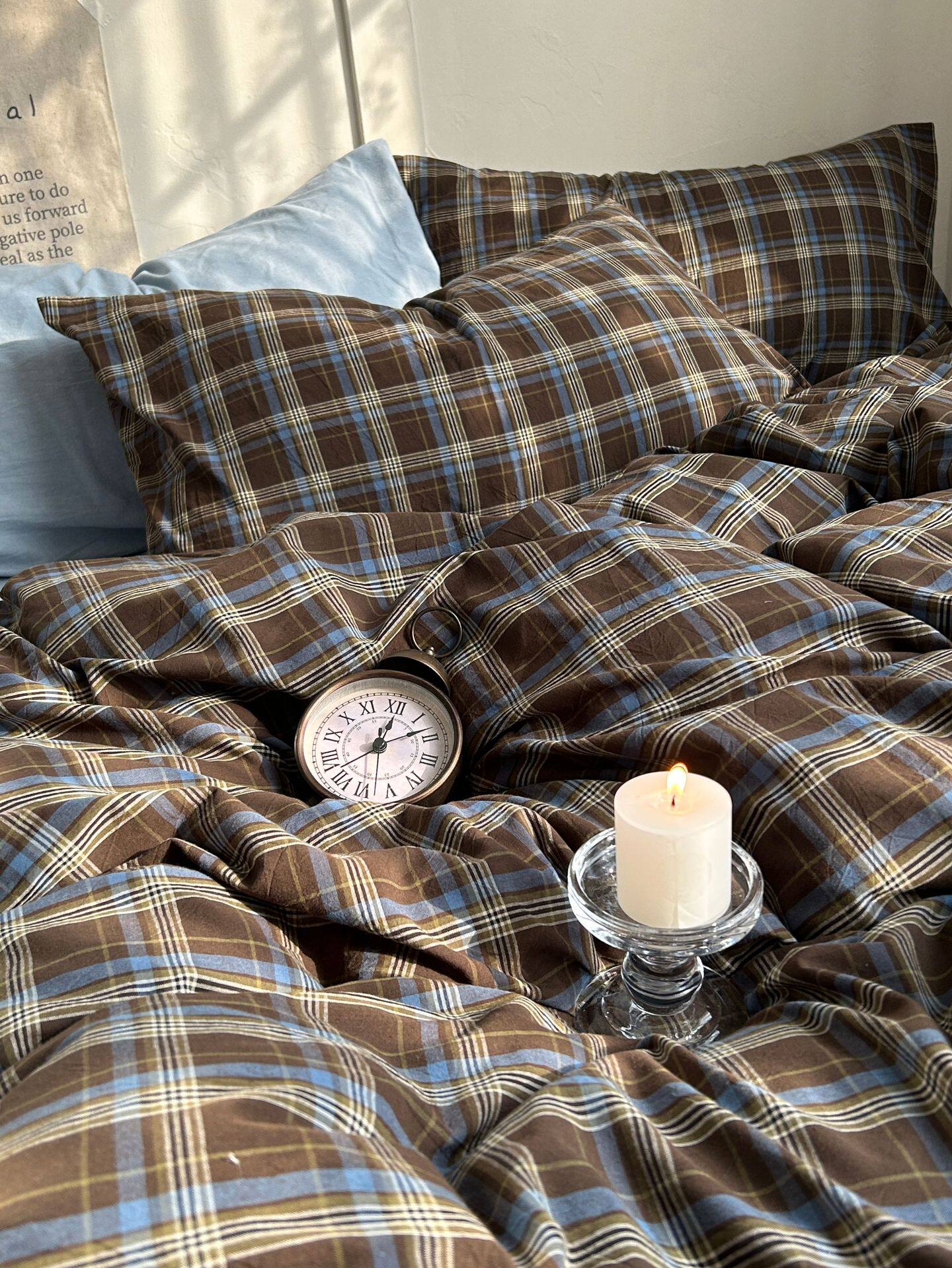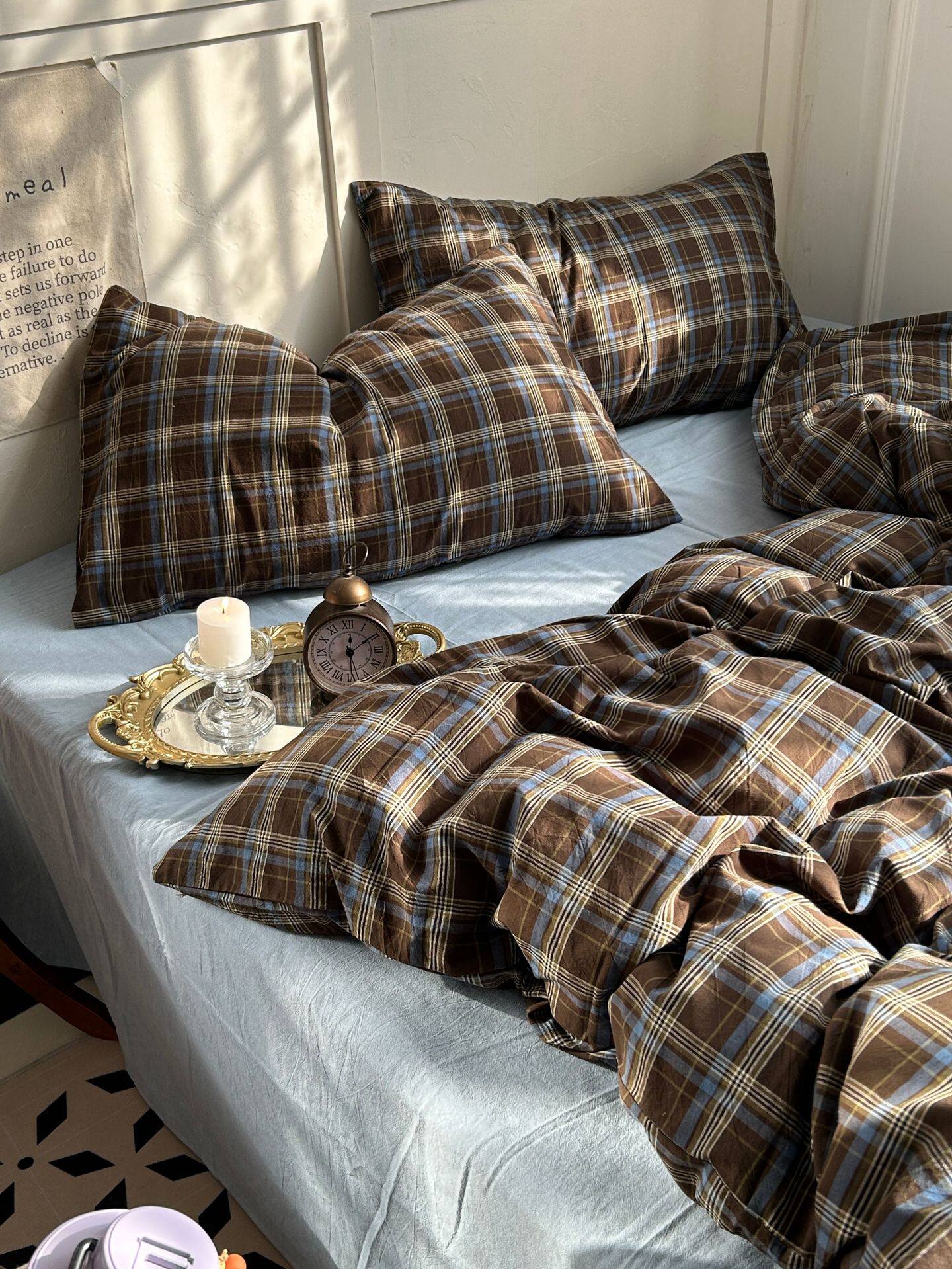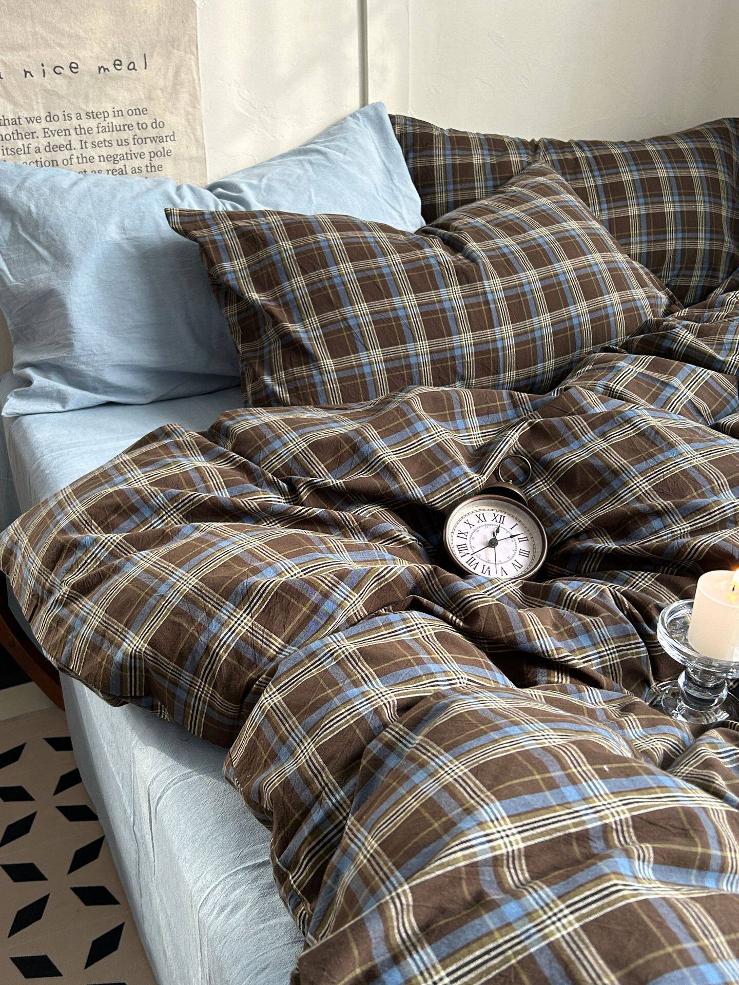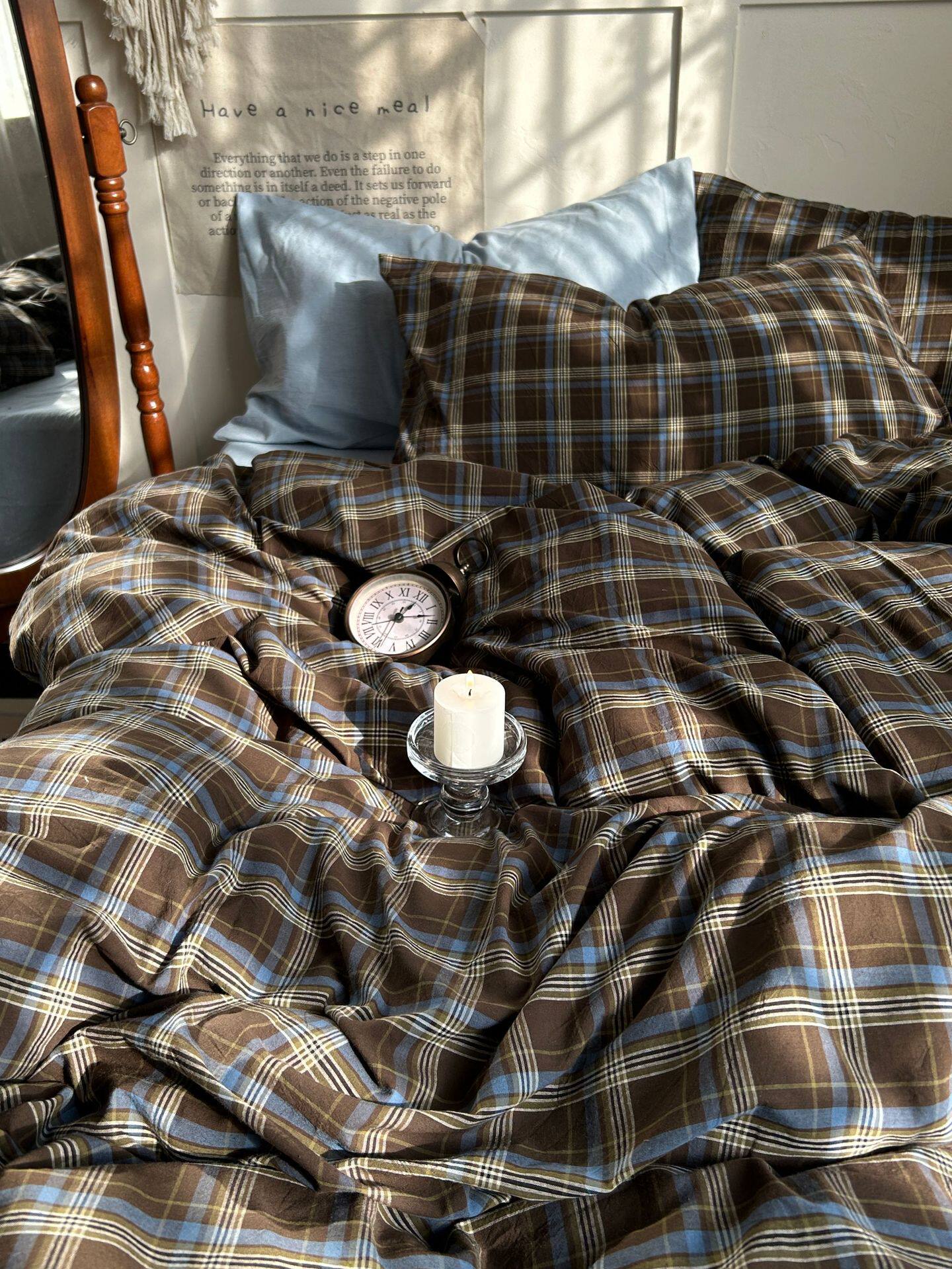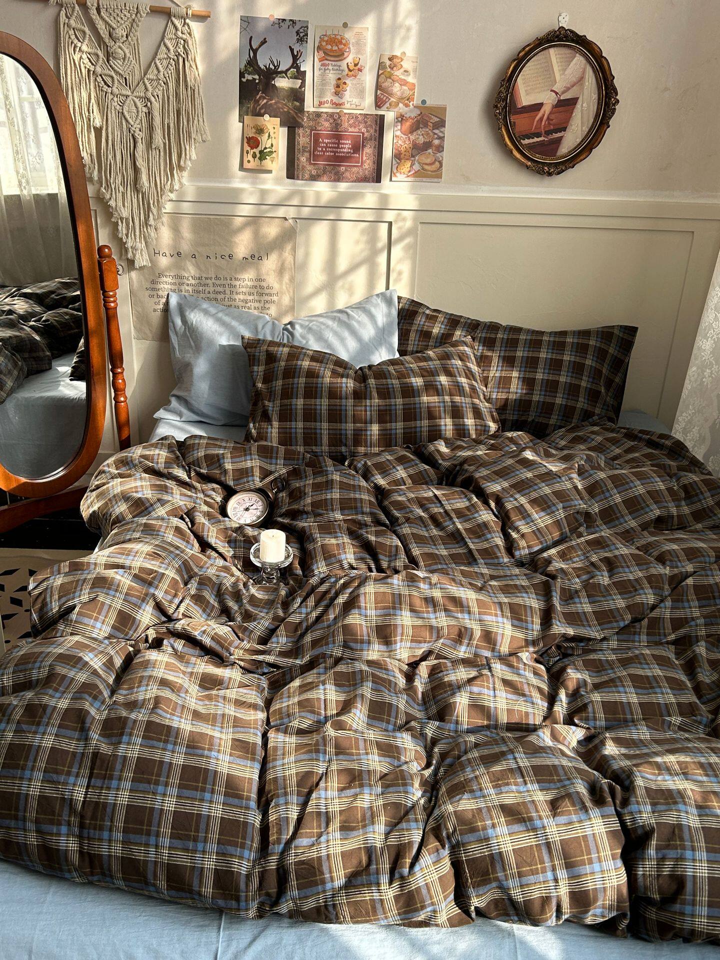 Ins Blogger with Maillard Mix Plaid Cotton Four-piece Set Retro Artistic Striped Yarn-dyed Washed Cotton