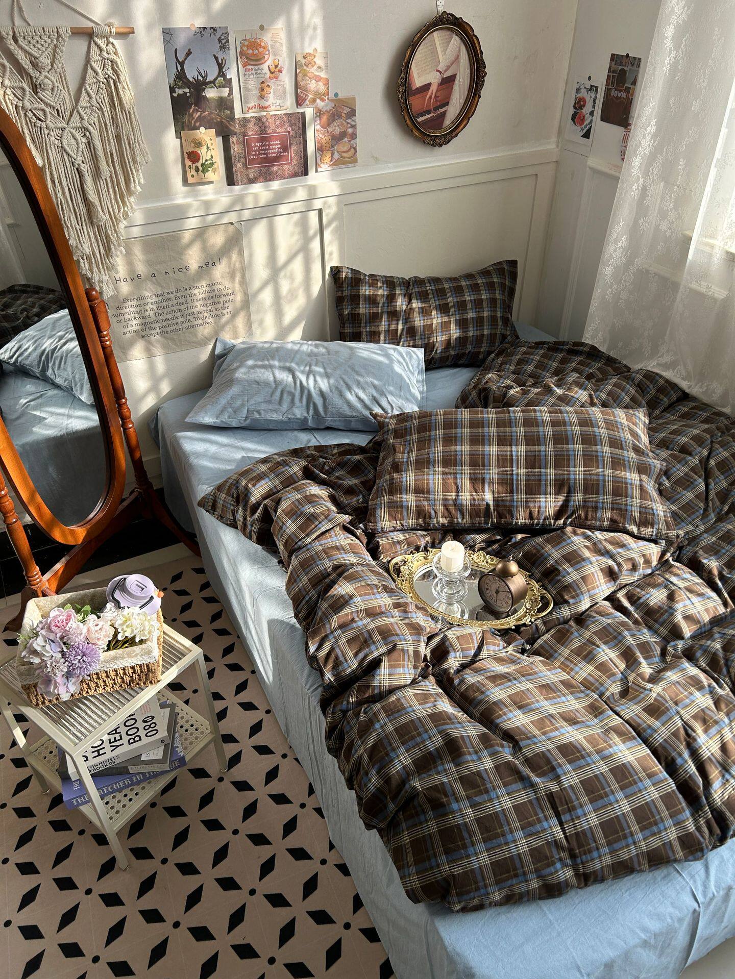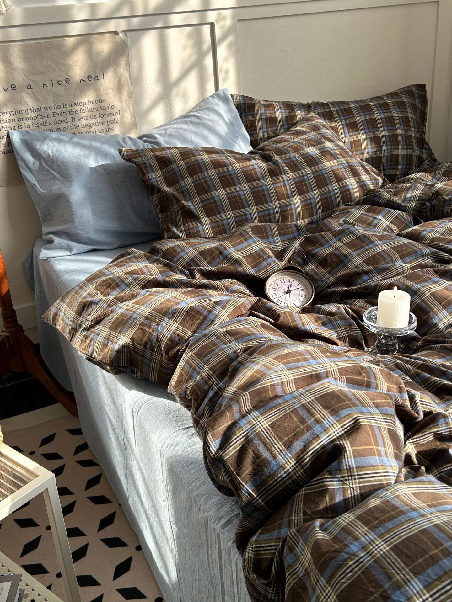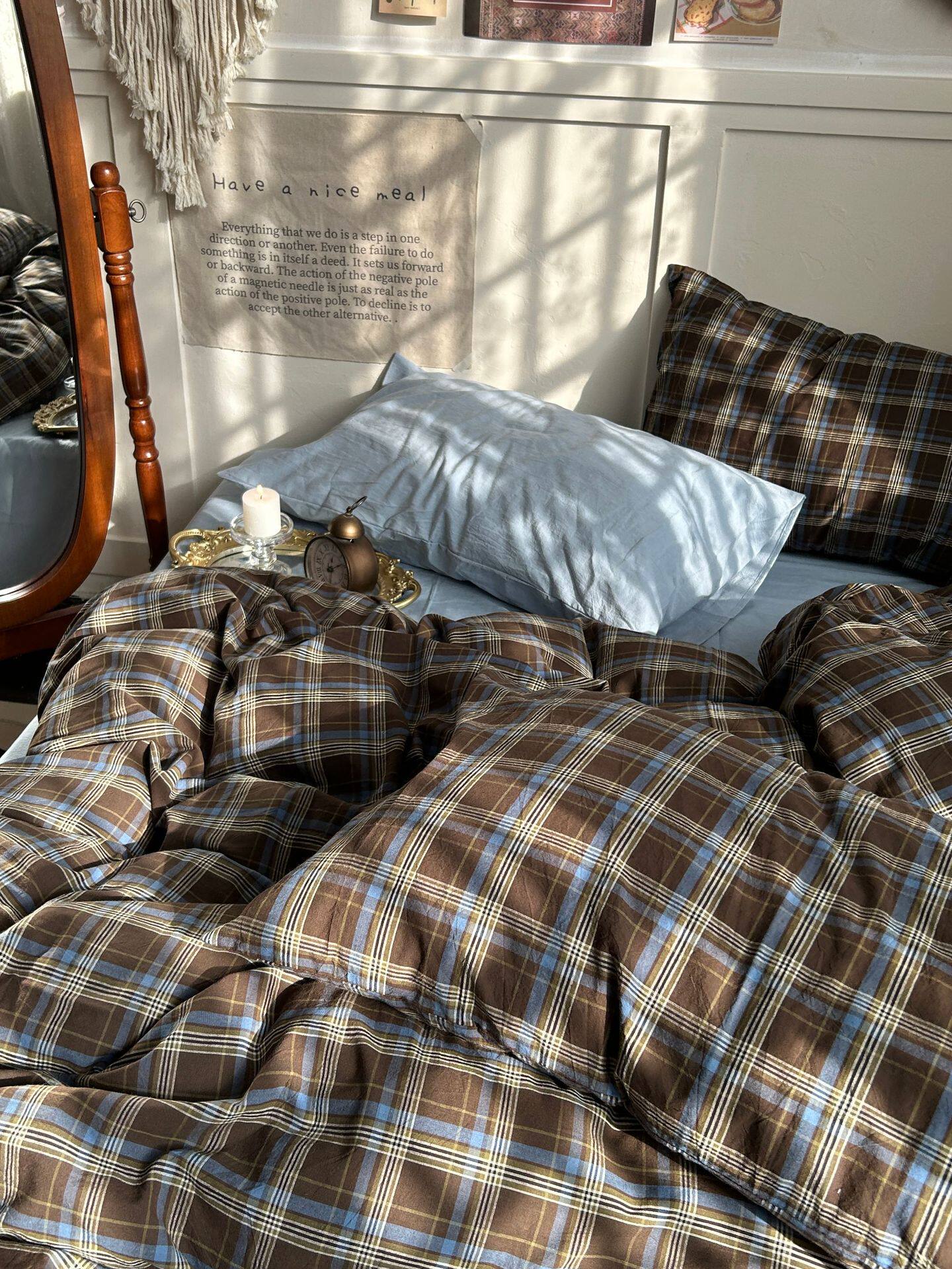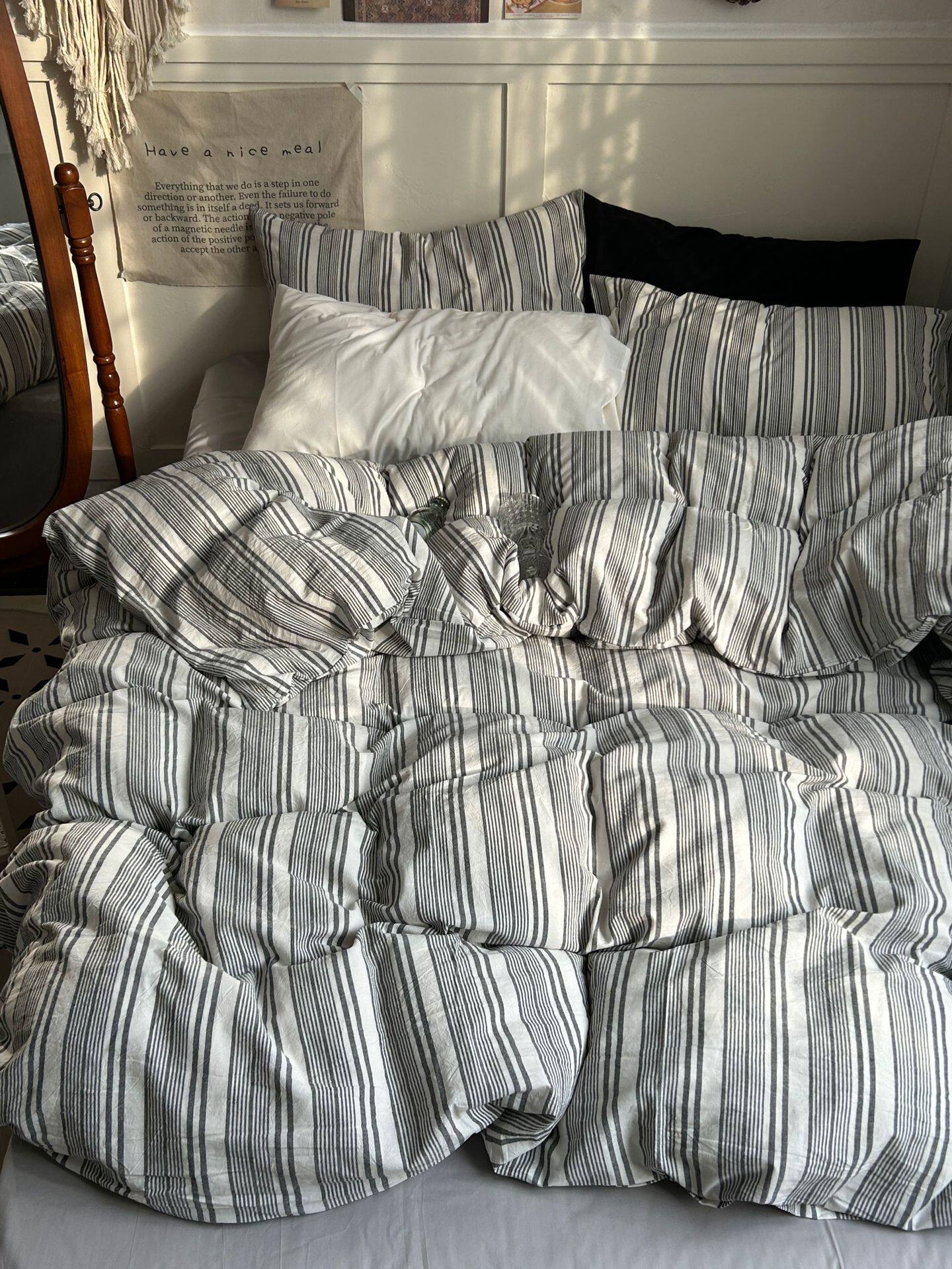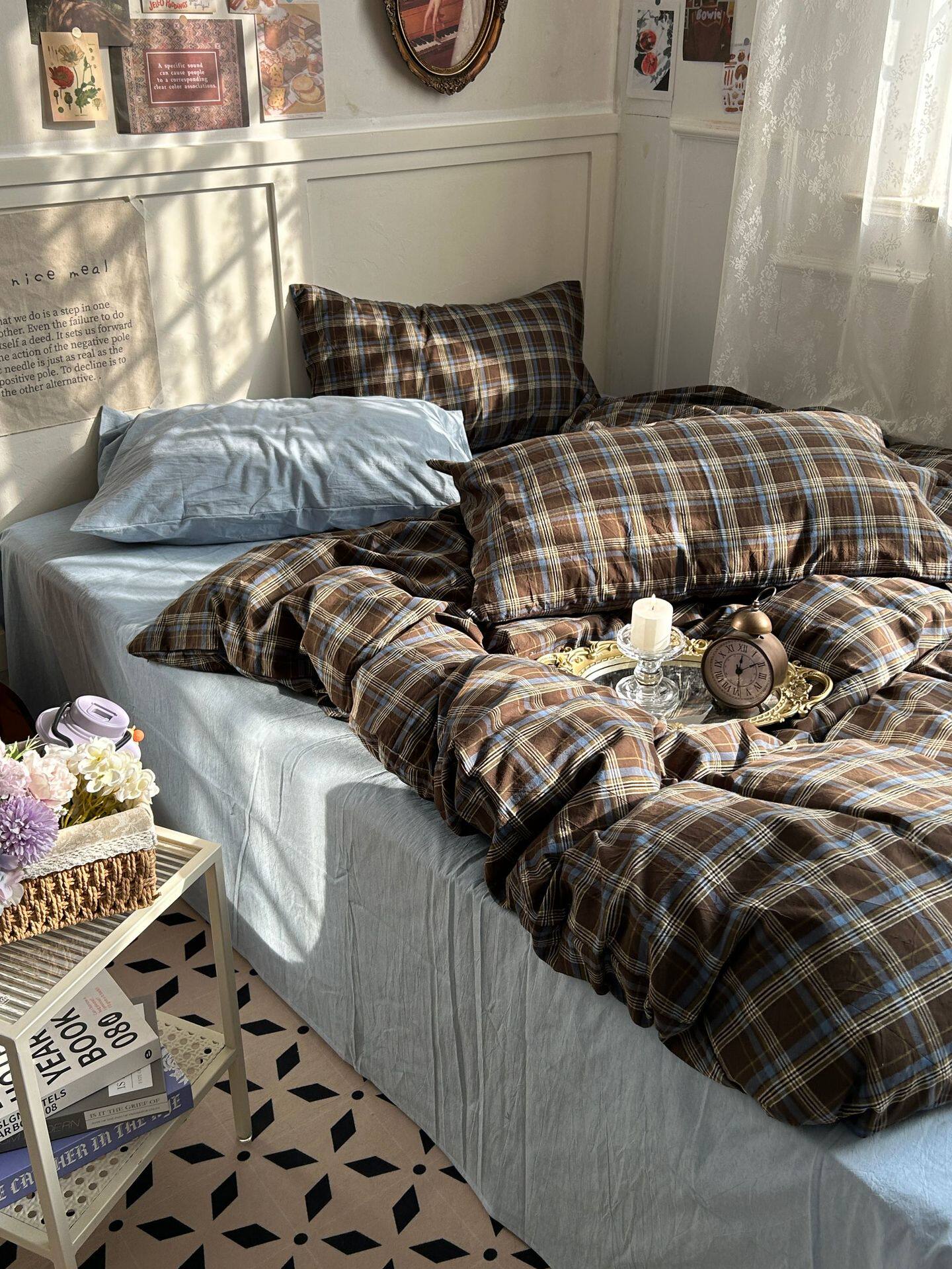 Ins Blogger with Maillard Mix Plaid Cotton Four-piece Set Retro Artistic Striped Yarn-dyed Washed Cotton