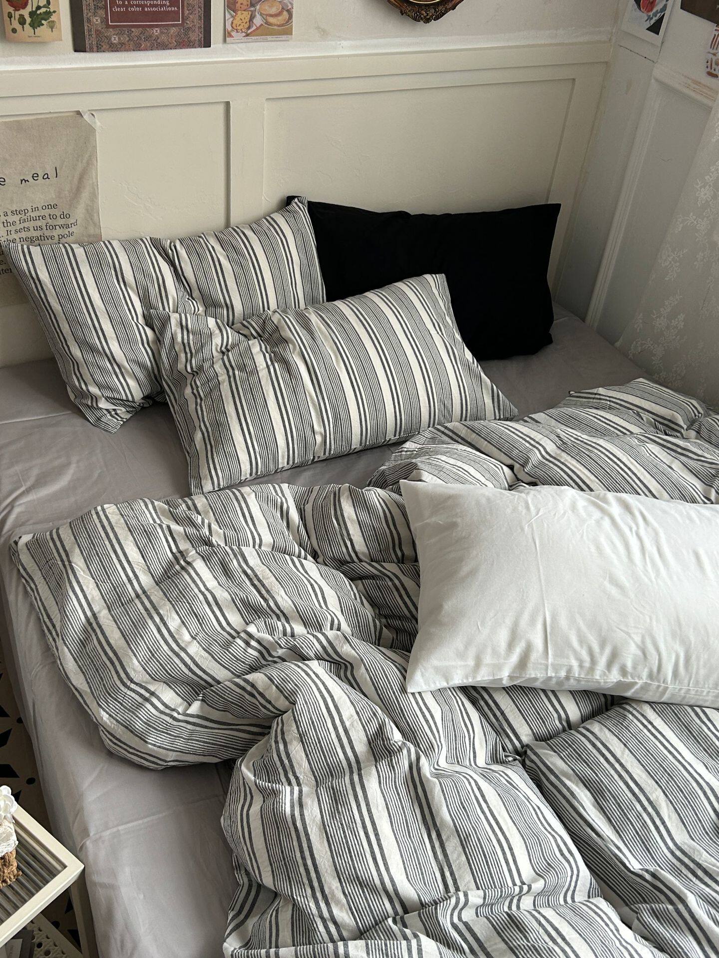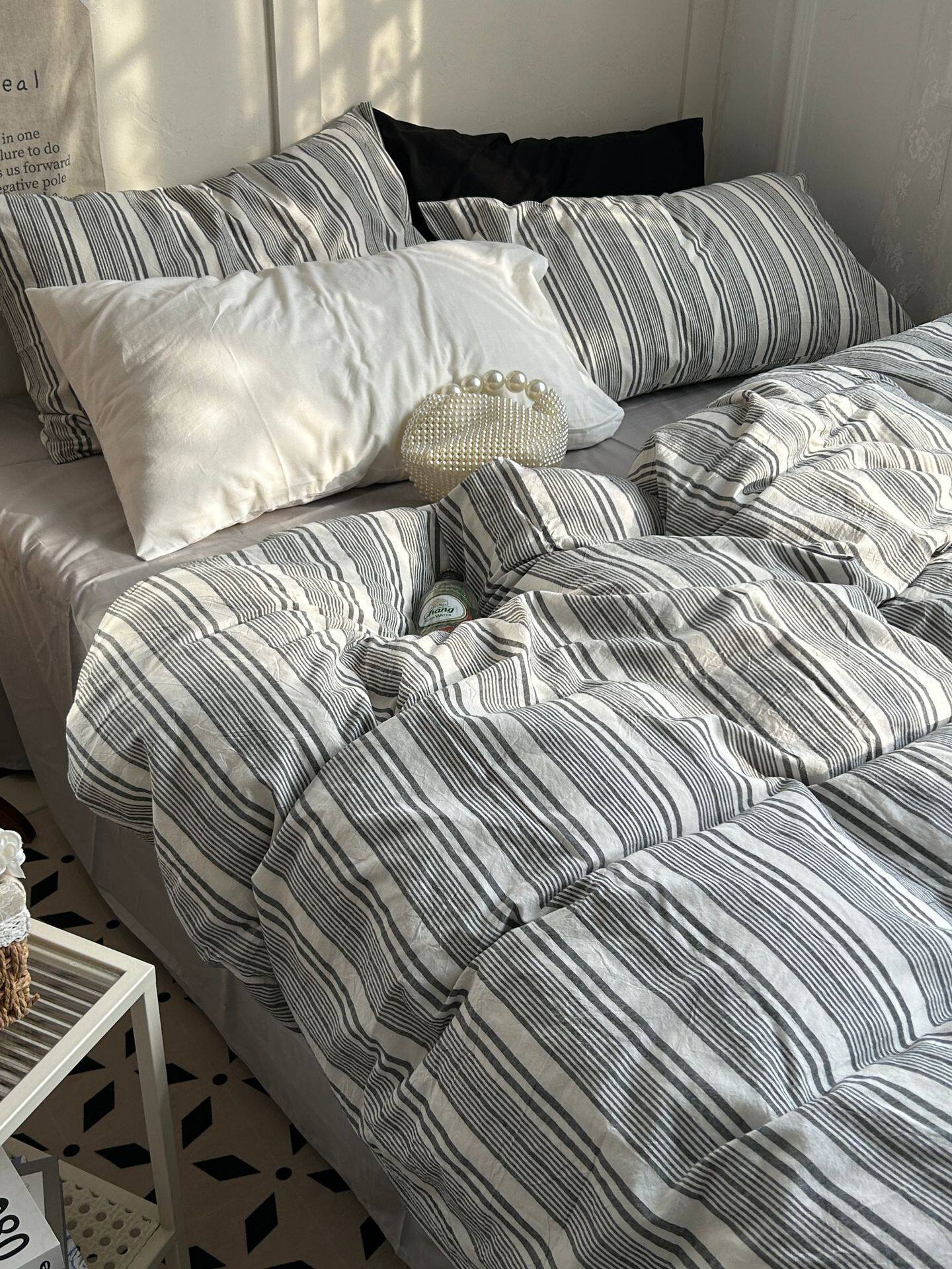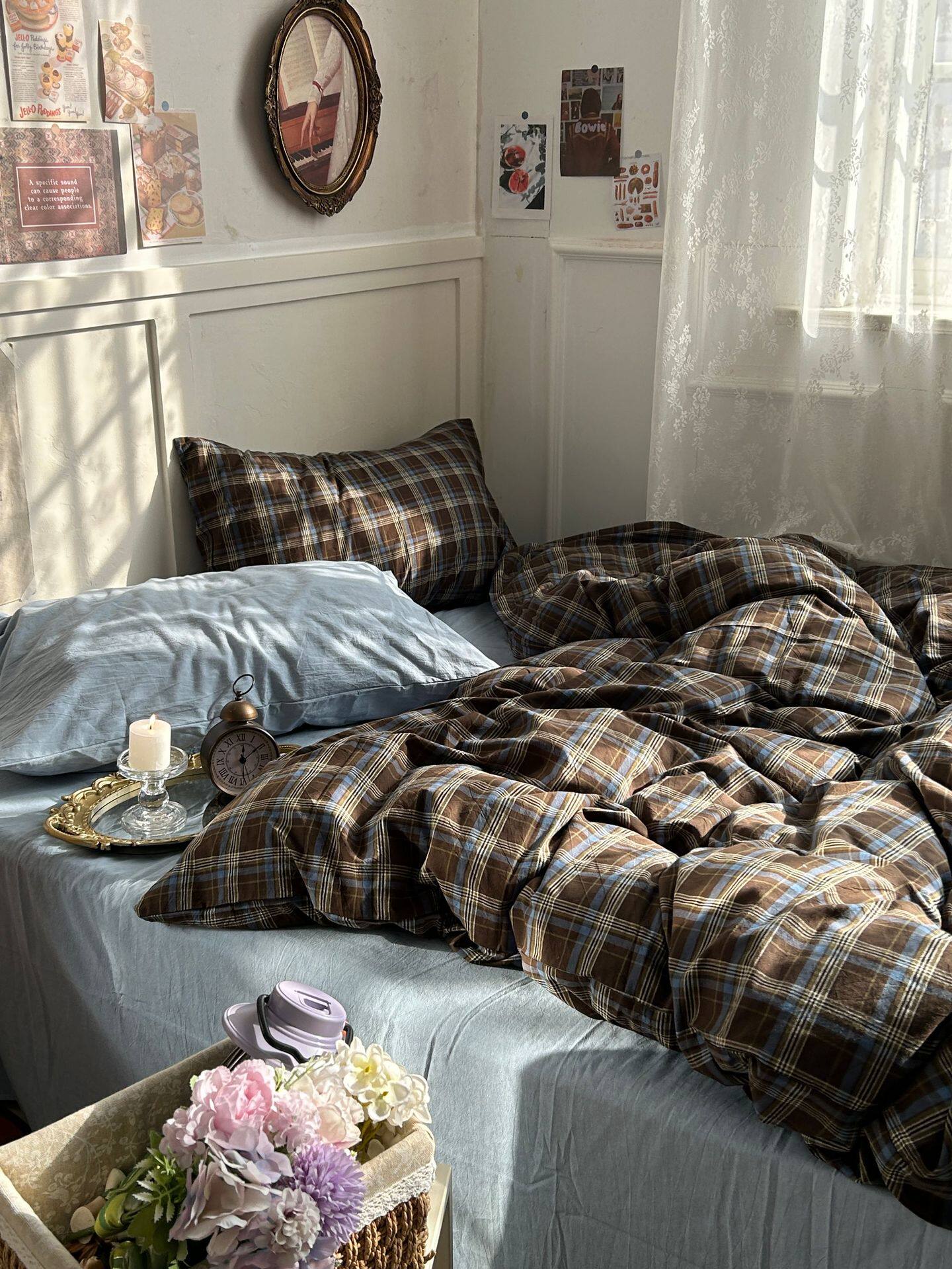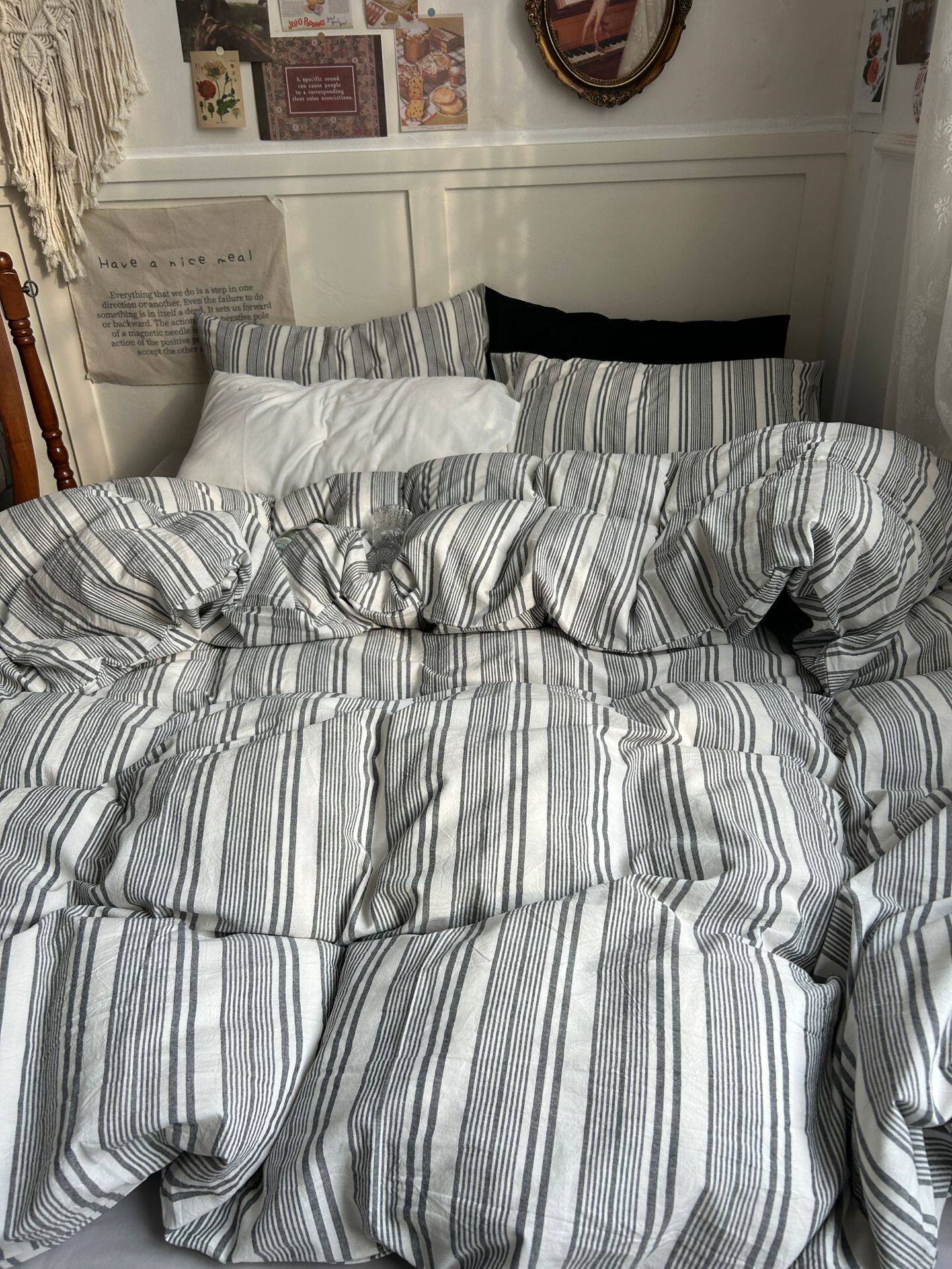 Ins Blogger with Maillard Mix Plaid Cotton Four-piece Set Retro Artistic Striped Yarn-dyed Washed Cotton