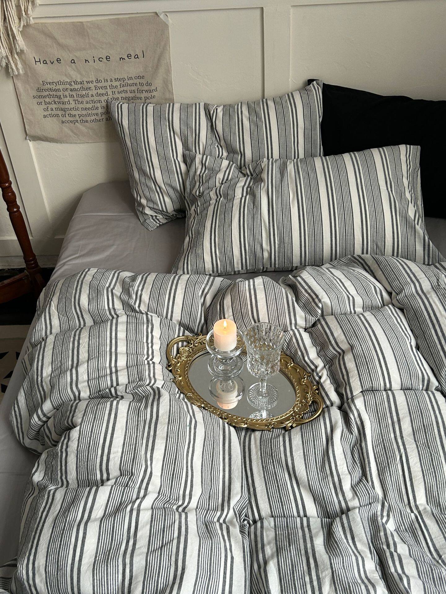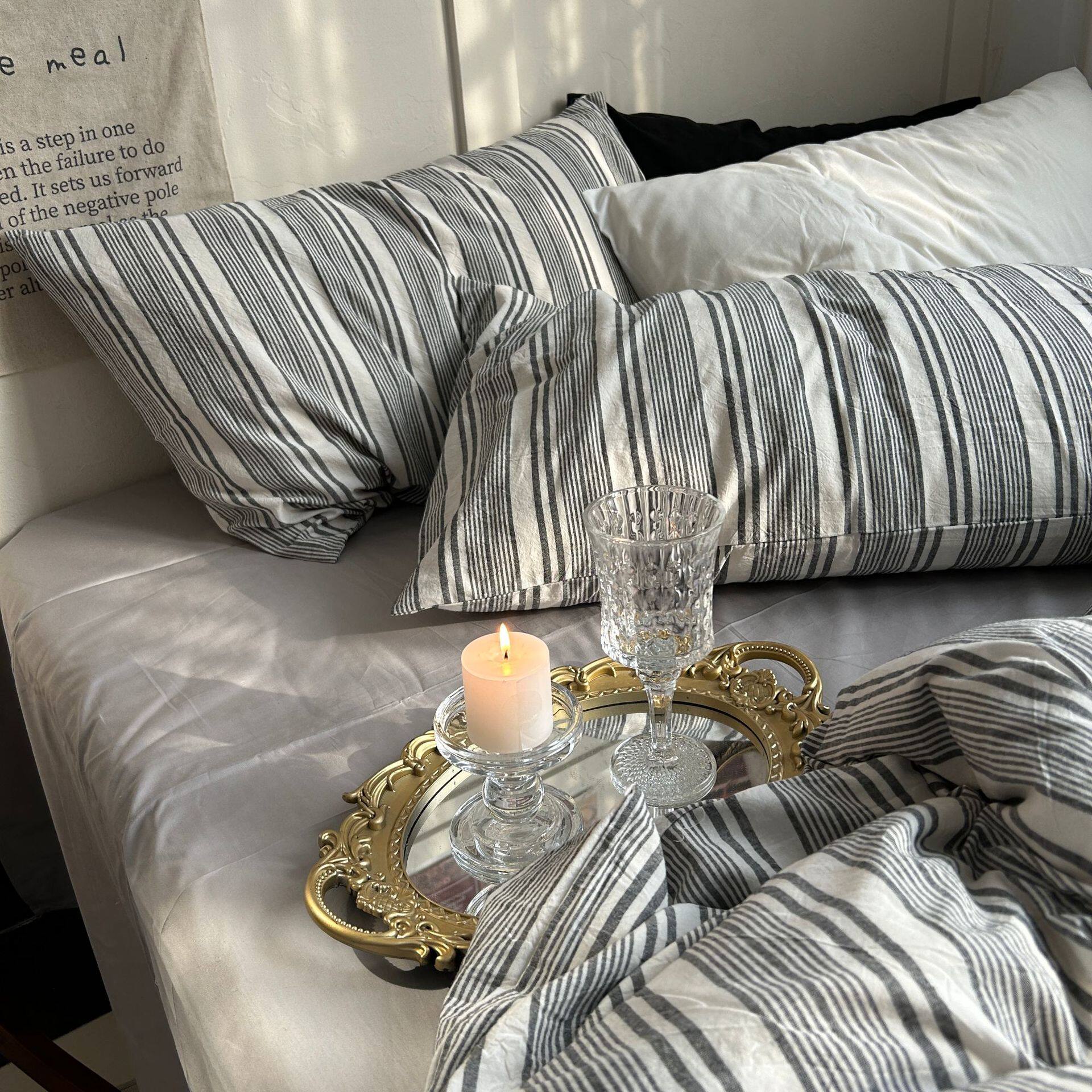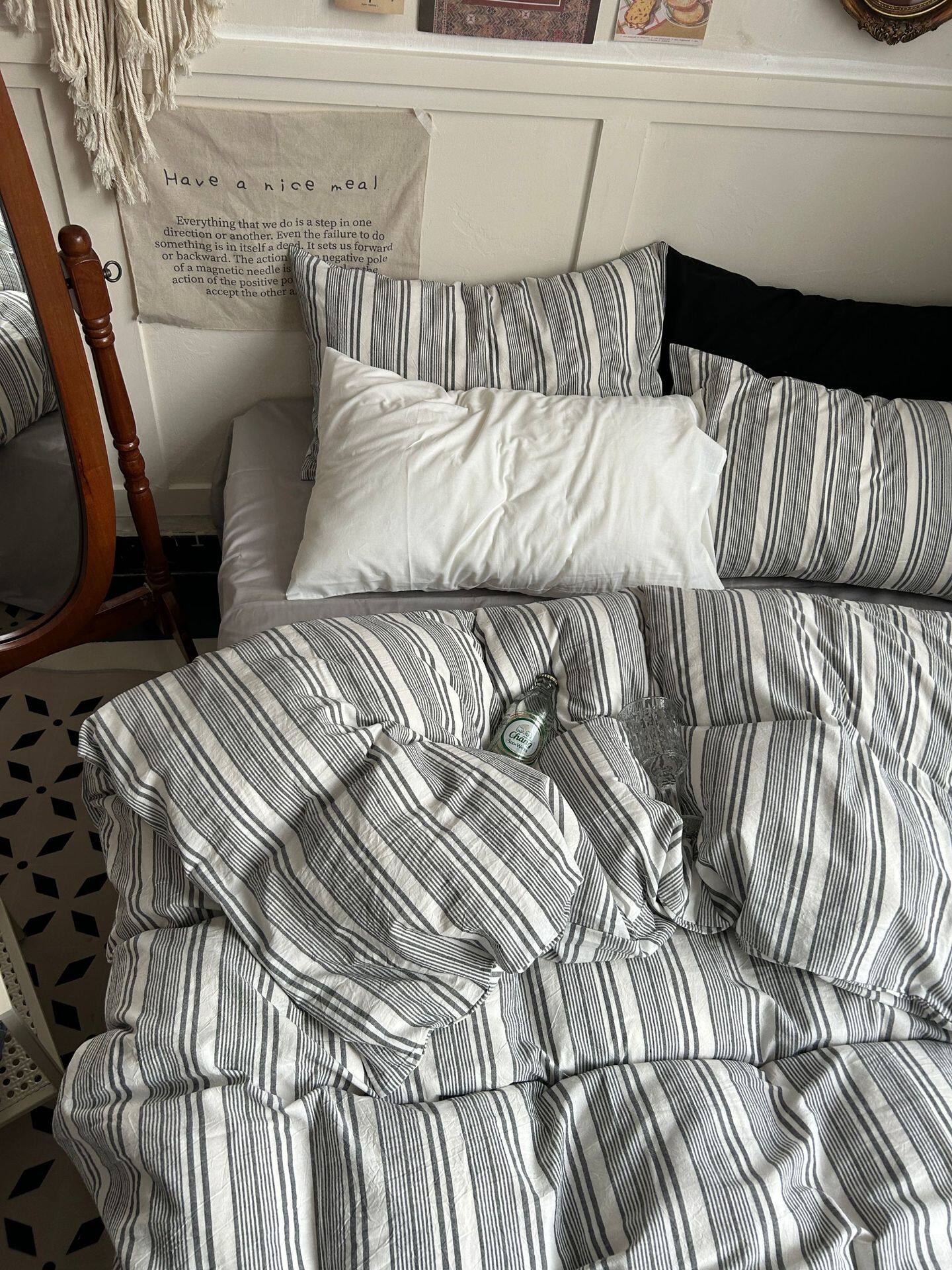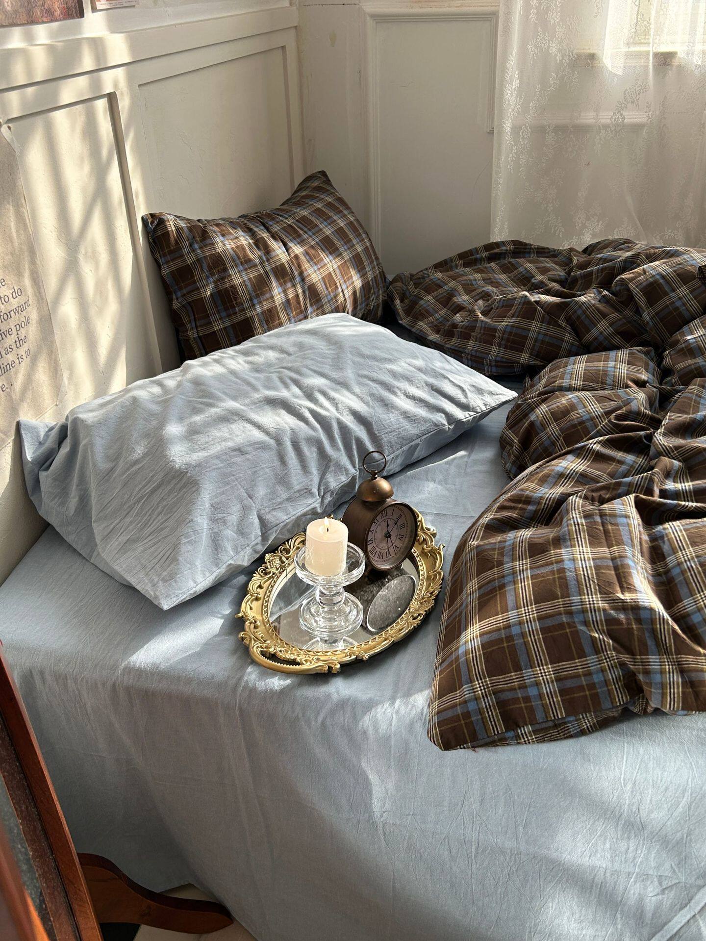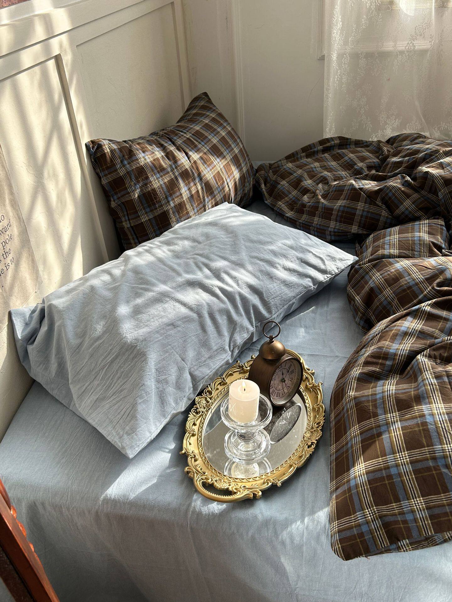 Ins Blogger with Maillard Mix Plaid Cotton Four-piece Set Retro Artistic Striped Yarn-dyed Washed Cotton