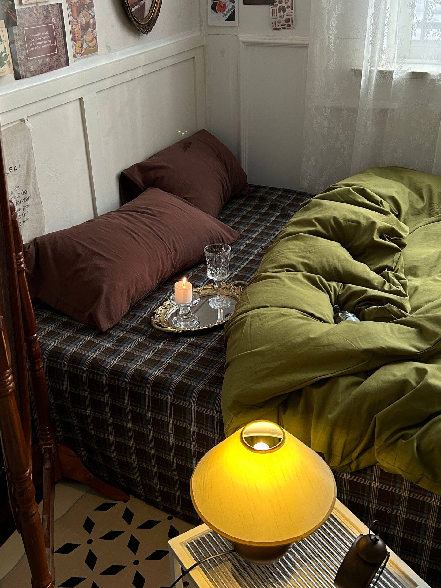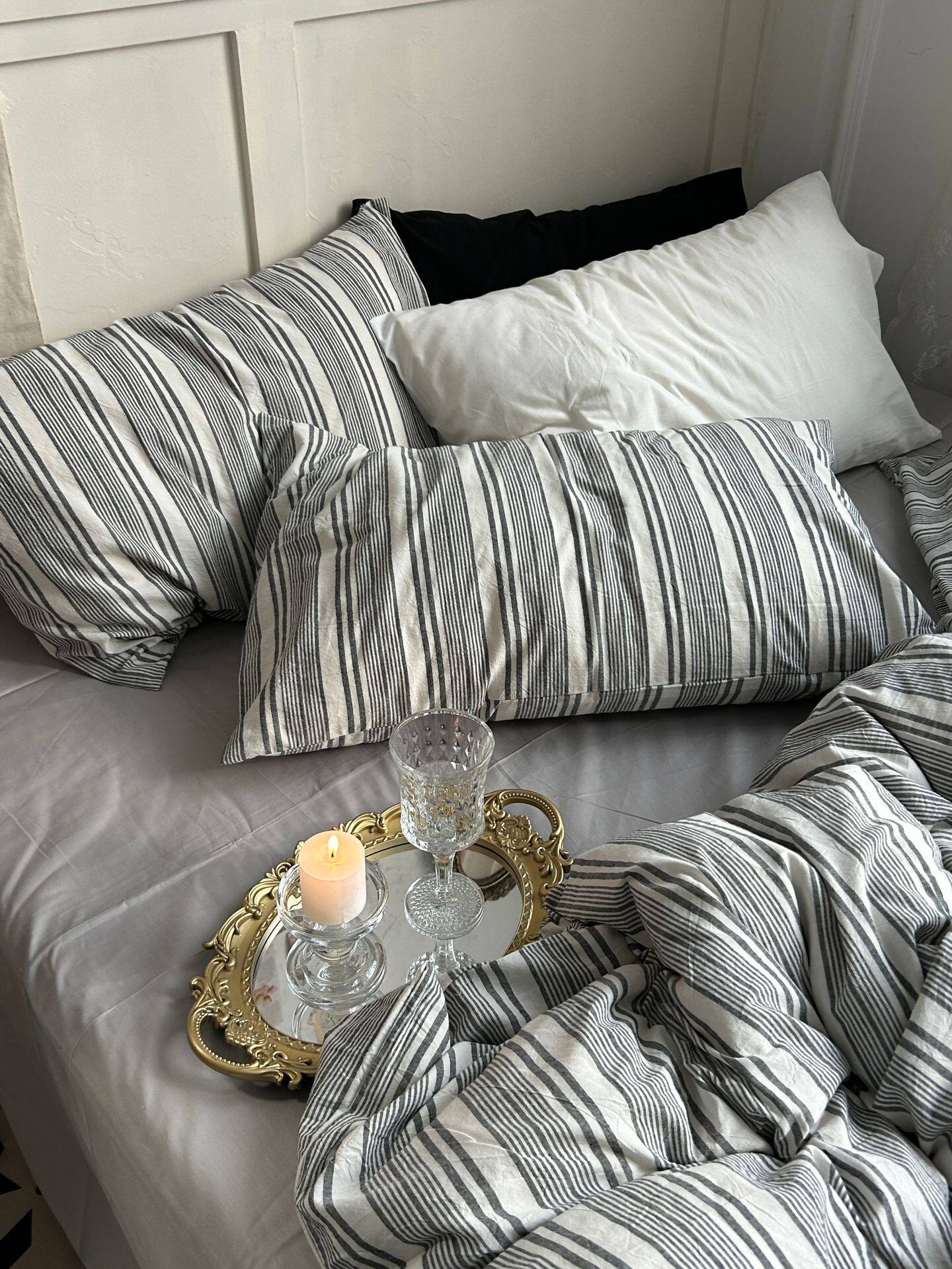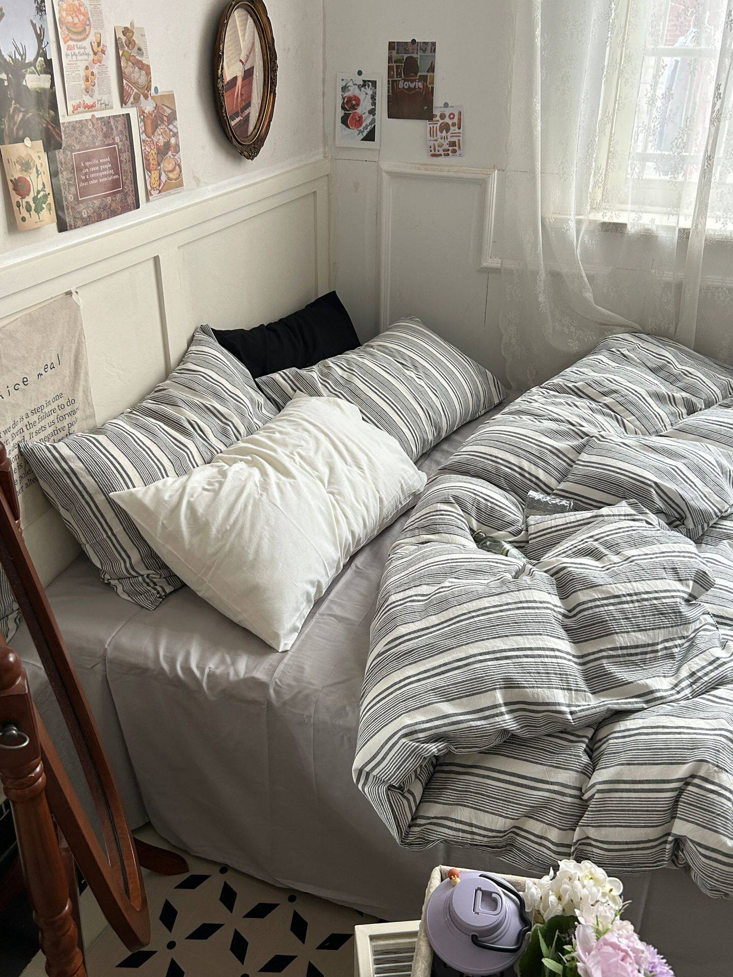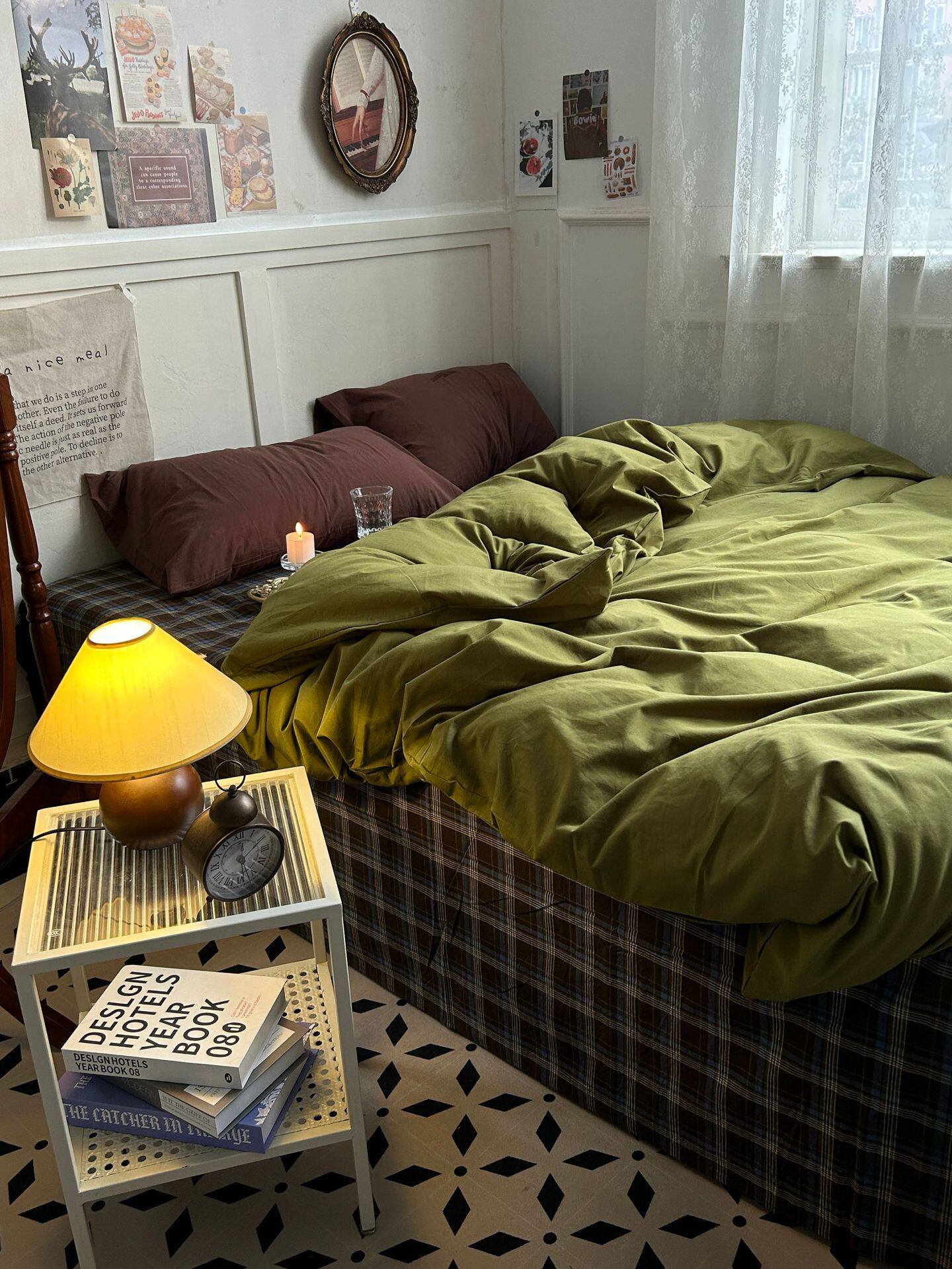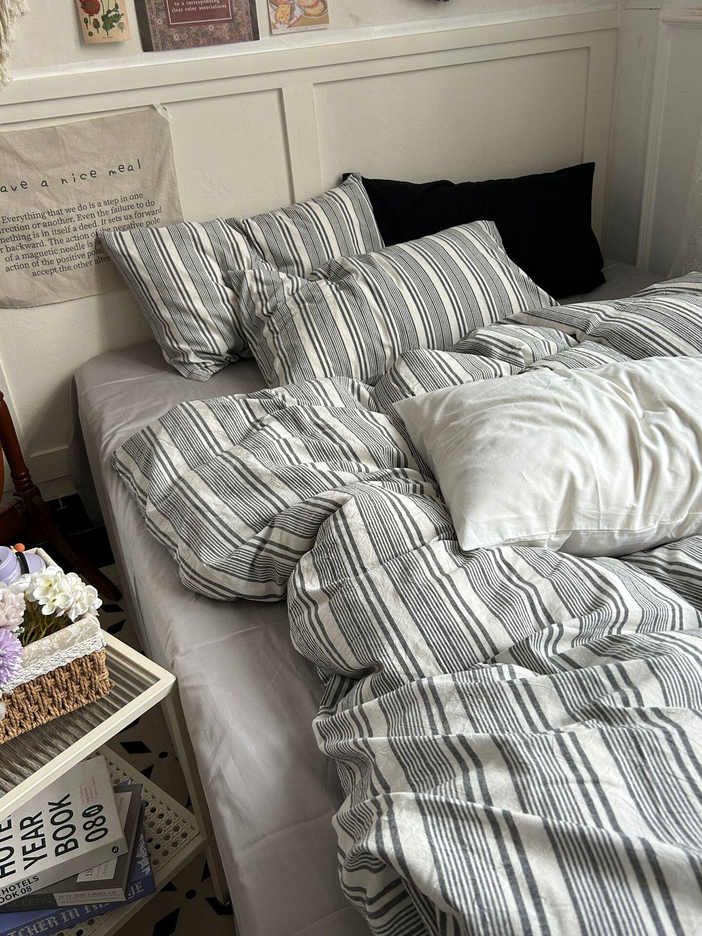 Ins Blogger with Maillard Mix Plaid Cotton Four-piece Set Retro Artistic Striped Yarn-dyed Washed Cotton