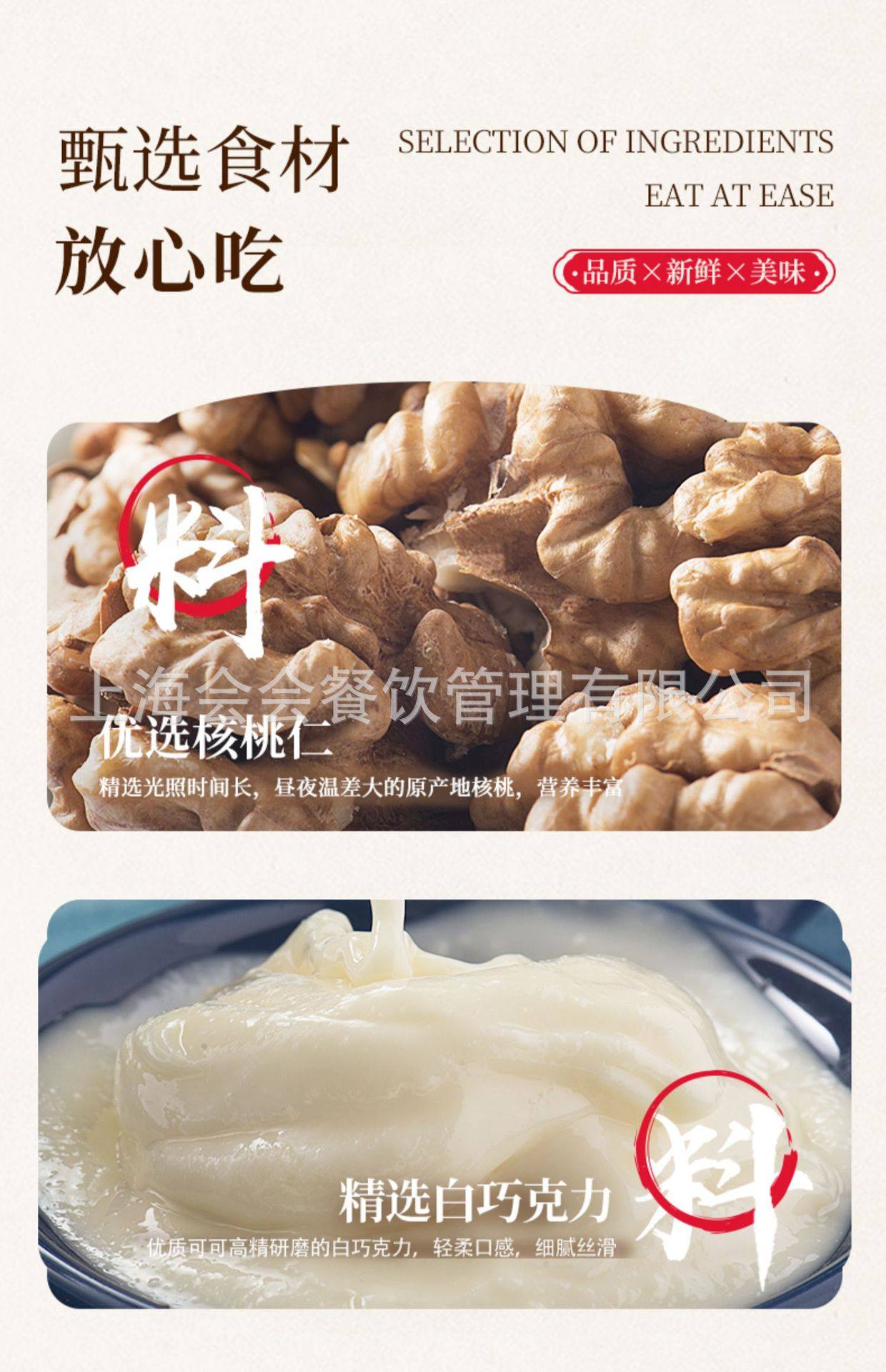 | Raw materials and ingredients | Wheat flour, water, cocoa butter substitute chocolate, crisping oil, walnut kernels, prepared sugar (red sugar, brown sugar), compound cheese flour, yeast for food processing, etc |