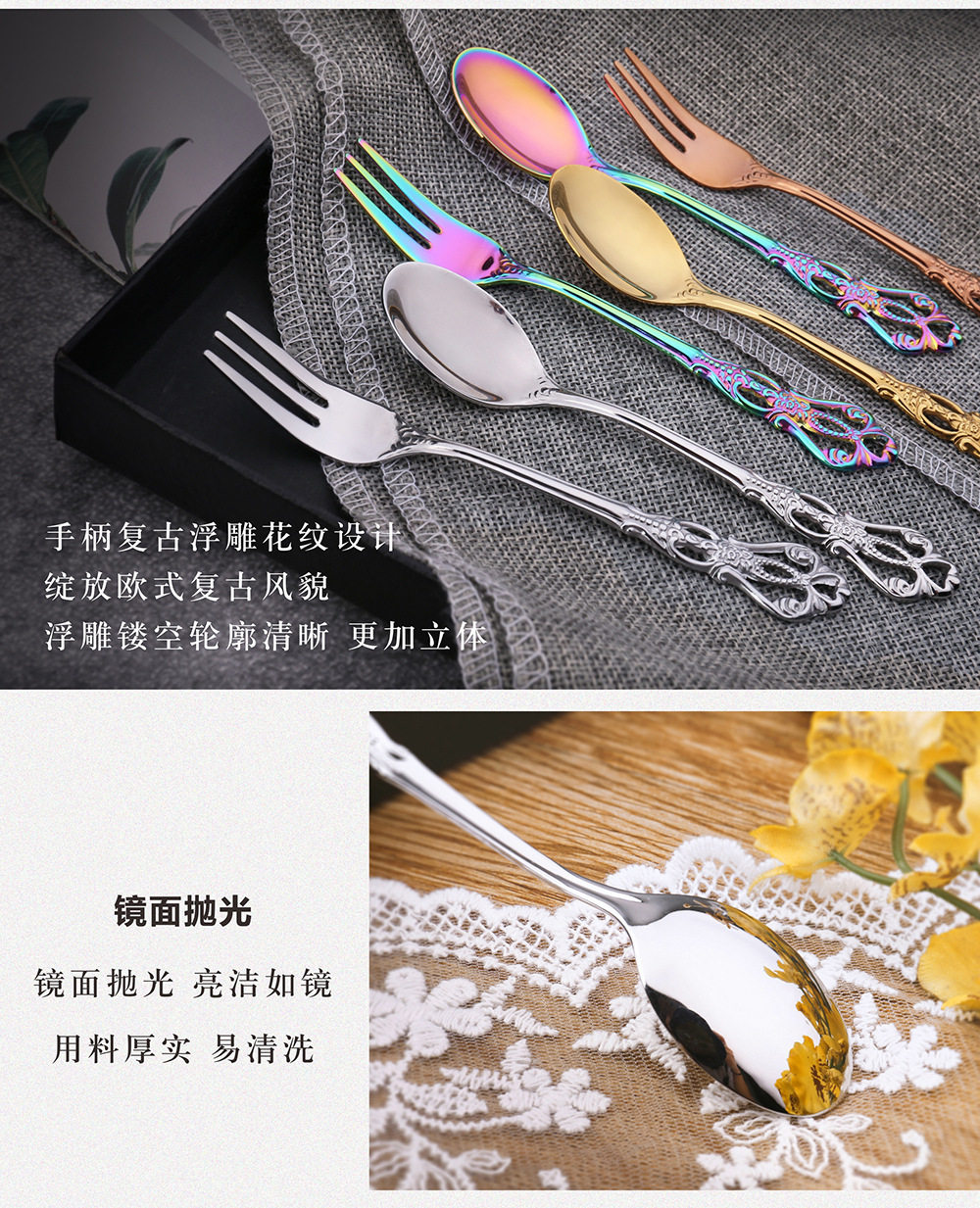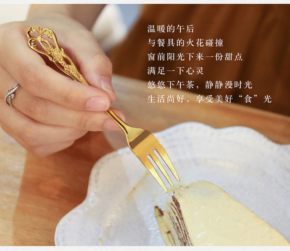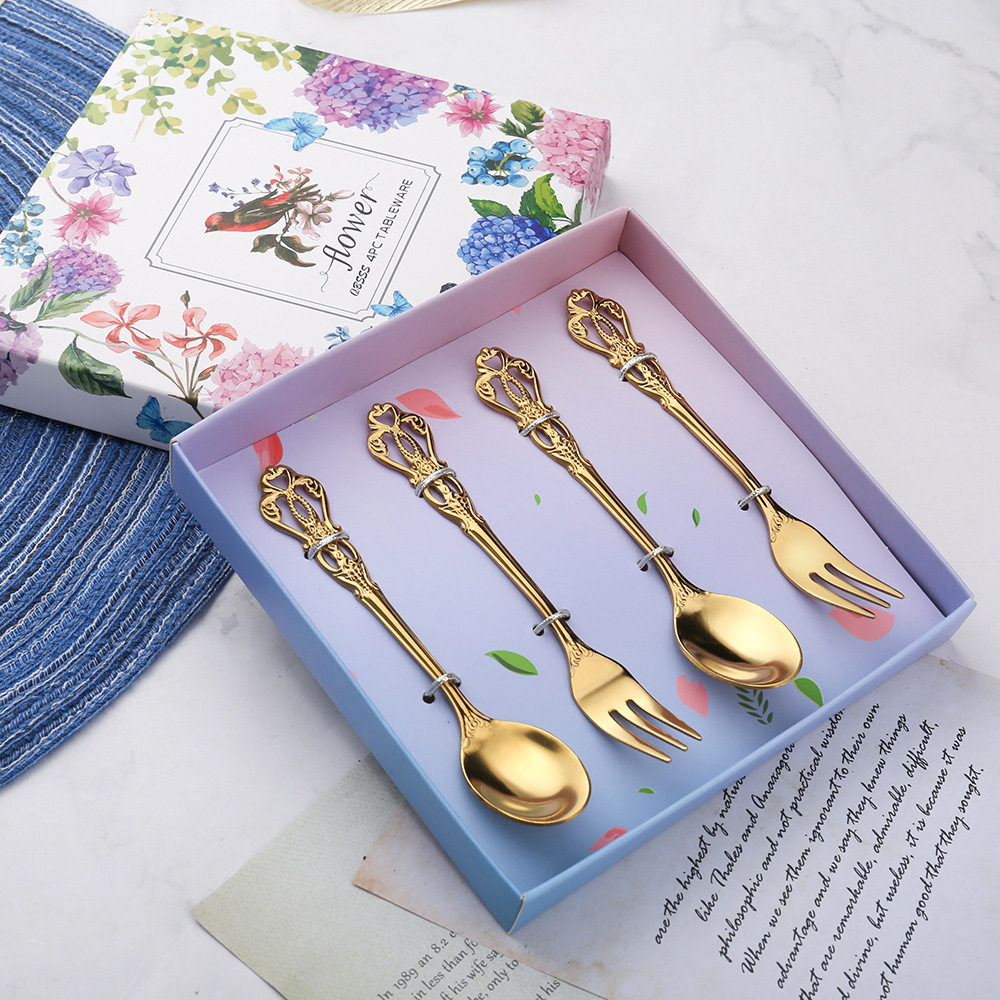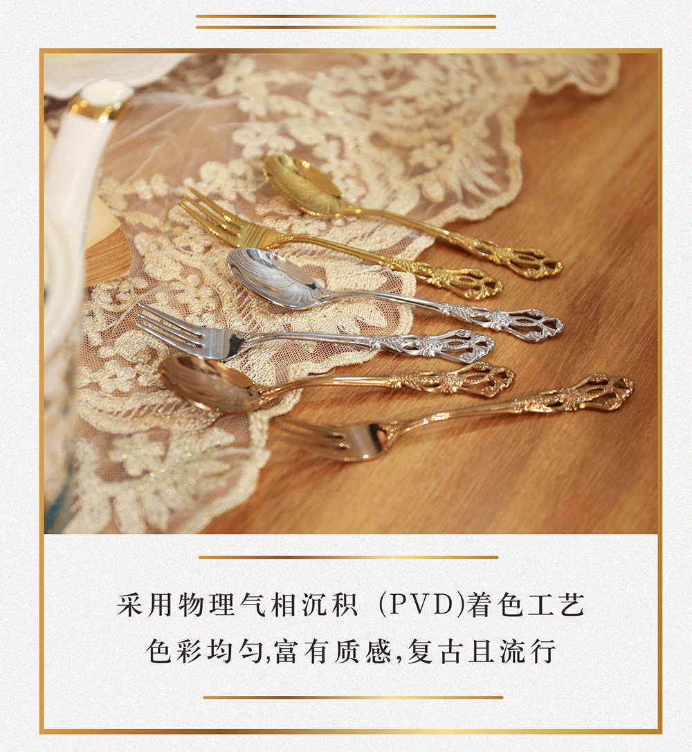 Royal Court hollow relief dessert spoon three-tooth fork stirring spoon suit European-style carved tableware gift retro spoon