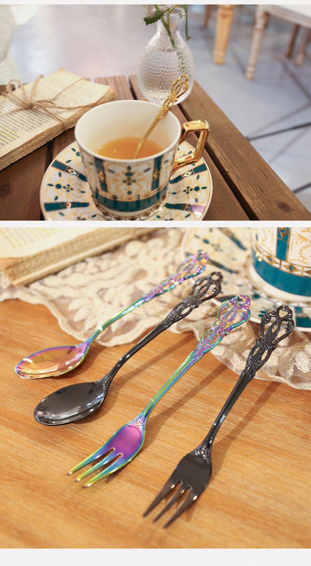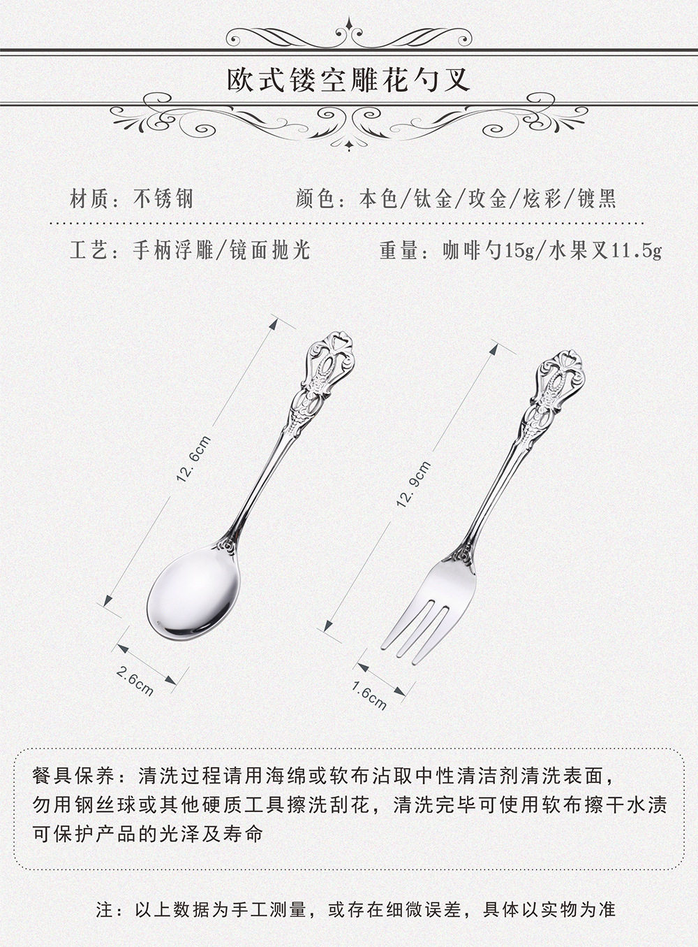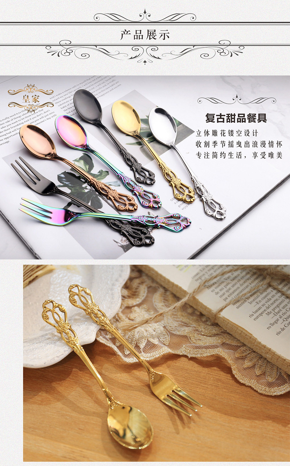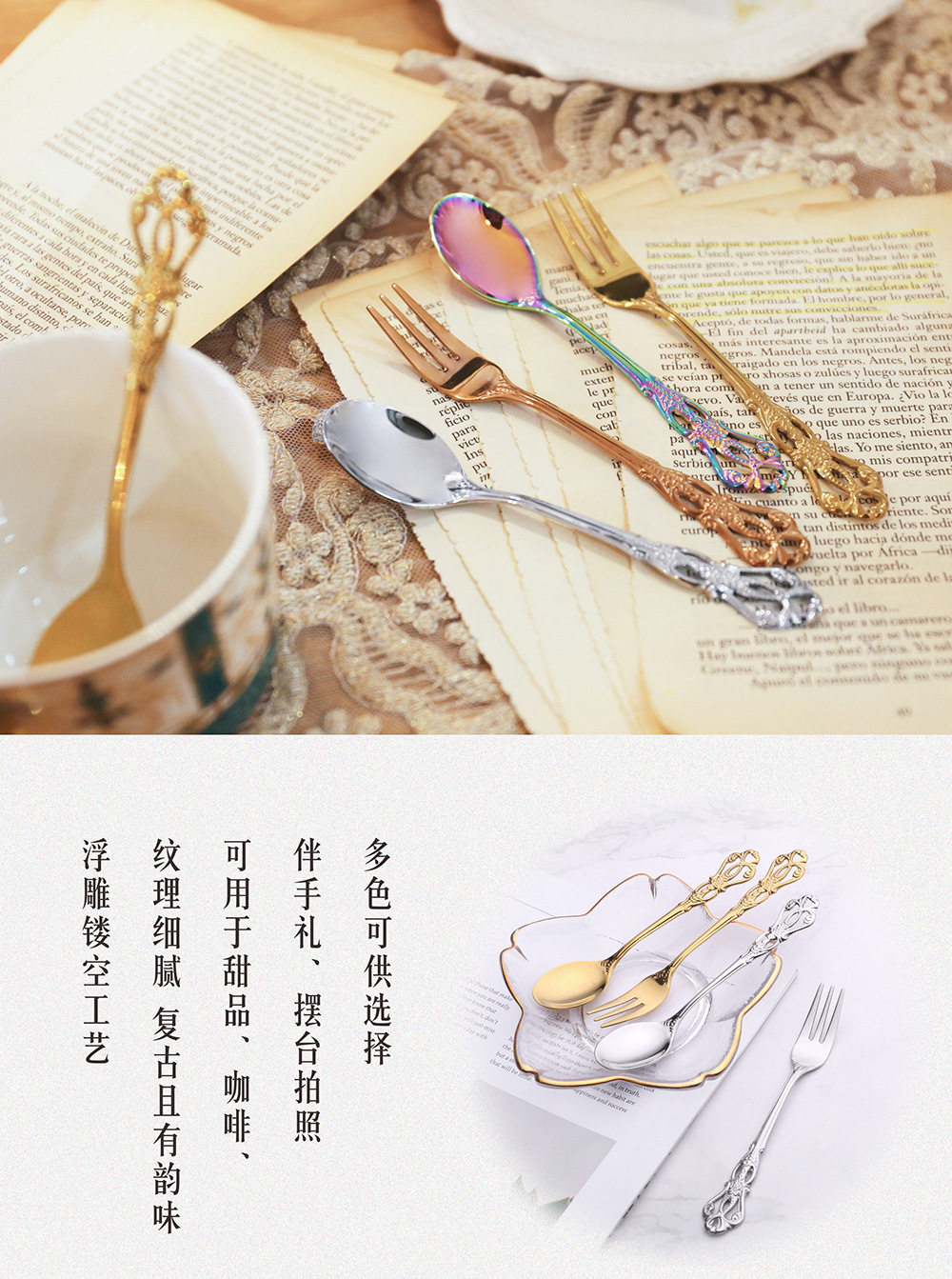 Royal Court hollow relief dessert spoon three-tooth fork stirring spoon suit European-style carved tableware gift retro spoon