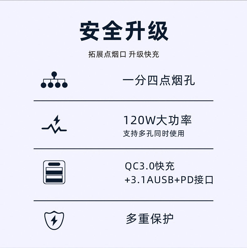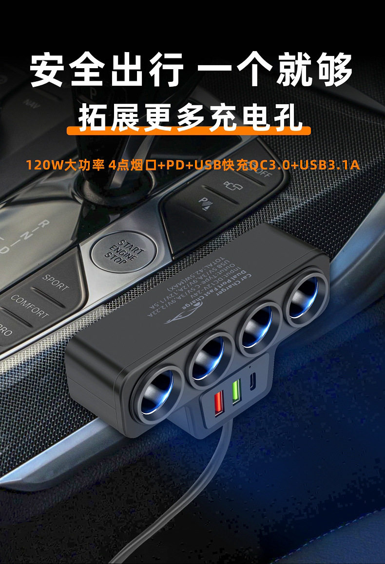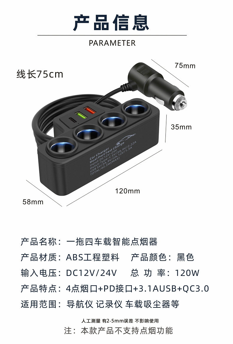 | Model | 4 cigarette lighter holes + Dual USB + PD |