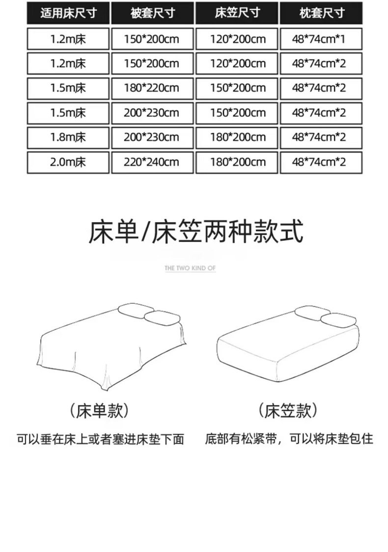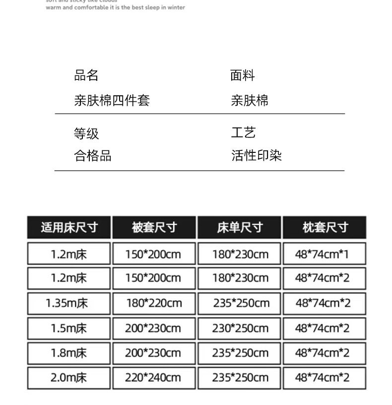 Dimensions 0.9m bed sheet three-piece set (quilt cover 150x200cm, bed sheet 180x230cm, 1 pillowcase),1.2m bed sheet three-piece set (quilt cover 150x200cm, bed sheet 180x230cm, 1 pillowcase),1.5m bed sheet four-piece set (quilt cover 150x200cm, bed sheet 180x230cm, 2 pillowcases),1.5m bed sheet four-piece set (quilt cover 150x200cm, bed sheet 230x250cm, 2 pillowcases),1.8m bed sheet four-piece set (quilt cover 180x220cm, bed sheet 230x250cm, 2 pillowcases),2.0m bed sheet four-piece set (quilt cover 200x230cm, bed sheet 235x250cm, 2 pillowcases),2.2m bed sheet four-piece set (quilt cover 220x240cm, bed sheet 235x250cm, 2 pillowcases),1.2m fitted sheet three-piece set (quilt cover 150x200cm, fitted sheet 120x200cm, 1 pillowcase),1.5m fitted sheet set of four (quilt cover 150x200cm, fitted sheet 150x200cm, 2 pillowcases),1.5m fitted sheet set of four (quilt cover 180x220cm, fitted sheet 150x200cm, 2 pillowcases),1.5m fitted sheet set of four (quilt cover 200x230cm, fitted sheet 150x200cm, 2 pillowcases),1.8m fitted sheet set of four (quilt cover 180x220cm, fitted sheet 180x200cm, 2 pillowcases),1.8m fitted sheet set of four (quilt cover 200x230cm, fitted sheet 180x200cm, 2 pillowcases),1.8m fitted sheet set of four (quilt cover 220x240cm, fitted sheet 180x200cm, 2 pillowcases),Same style individual quilt cover [150x200cm],Same style individual quilt cover [180x220cm],Same style individual quilt cover [200x230cm],Same style individual quilt cover [220x240cm]