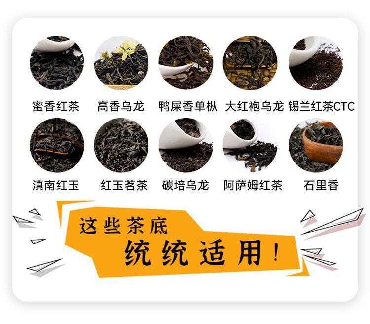 | Packaging specifications | Rock sugar syrup 1.2kg [universal syrup],Golden ice syrup 2.5kg [universal syrup],F60 fructose 2.5kg [general syrup],Lemongrass syrup 1.2kg [increases the flavor of drinks],Brown sugar syrup 1.1kg [for brown sugar pearls only],Roasted milk syrup 1.1kg [for roasted milk tea only],Lemon fruit honey 1.2kg [for lemonade only],Lemon fruit honey 2.5kg [for lemonade only],Pure sucrose flavored syrup 1kg,Spearmint flavored syrup 1kg,Blue orange flavored syrup 1kg,Red pomegranate flavored syrup 1kg,Phoenix duck fragrant dancong 250g,Ceylon black tea ctc250g,Jasmine maojian 500g |