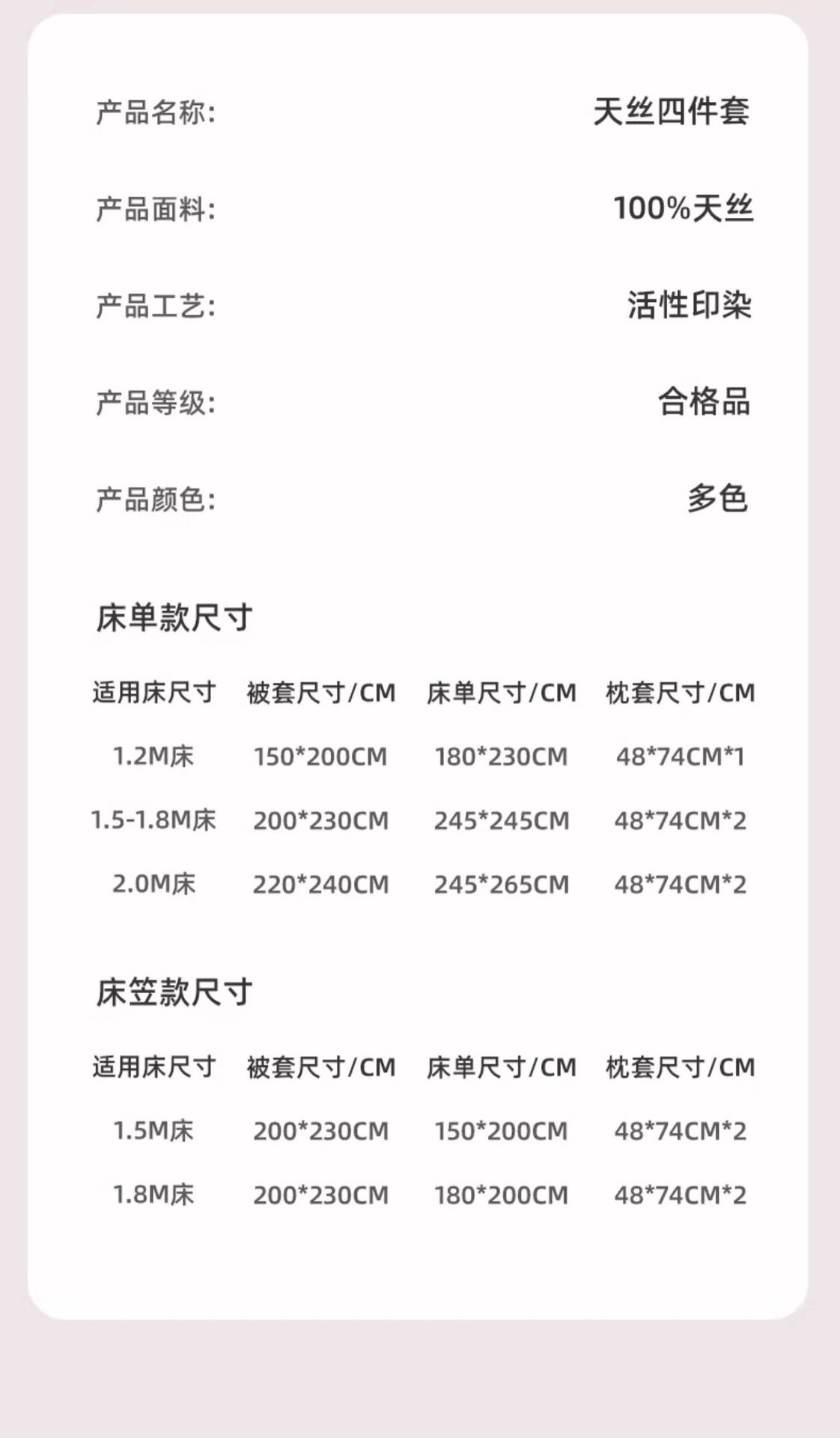 | Dimensions | 1.2m bed sheet three-piece set [quilt cover 150*200],1.5m bed sheet four-piece set [quilt cover 200*230],1.8m bed sheet four-piece set [quilt cover 200*230],2.0m bed sheet four-piece set [quilt cover 220*240],1.5m fitted sheet set of four [quilt cover 200*230],1.8m fitted sheet set of four [quilt cover 200*230],1.8m fitted sheet set of four [quilt cover 220*240],150*200 single quilt cover,200*230 single quilt cover,220*240 single quilt cover |
