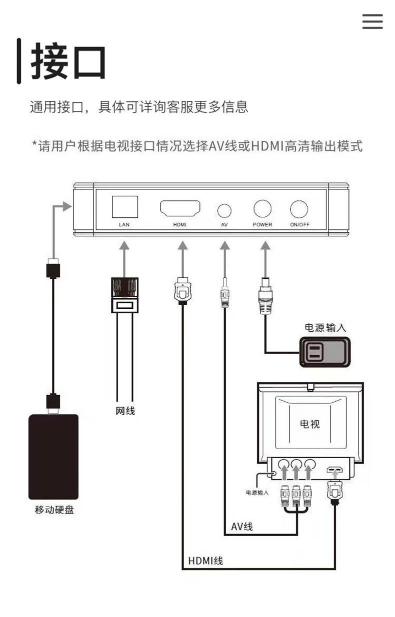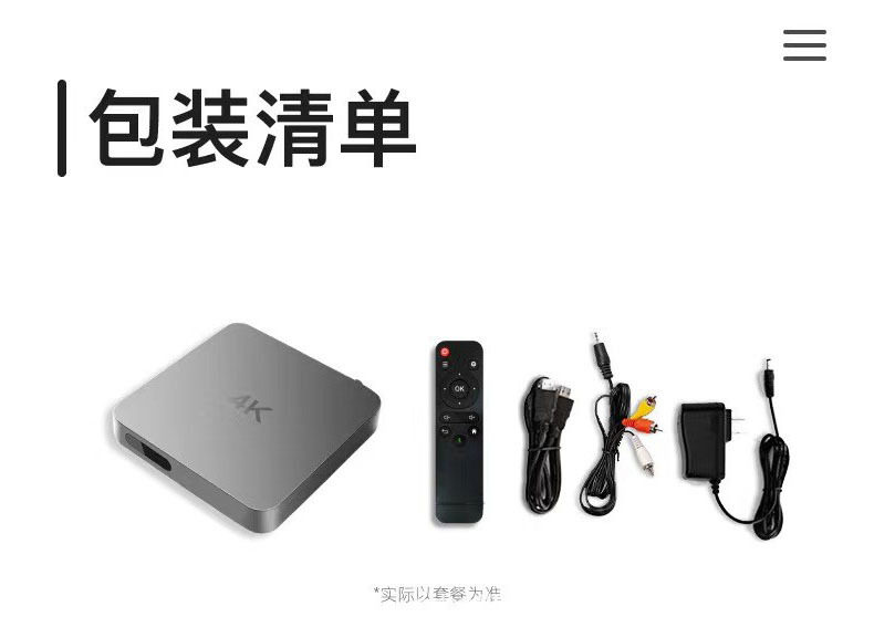 | Package list | Set-top box/power cord/hdmi high-definition cable/remote control/av three-color cable |